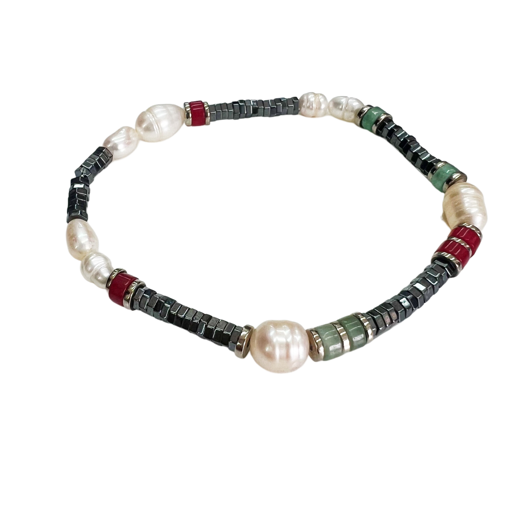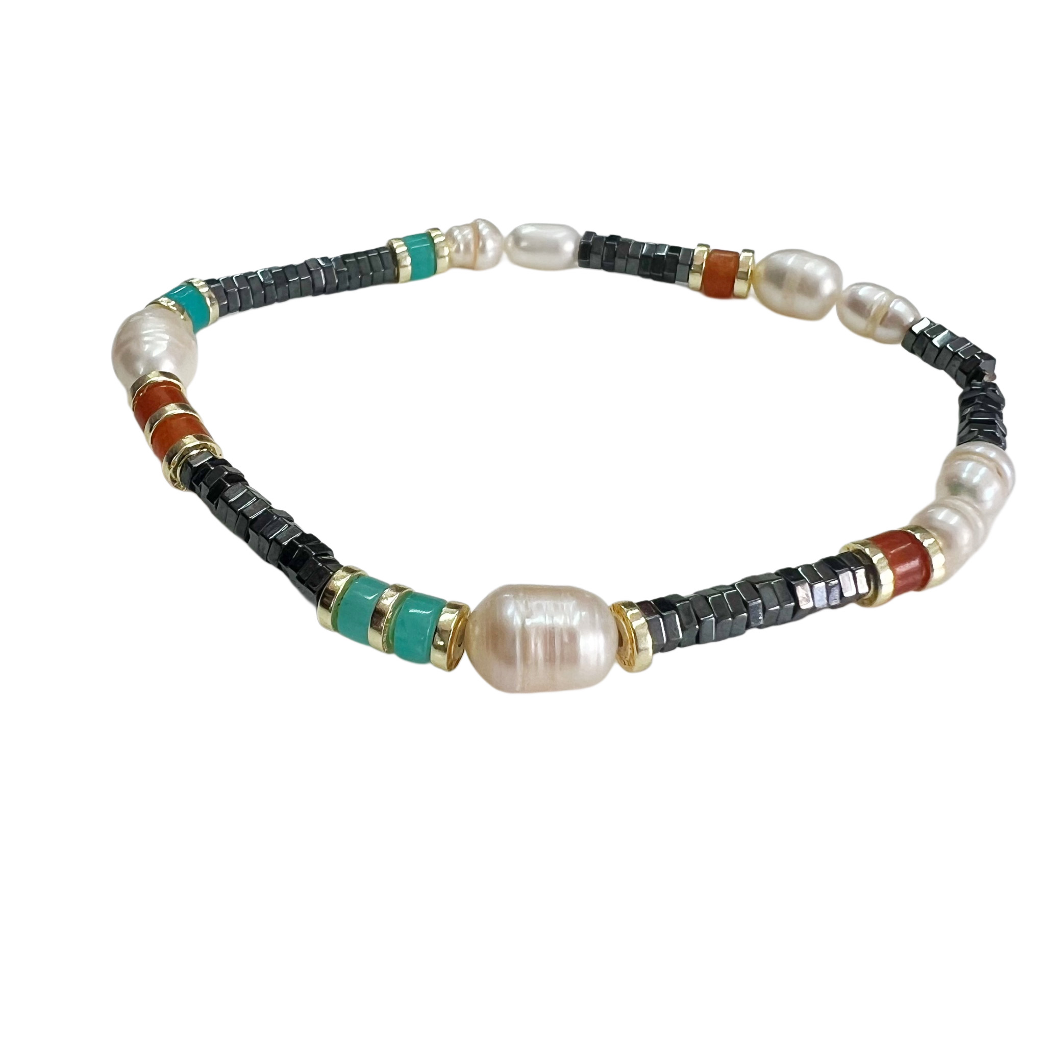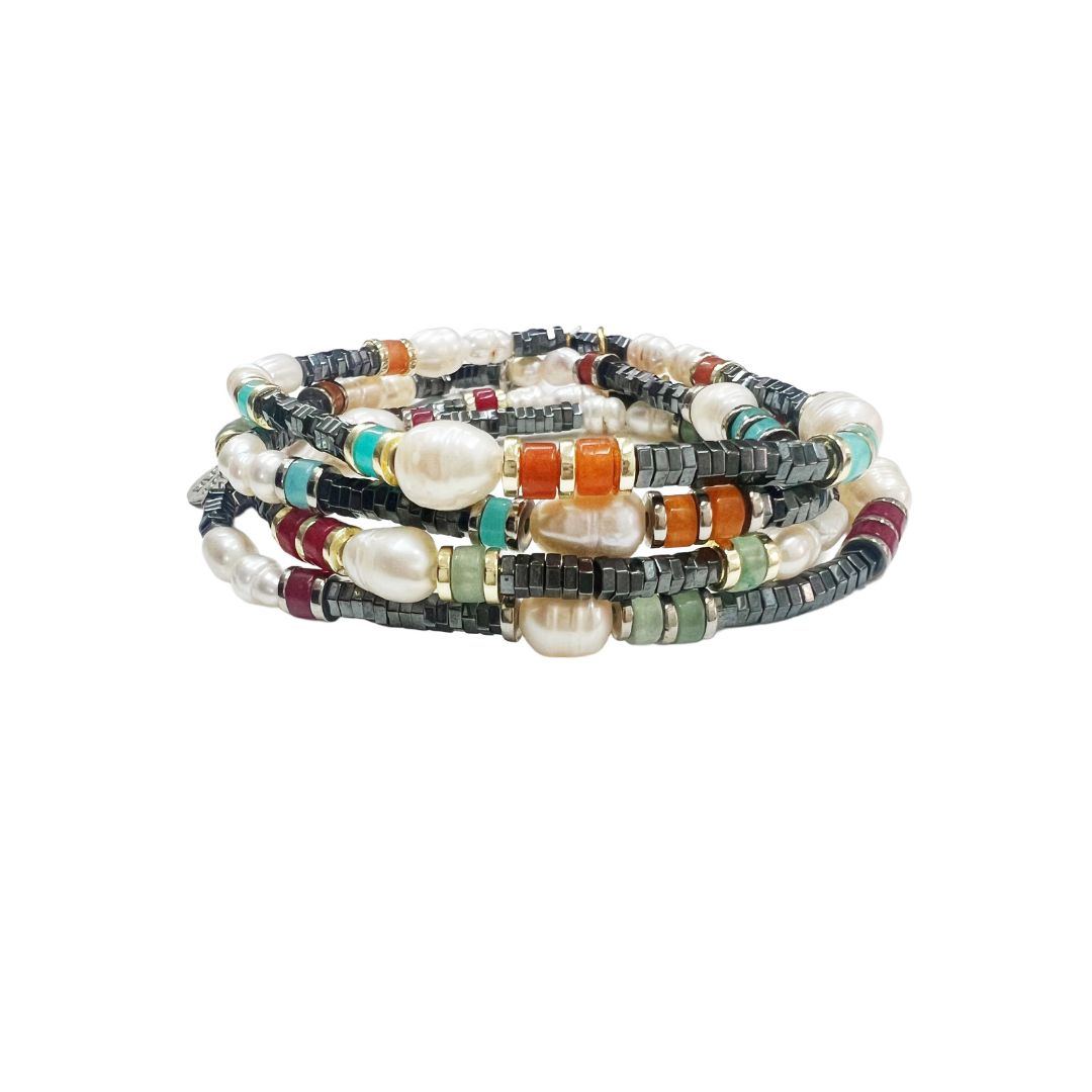 צמיד משגע עשוי חרוזי המטייט מנצנצים משולבים עם פנינים ואבני חן אמיתיות ומושחלים על חוט סיליקון עמיד ואיכותי.