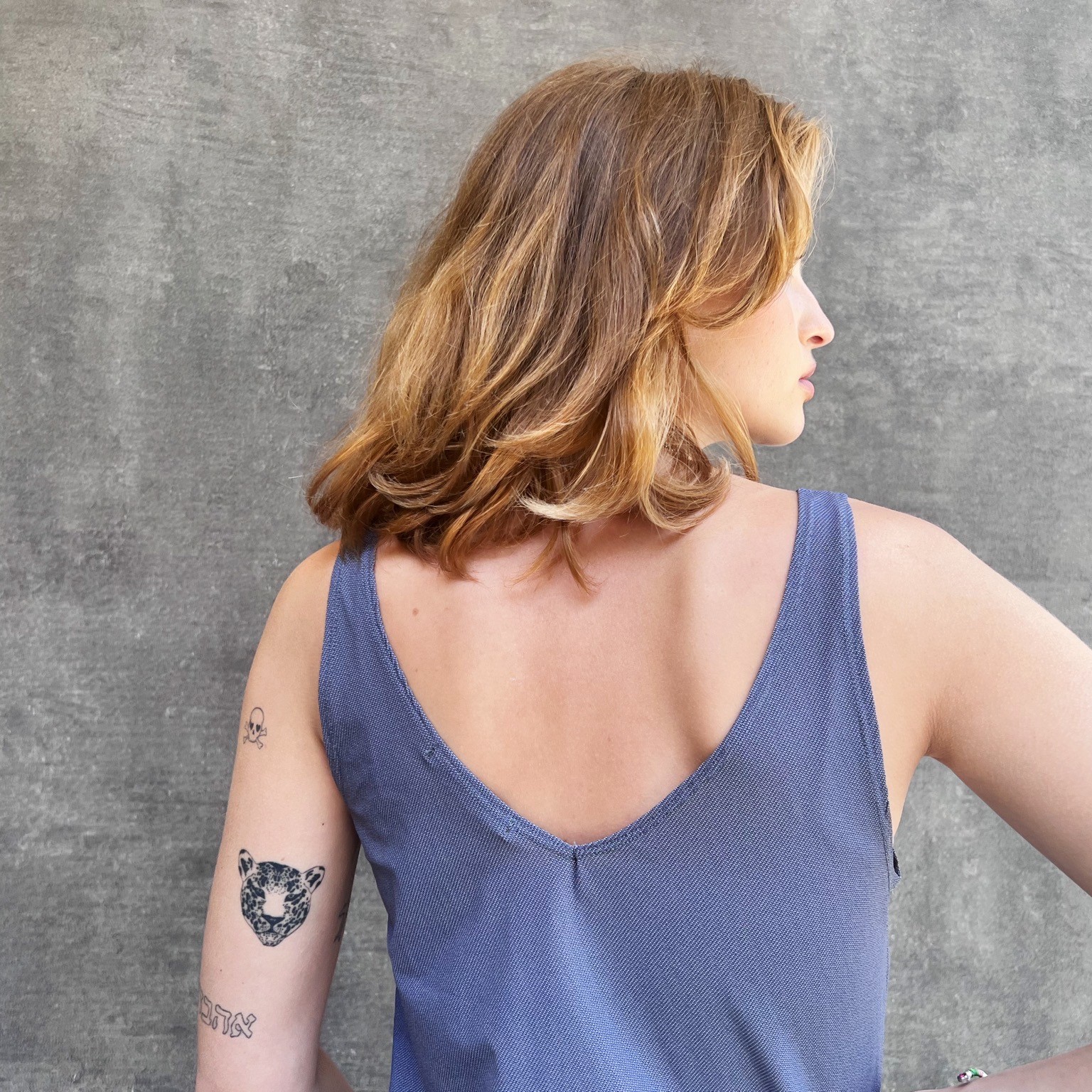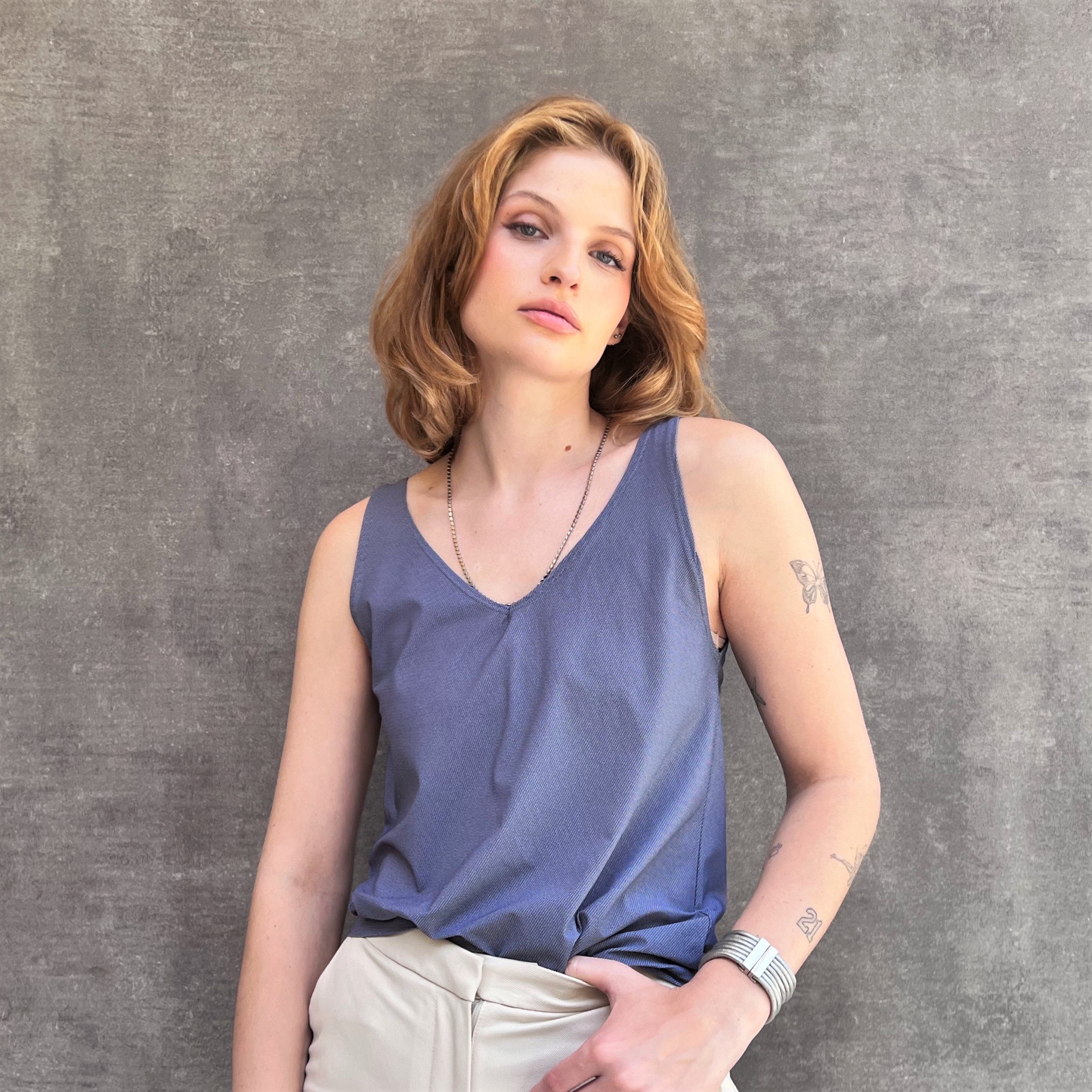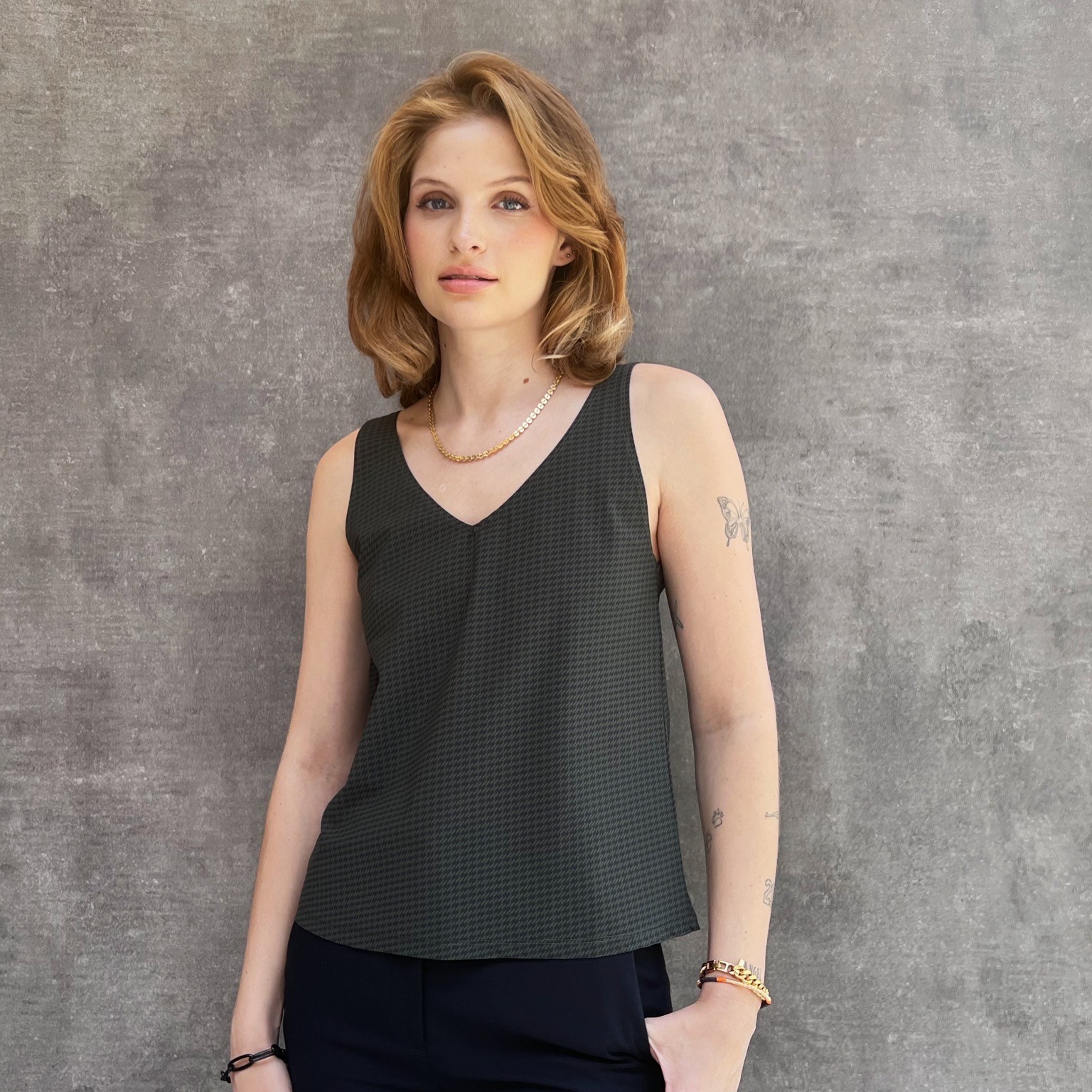 גופייה חתיכית ונינוחה עם צווארון נשפך מקולקציית “פעימה שניה”.