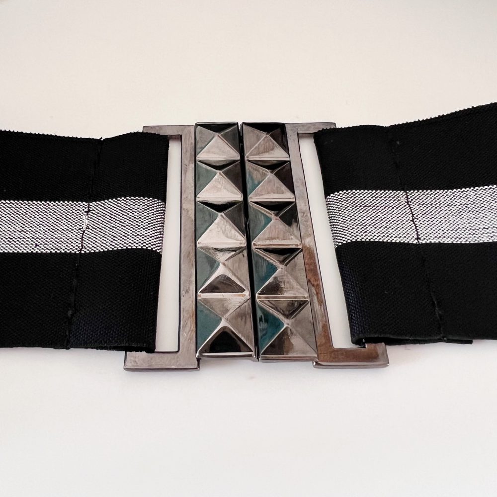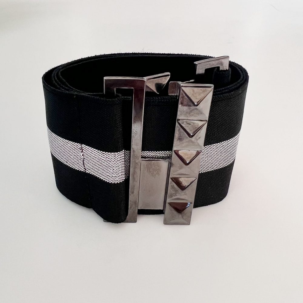 חגורה רחבה עשויה גומי איכותי בשחור משולב בכסף עם אבזם מושלם בצבע תואם.