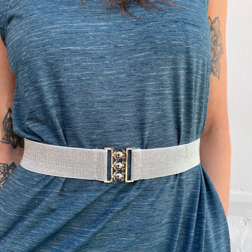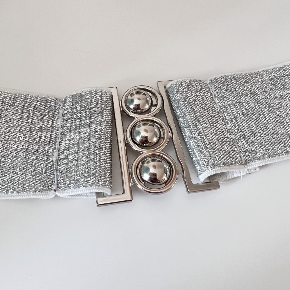 חגורה רחבה עשויה גומי איכותי בצבע כסף עדין בשילוב אבזם מעוצב בצבע כסוף.