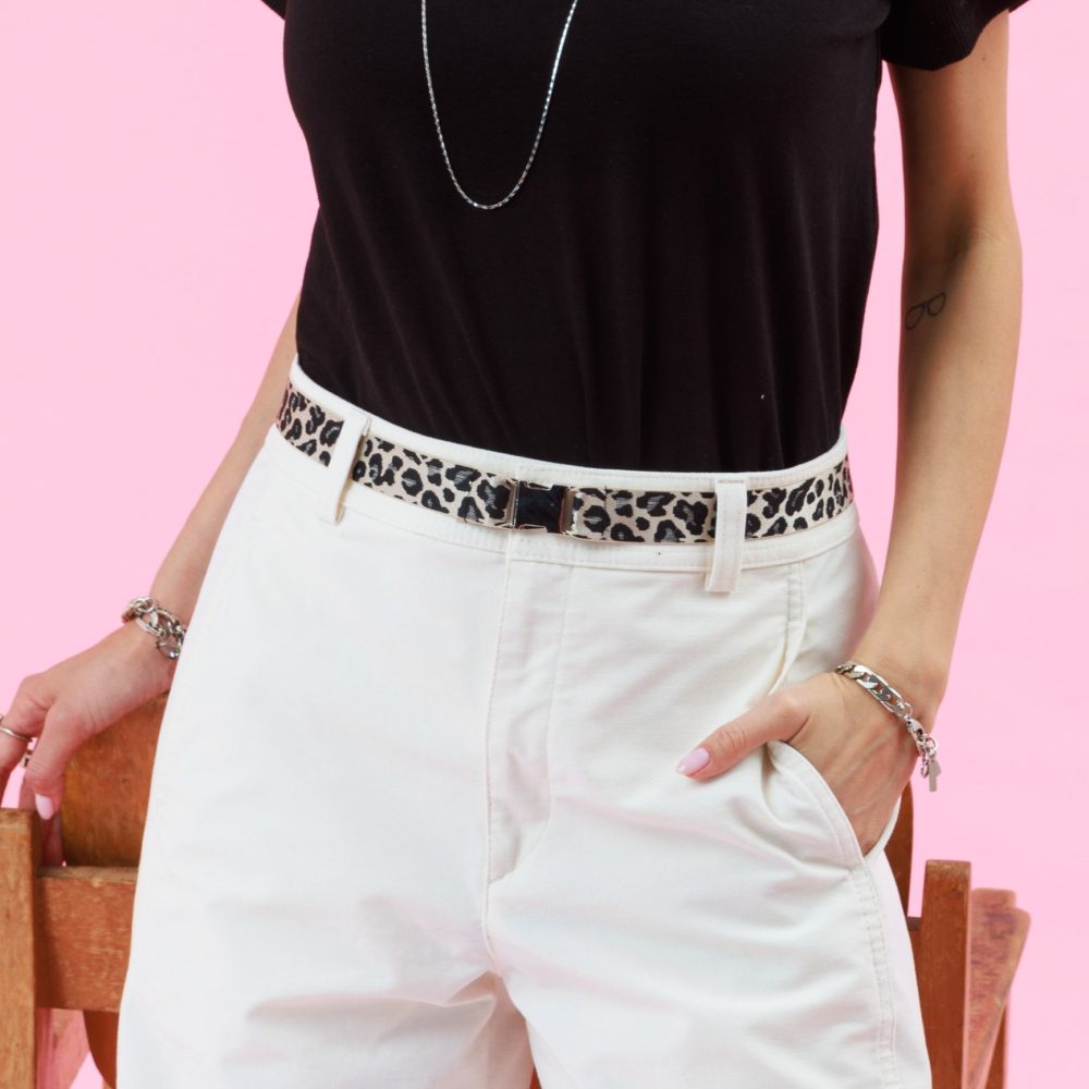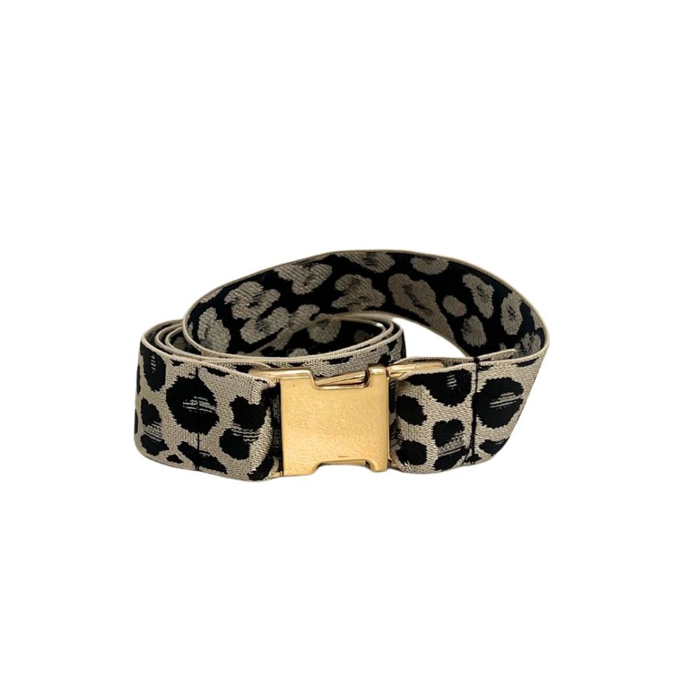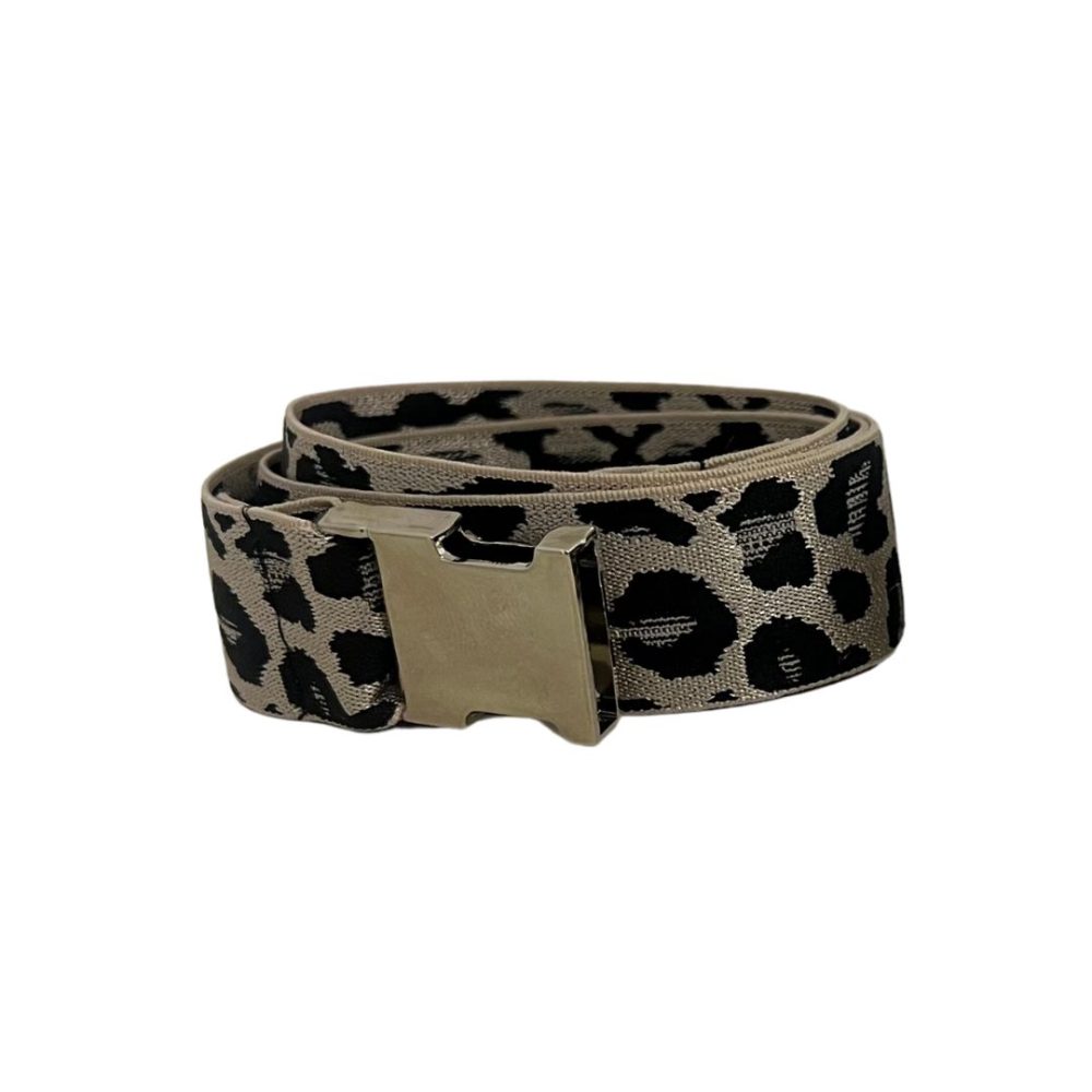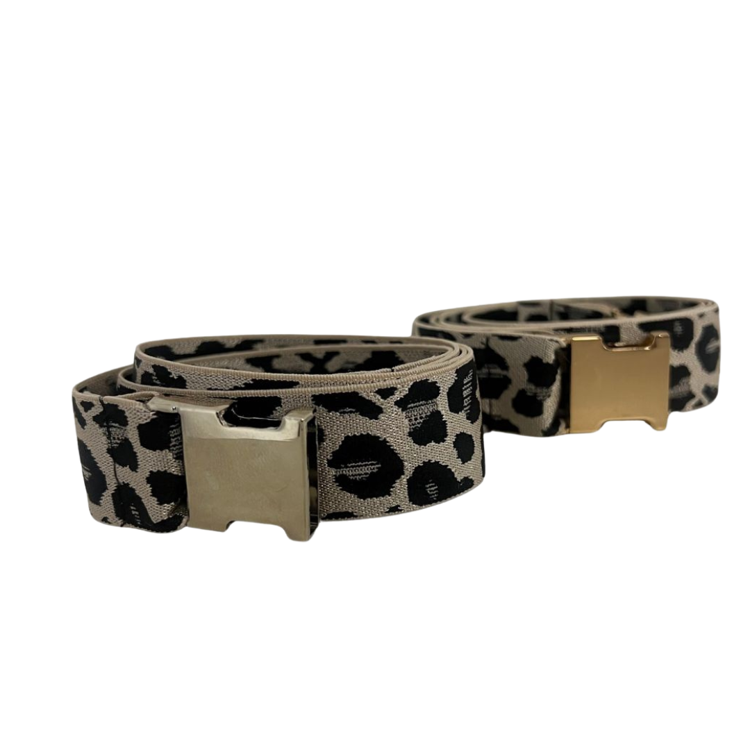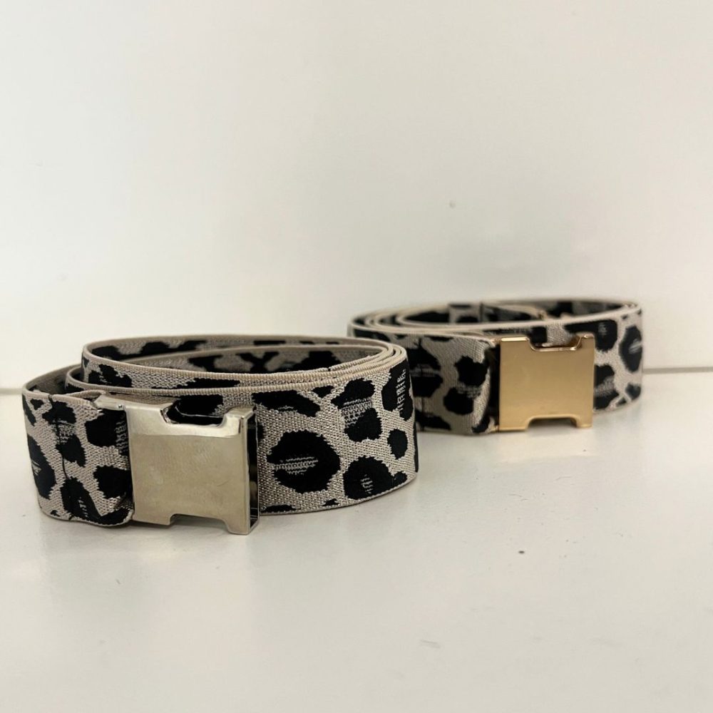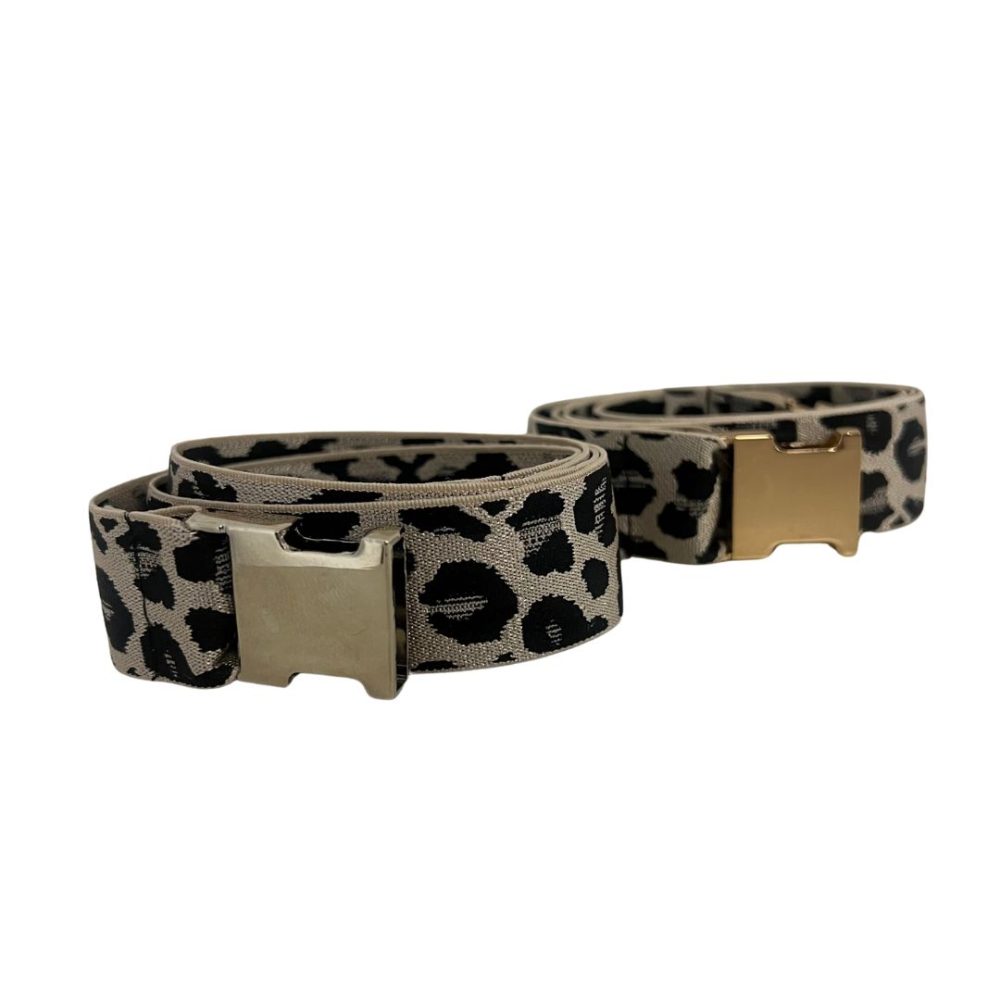 חגורה צרה עשויה גומי איכותי עם הדפס מנומר משגע מגיעה עם אבזם זהב או כסף.
