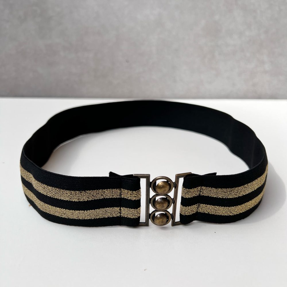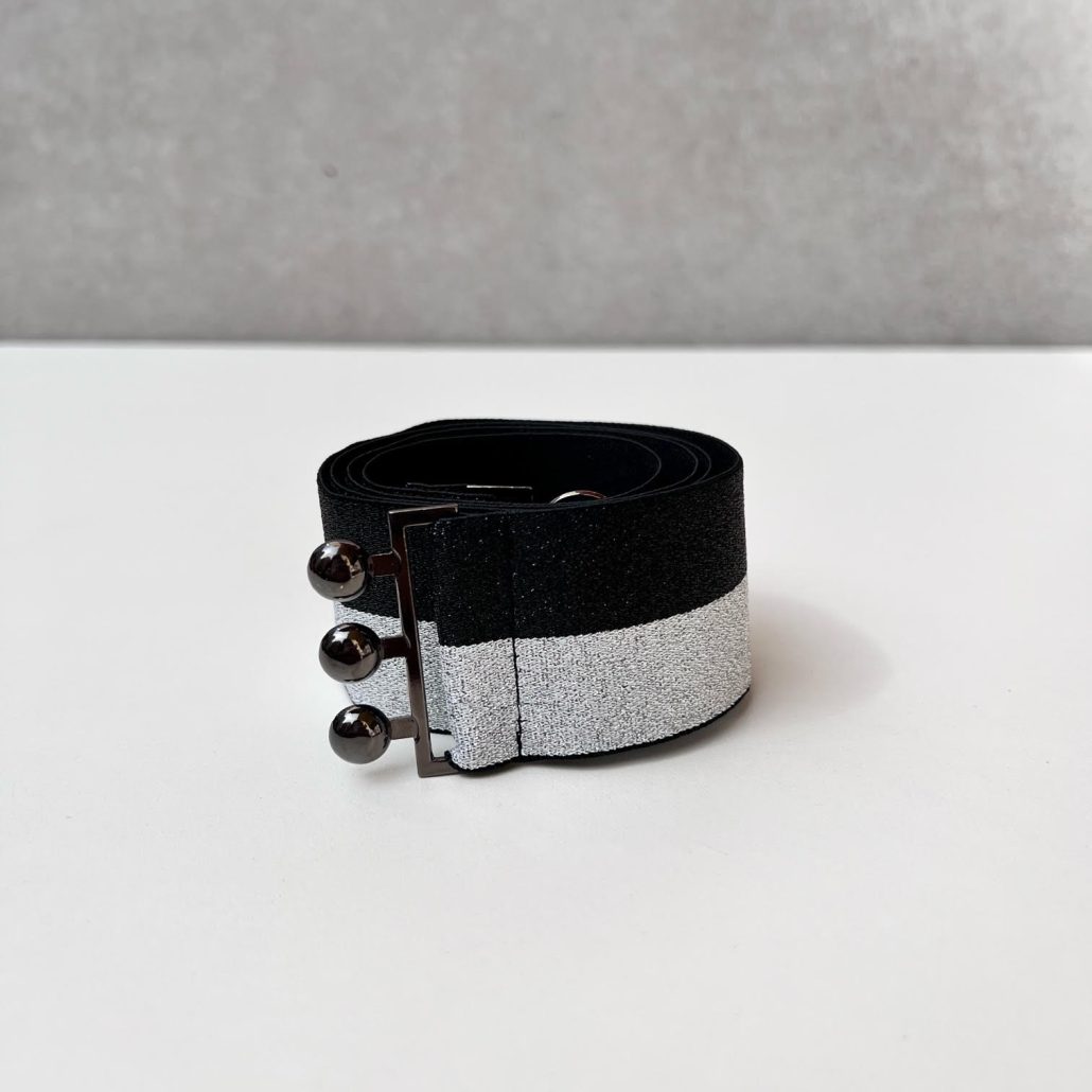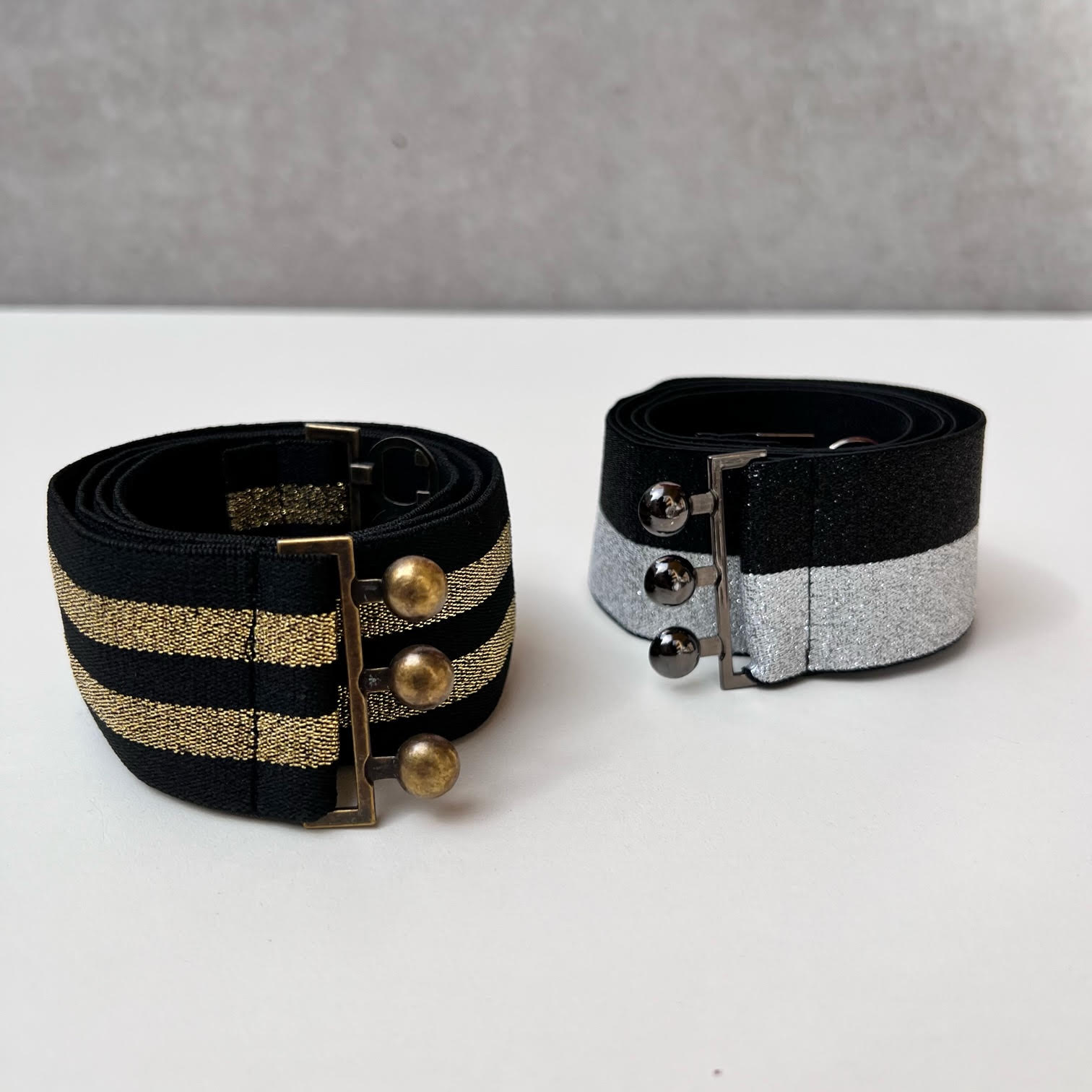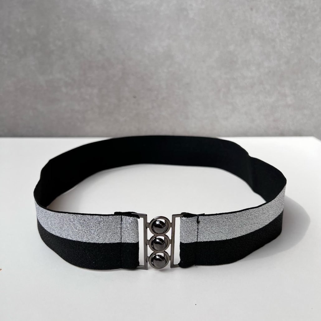 חגורה רחבה עשויה גומי איכותי בשחור משולב בזהב או בכסף עם אבזם מושלם בצבע תואם.
