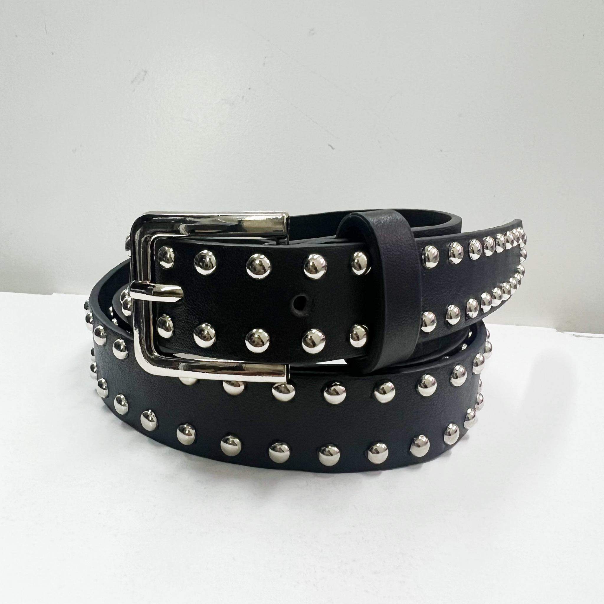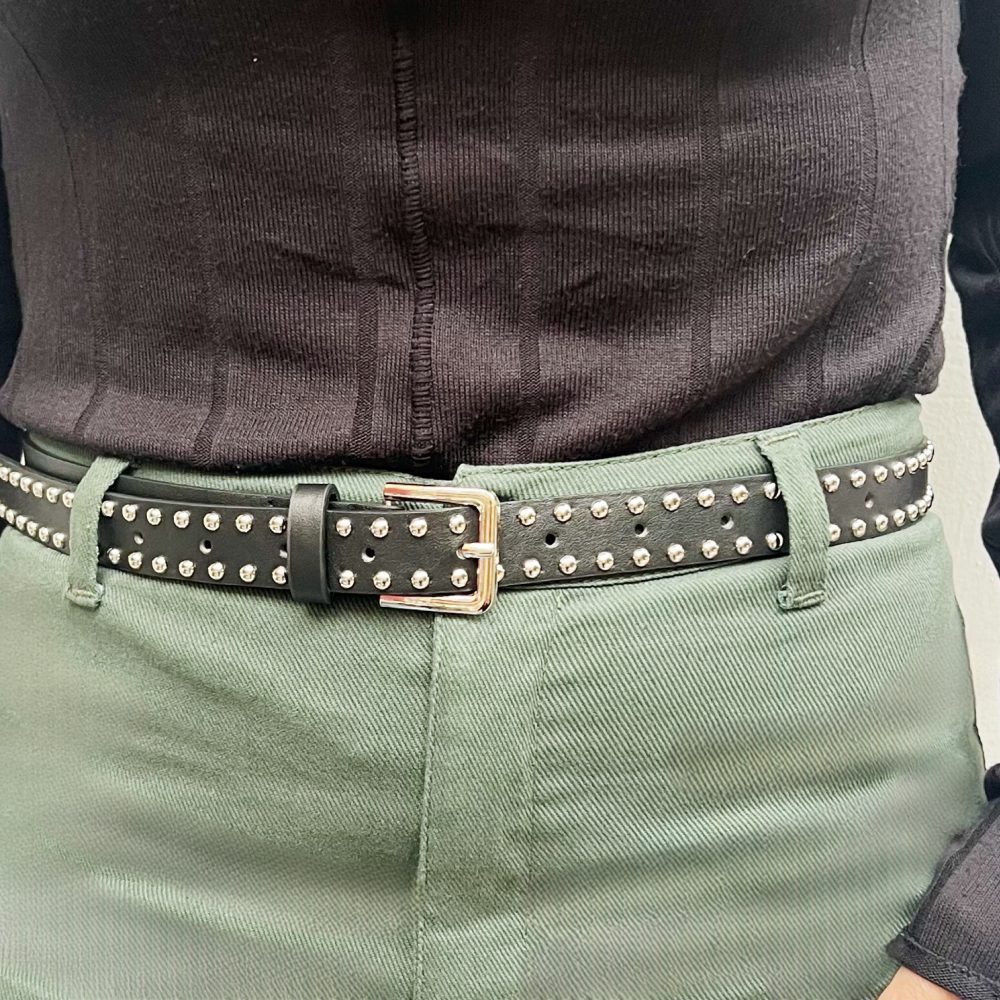 חגורה מטריפה עשויה דמוי עור איכותי עם ניטים מושחרים לכל האורך עם אבזם קלאסי באותו ציפוי.