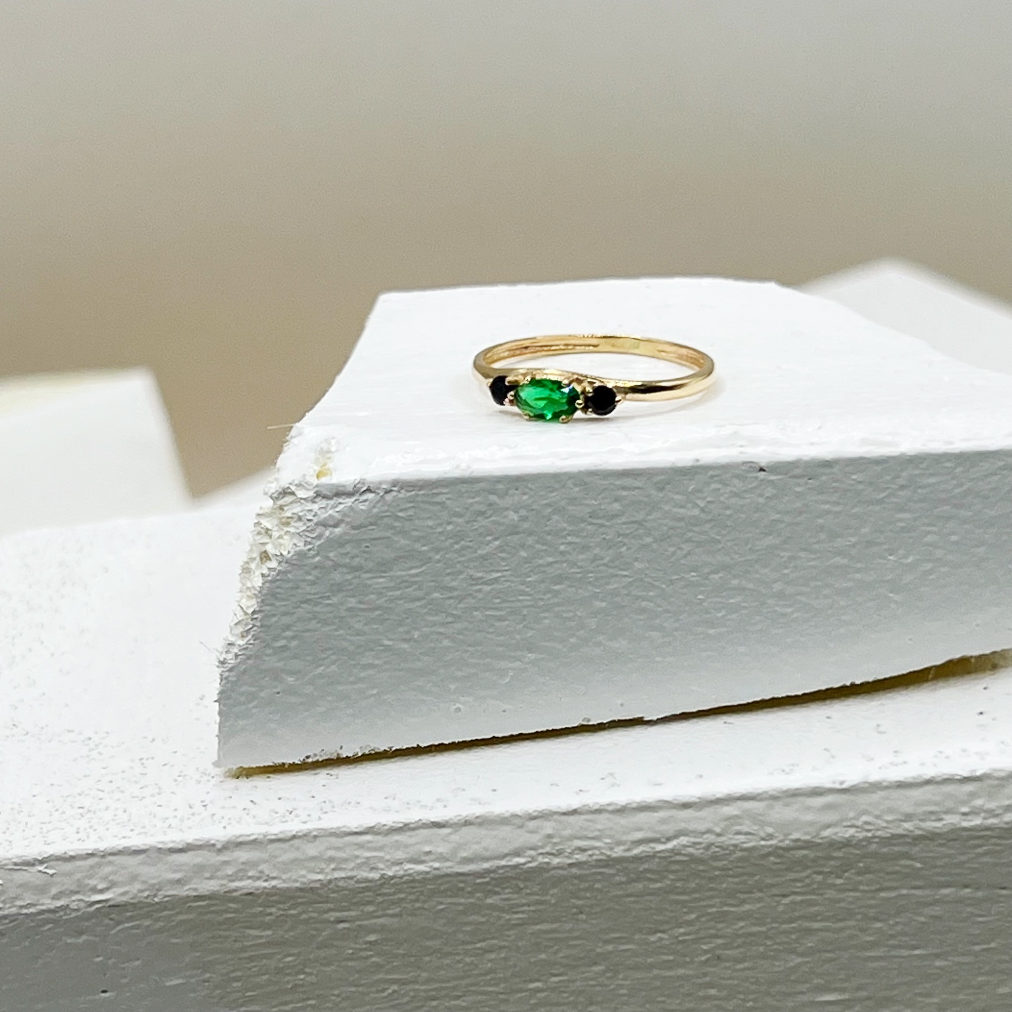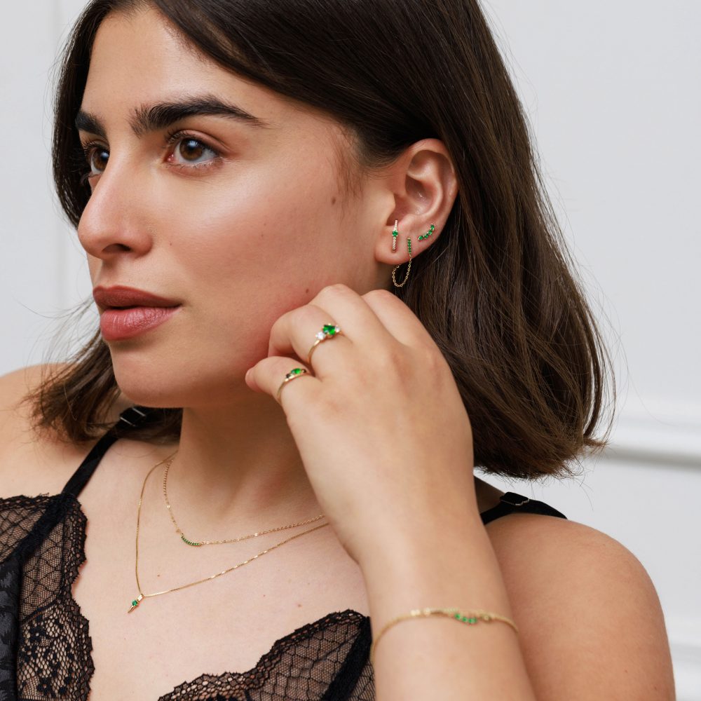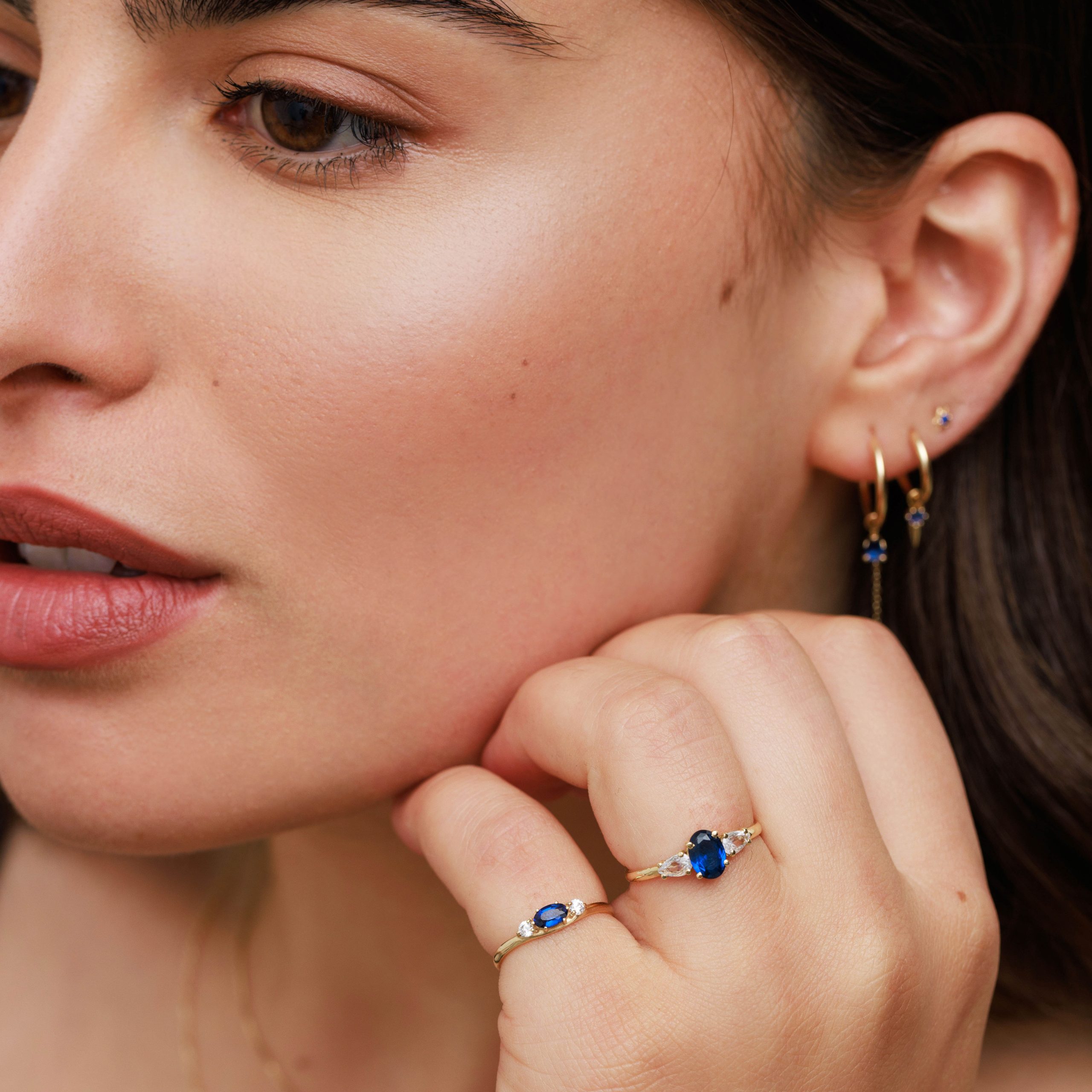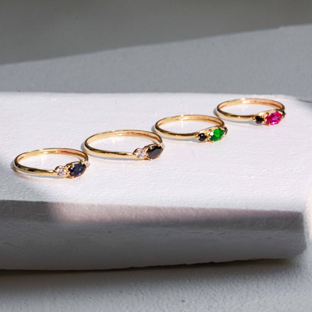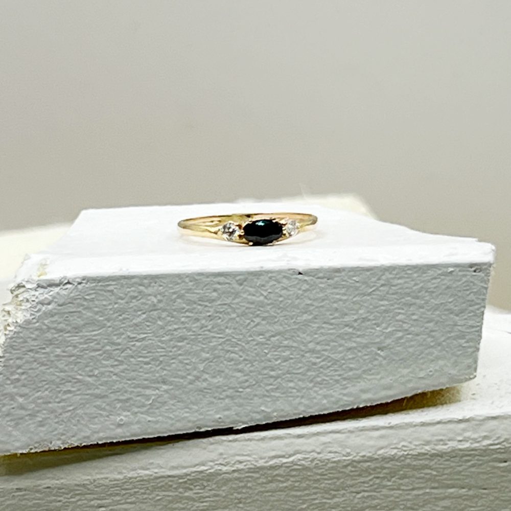 טבעת עדינה ומעוצבת בקווים רכים ושיקיים, עם אבן מרקיזה מרכזית מהממת, ולצידה שתי אבנים עגולות קטנטנות שמוסיפות ברק מדויק.
