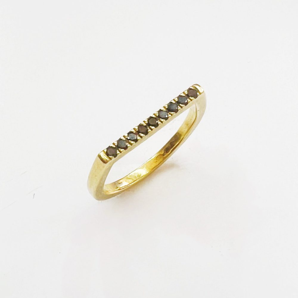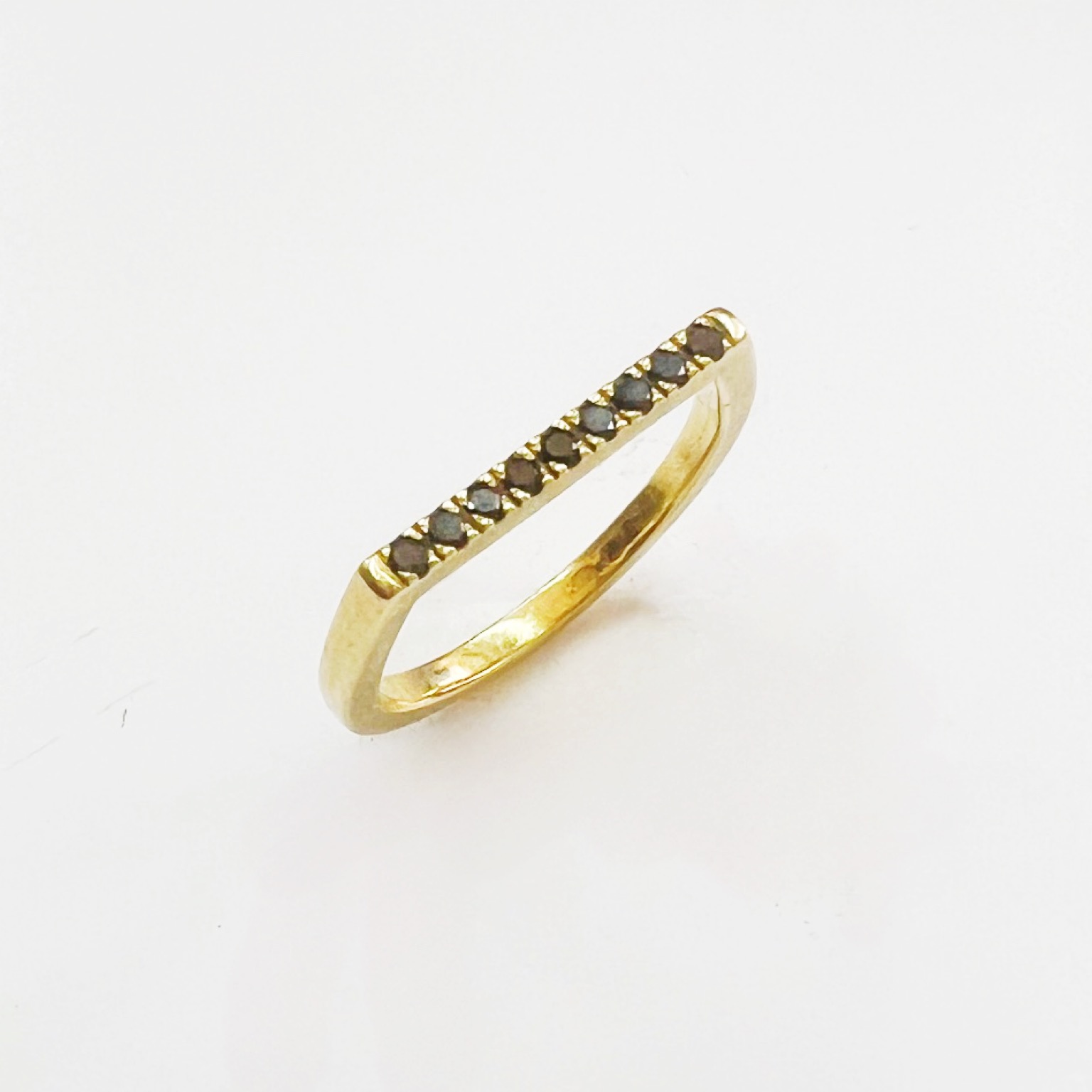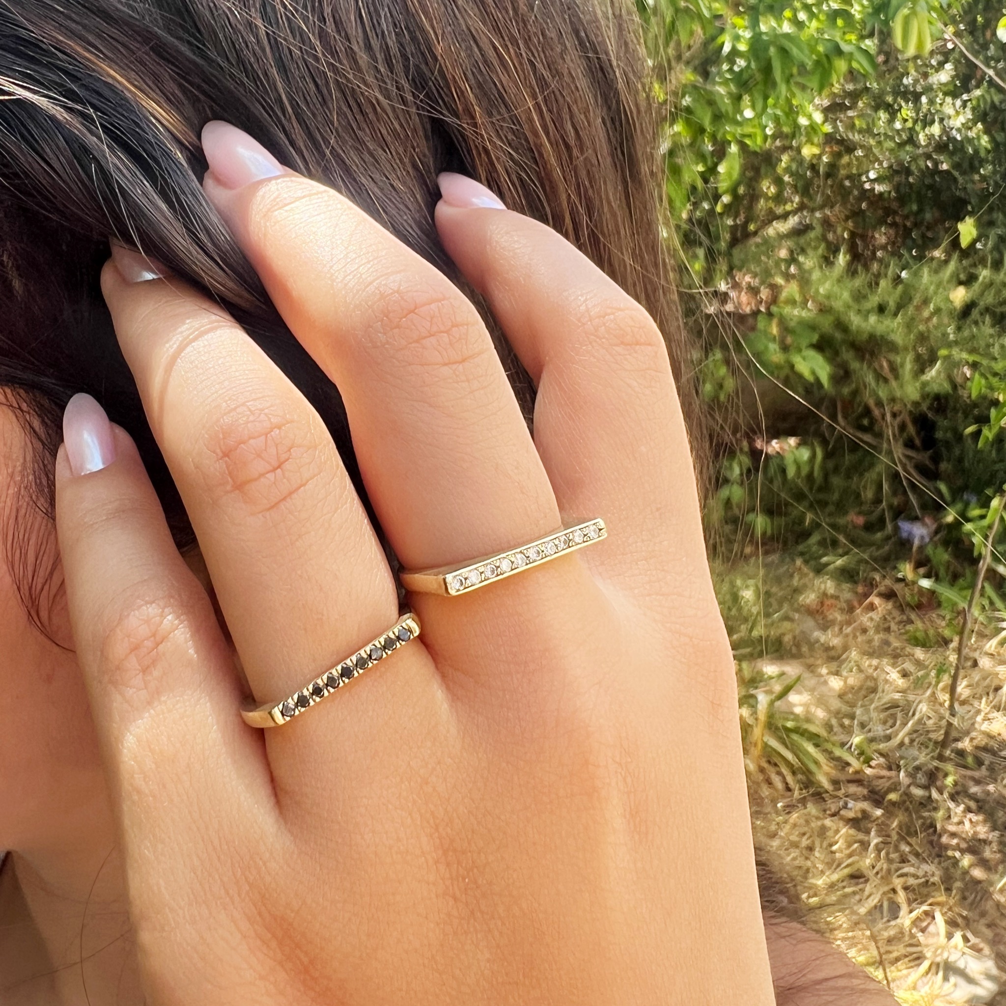 טבעת בעיצוב קלאסי ועכשווי דקה ומרשימה עשויה זהב 14 קראט משובצת תשעה זרקונים שחורים עדינים משגעים.