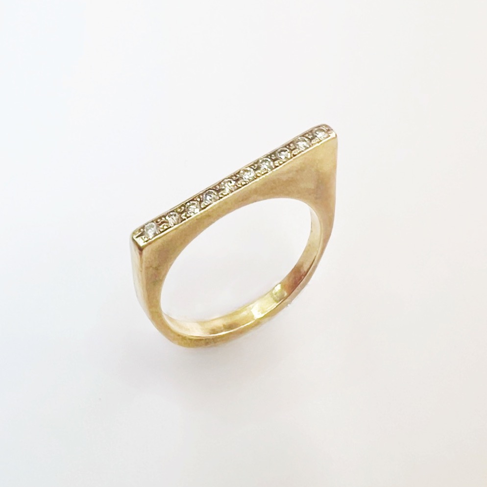 טבעת בעיצוב א-סימטרי קלאסי ועכשווי דקה ומרשימה עשויה זהב 14 קראט משובצת עשרה זרקונים או יהלומים עדינים משגעים.(אפשר לבחור באפשרויות – המחיר בהתאם)