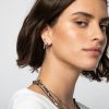 עגיל חישוק בקוטר 1.5 ס”מ משובץ באבני קריסטל שחורות, עגיל צמוד עם תליון שפיץ משובץ אבנים שחורות ועגיל צמוד עדין משובץ באבן קריסטל שחורה להשלמת המראה.