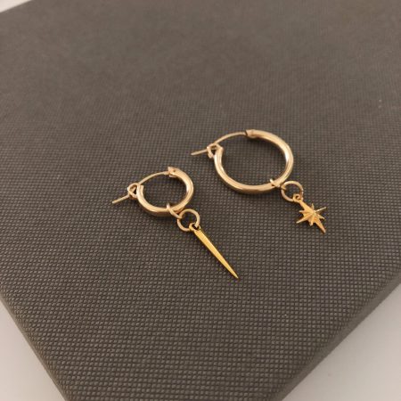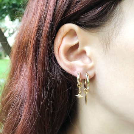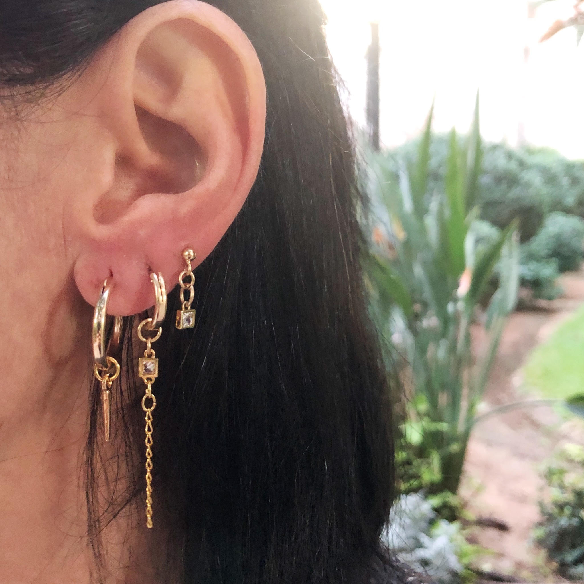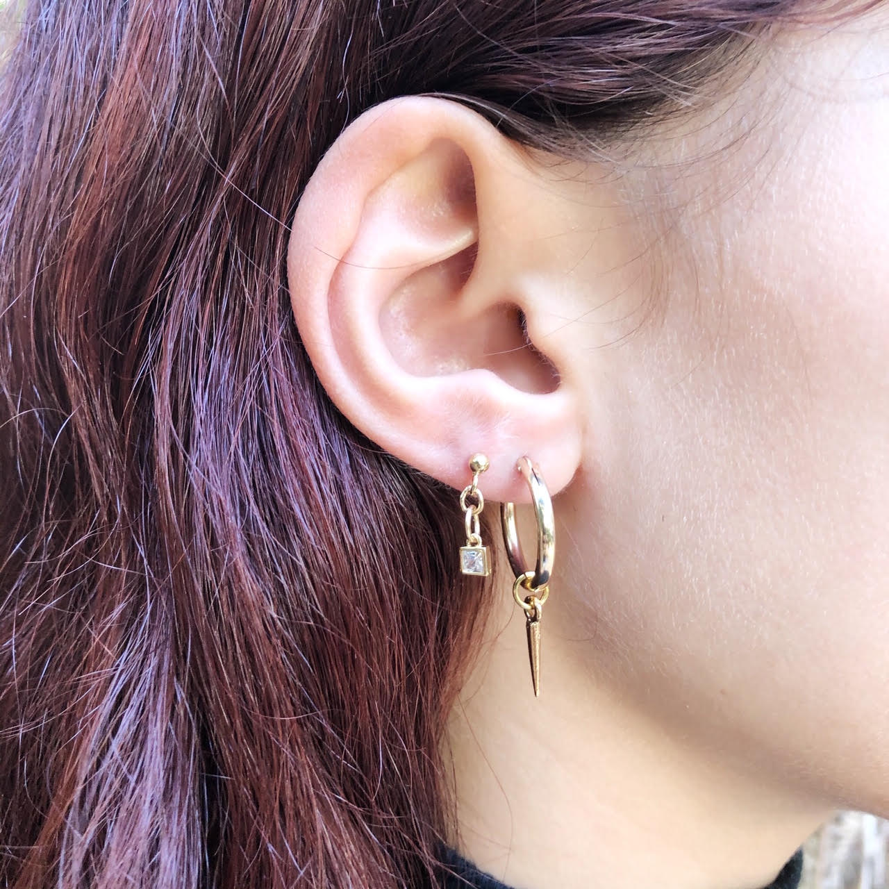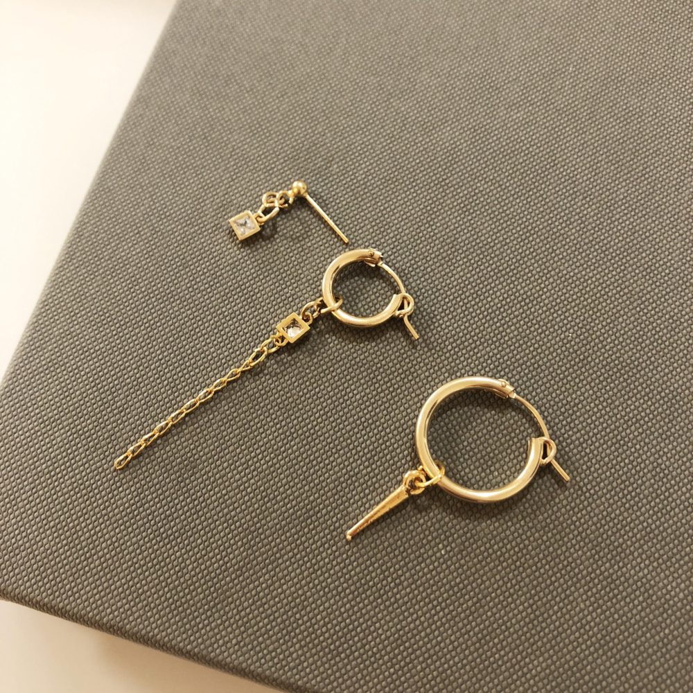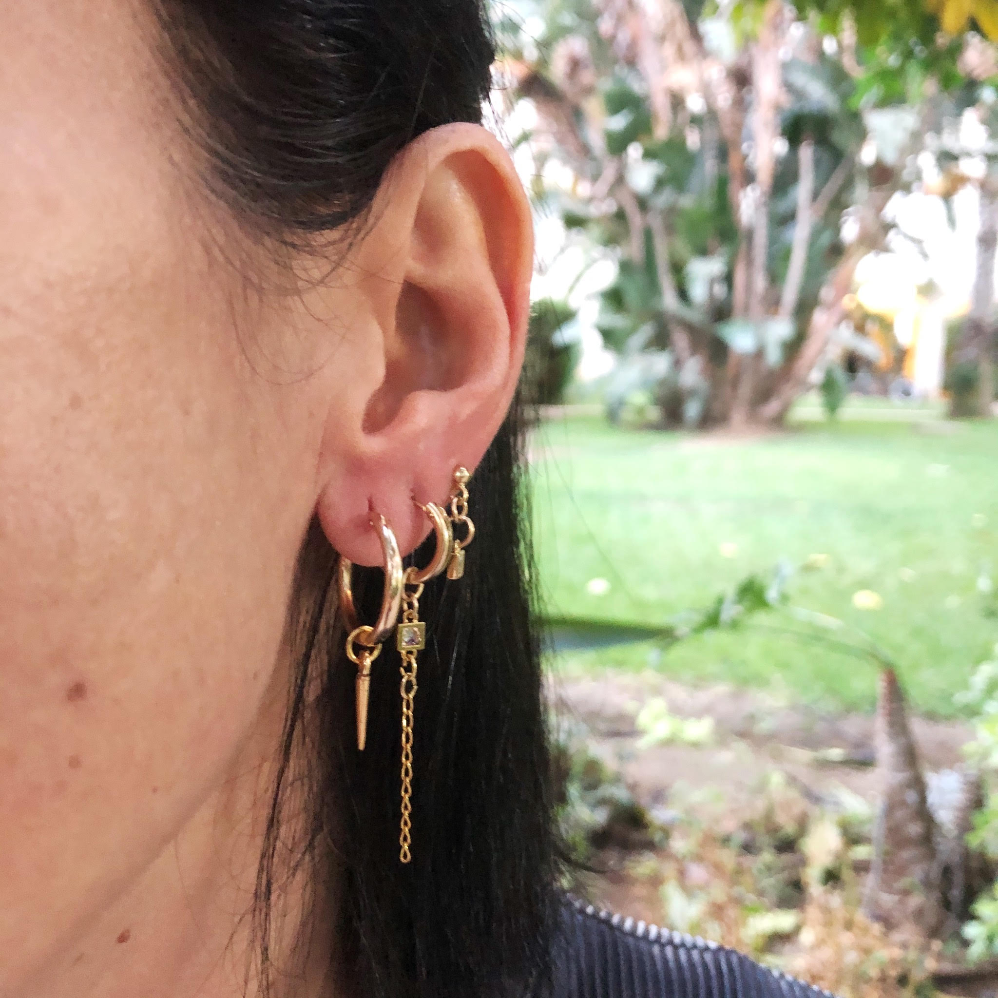מכיל שלושה עגילים שונים בשלושה גדלים .חישוק בקוטר 1.7 ס”מ עם תליון  שפיץ, חישוק בקוטר 1.3 ס”מ עם תליון ריבוע משובץ באבן קריסטל, ועגיל ריבוע עם קריסטל קטן.