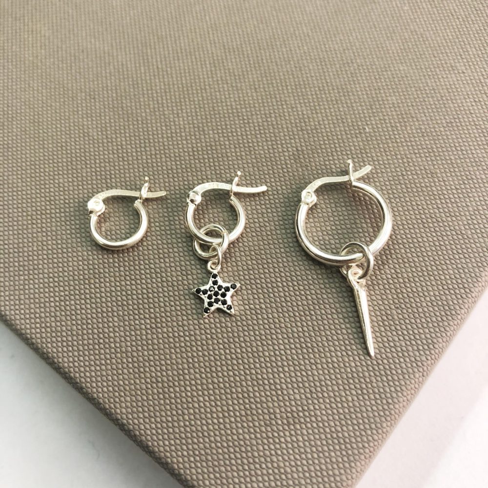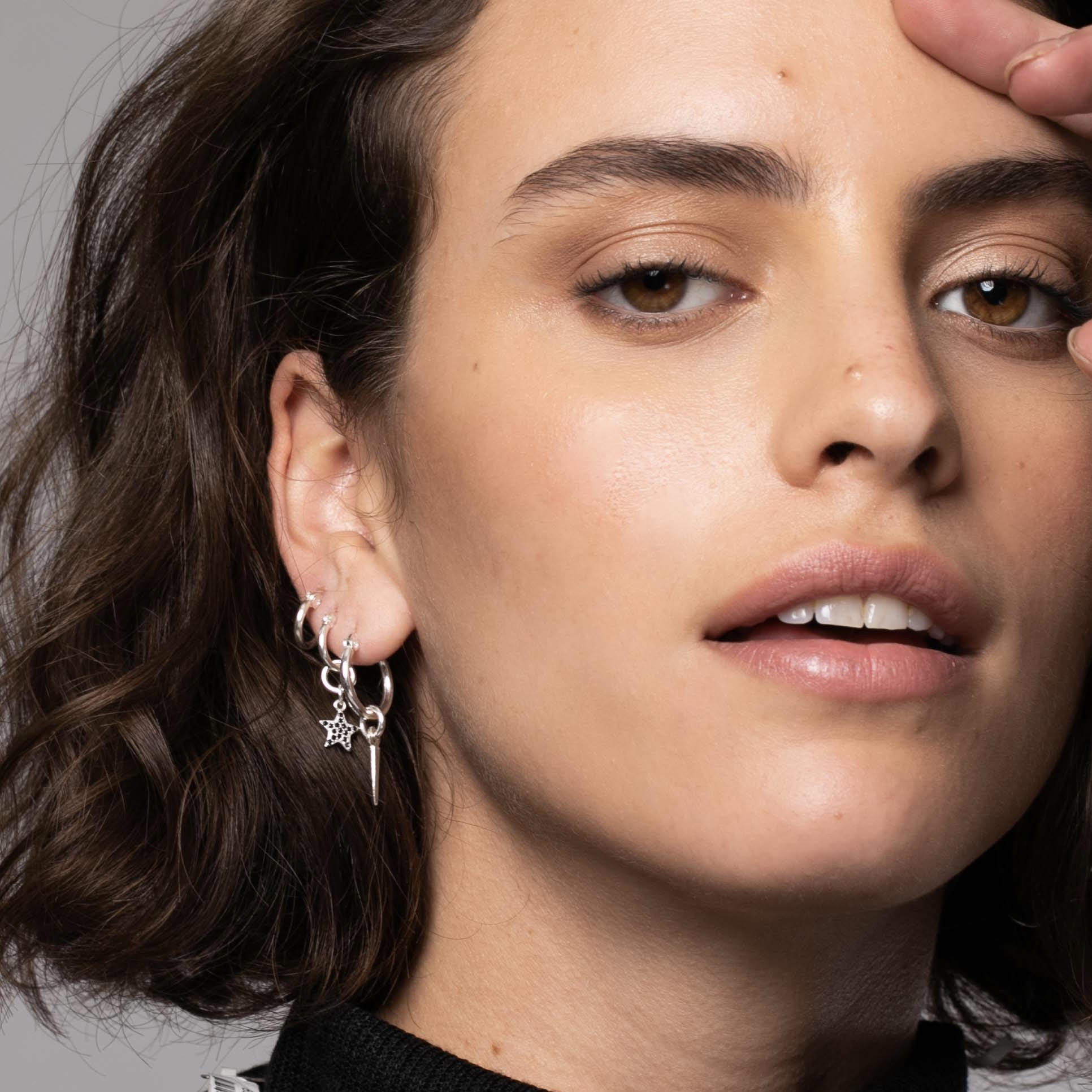 עגיל חישוק בקוטר 1.5 ס”מ עליו תלוי תליו שפיץ עדין, עגיל חישוק בקוטר 1 ס”מ עליו תליון כוכב משובץ באבני קריסטל שחורות  ועגיל חישוק נוסף קטן להשלמת הלוק.