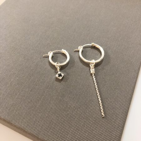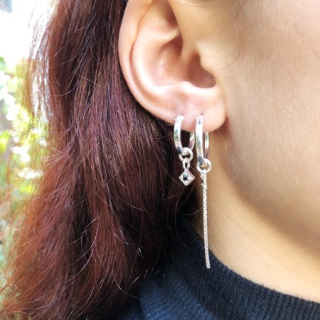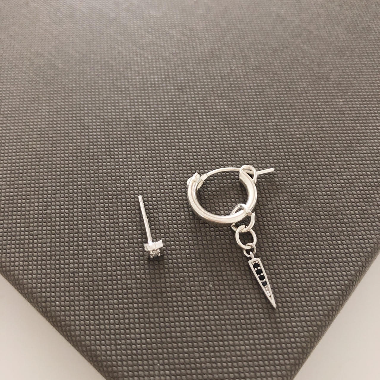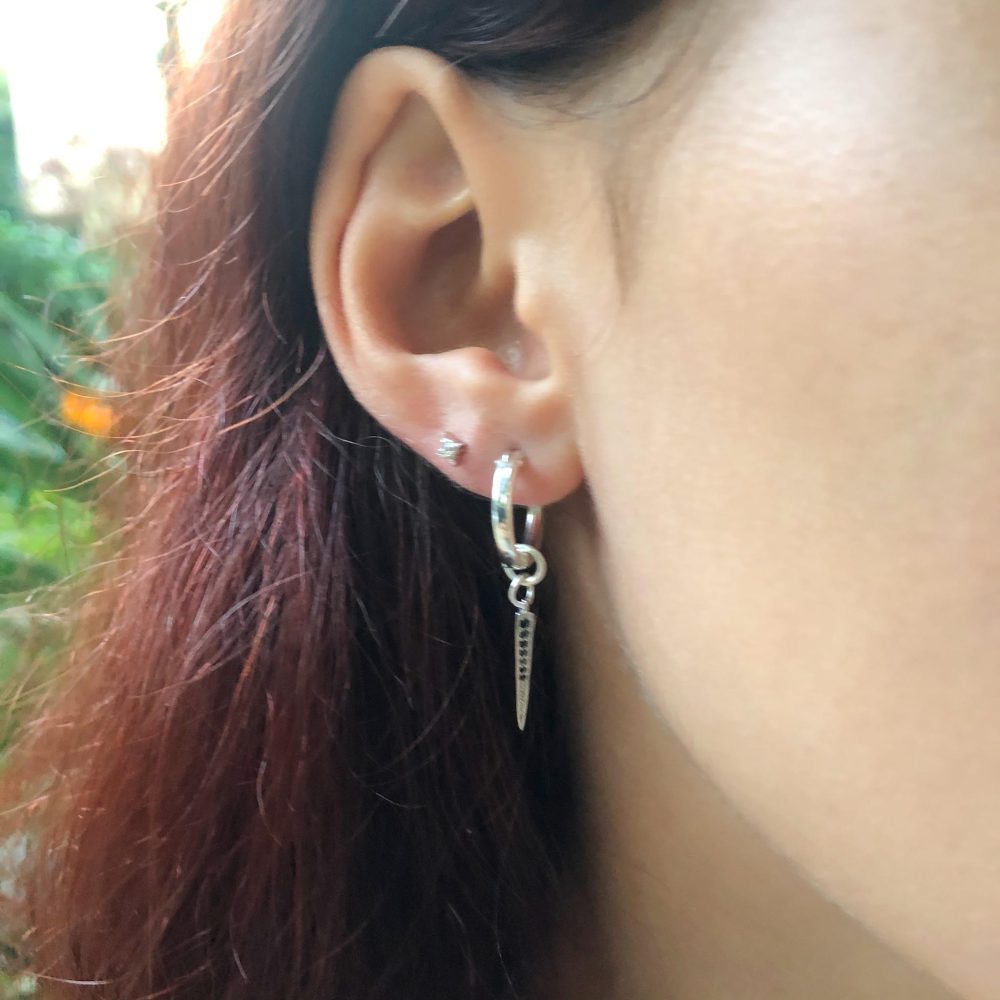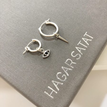 עגיל חישוק בקוטר 1.3 ס”מ עליו תלוי תליון שפיץ מהמם משובץ אבנים שחורות ועגיל כוכב צמוד משובץ באבן קריסטל עדינה.