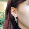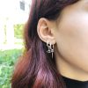 מכיל ששלושה עגילים שונים . עגיל חישוק בקוטר כ1.7 ס”מ עם תליון שפיץ והשני חישוק בקוטר כ1.5 ס”מ עם תליון עין כסוף משובץ באבן שחורה ועוד עגיל חישוק קטן משובץ באבני קריסטל בהירות.