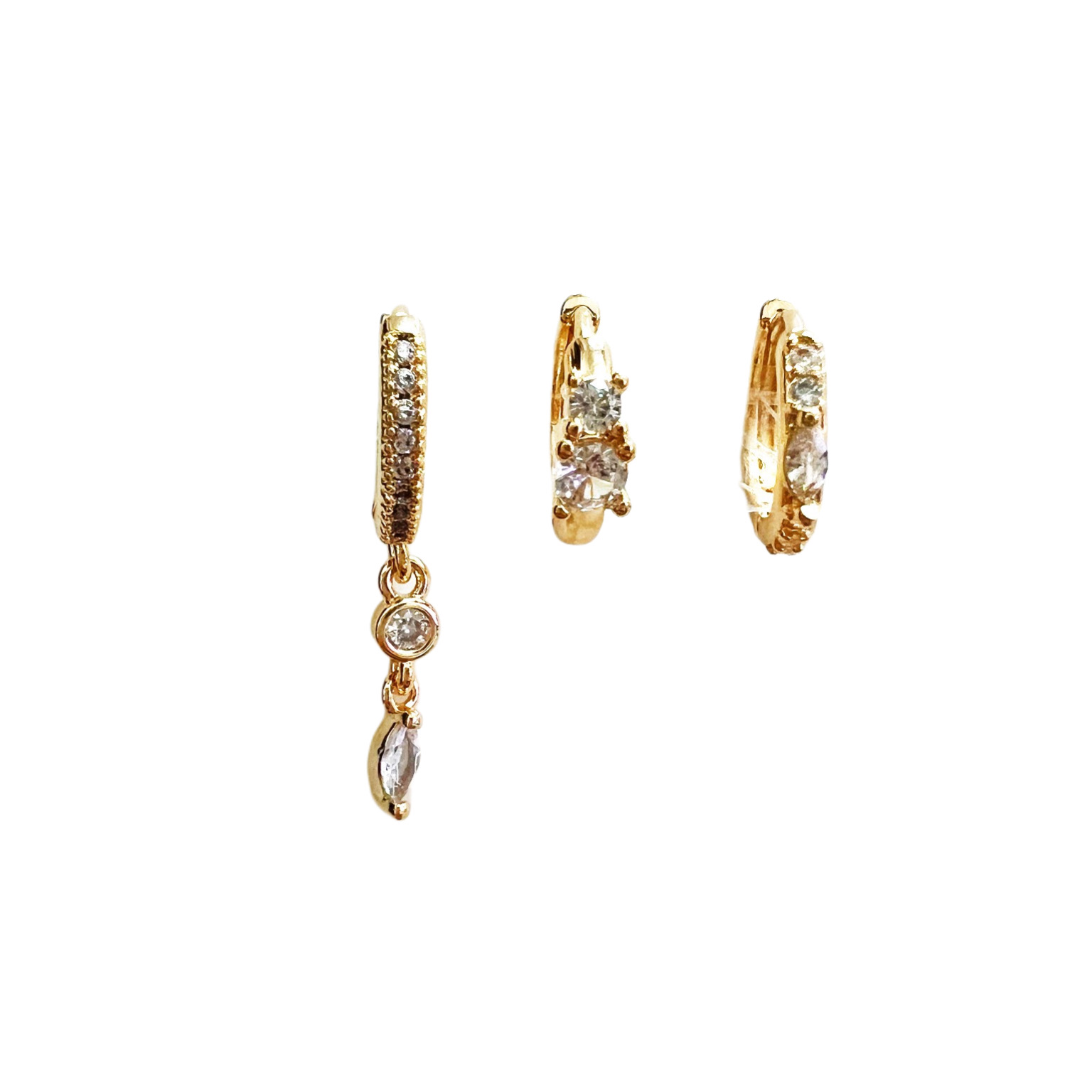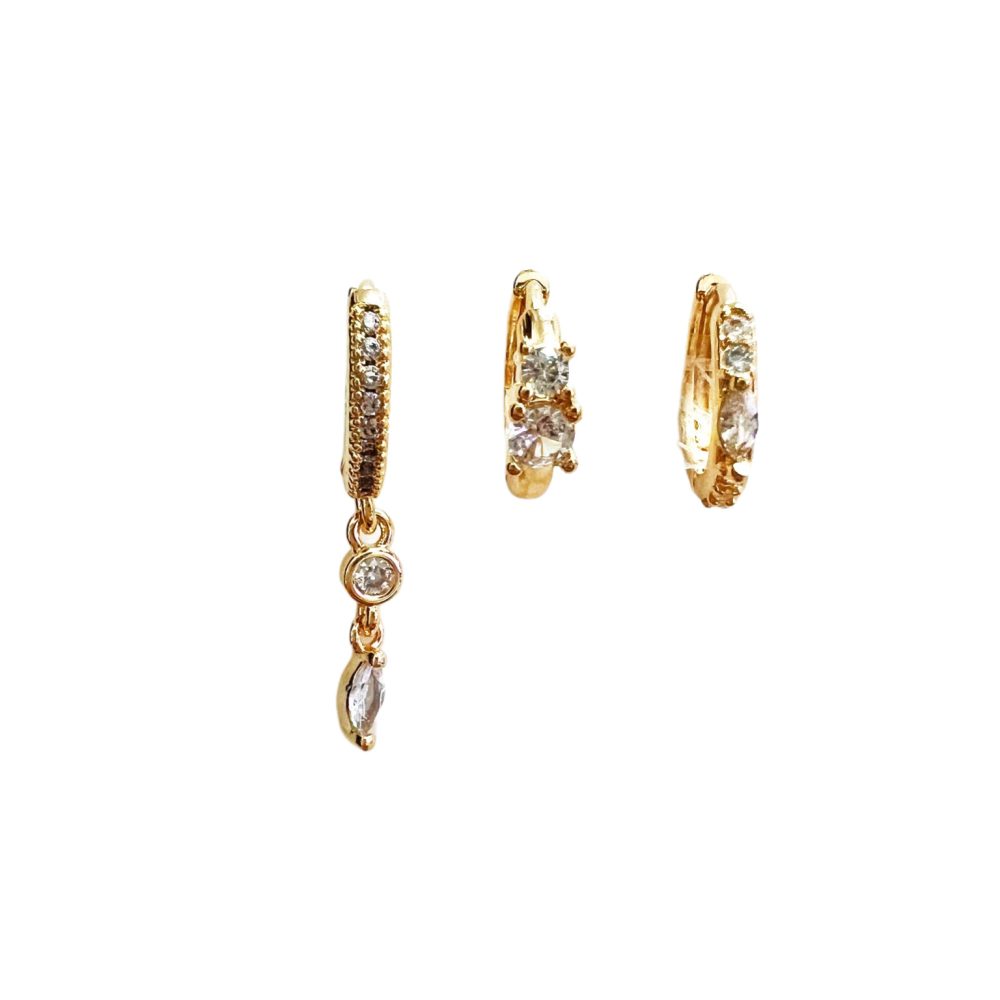 עגיל חישוק בקוטר של כ 1.2 ס”מ משובץ אבני קריסטל מרהיבות, עליו תלוי תליון של שני בתי אבן משובצים.