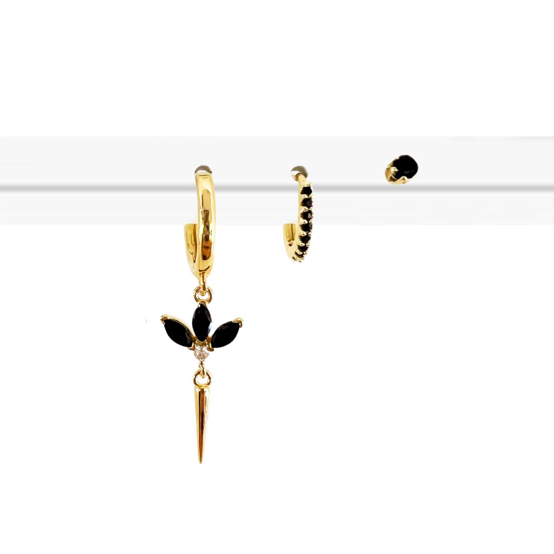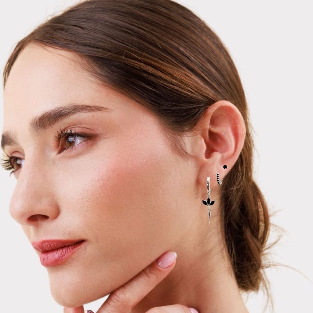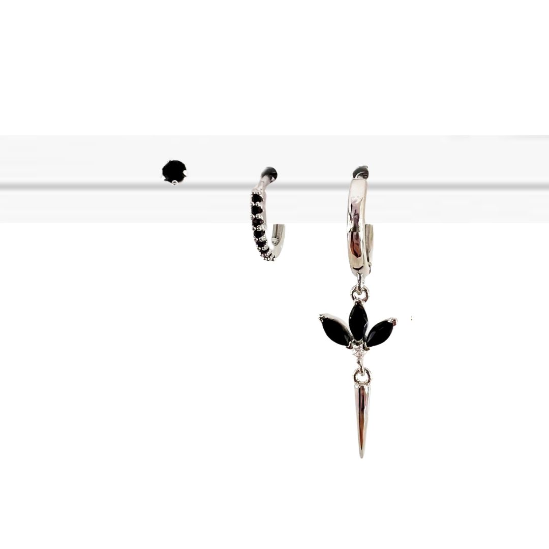 עגיל חישוק בקוטר של כ 1ס”מ עליו תלוי תליון של פרח מהמם משובץ 3 אבני קריסטל שחורות עליו תלוי תליון שפיץ.