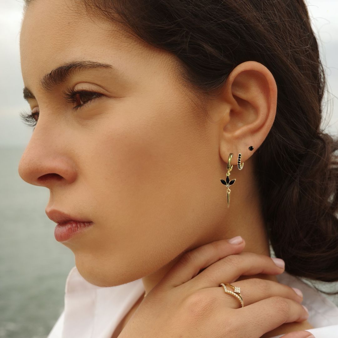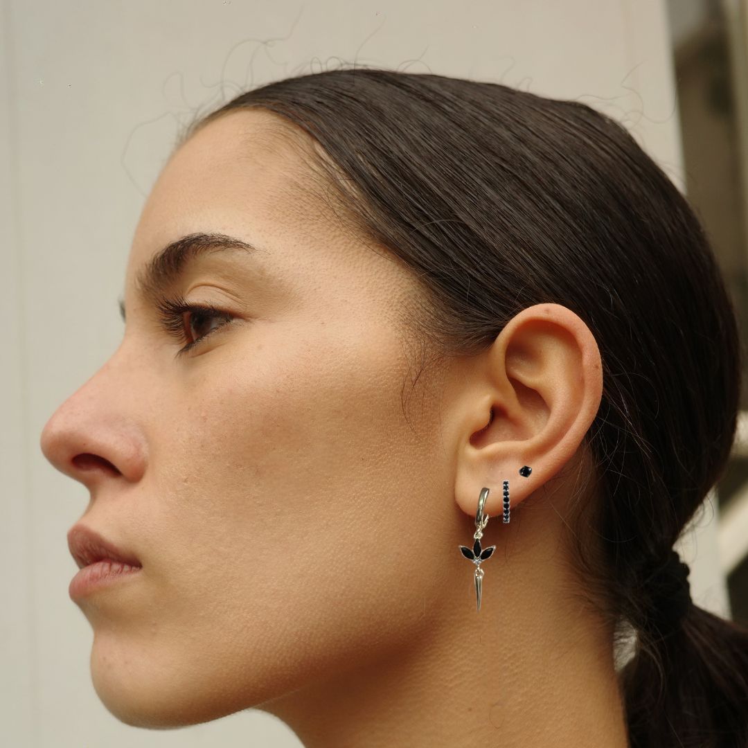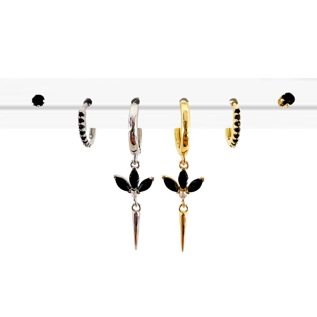 עגיל חישוק בקוטר של כ 1ס”מ עליו תלוי תליון של פרח מהמם משובץ 3 אבני קריסטל שחורות עליו תלוי תליון שפיץ.