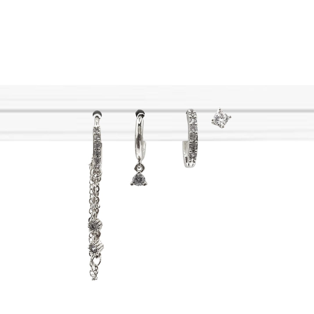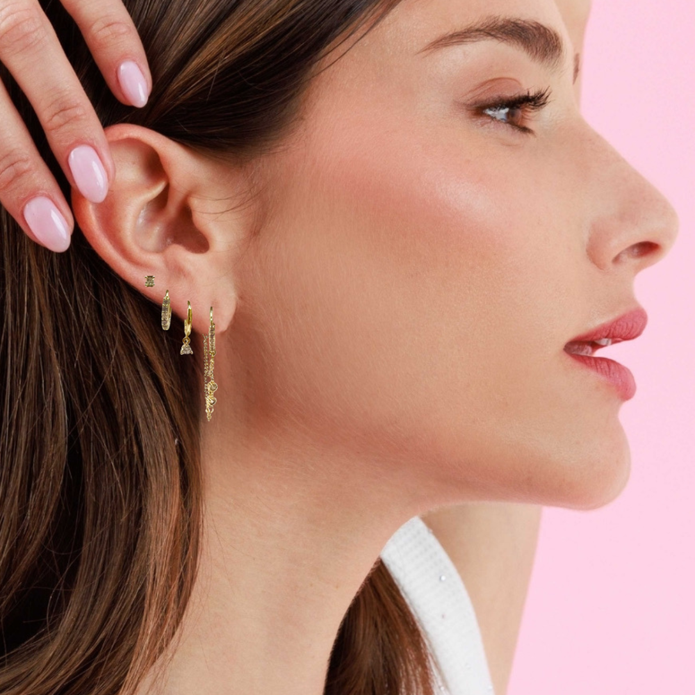 עגיל חישוק בקוטר של כ 1ס”מ משובץ אבני קריסטל, עליו תלויה שרשרת מקסימה משולבת שני אבני קריסטל קטנים.
