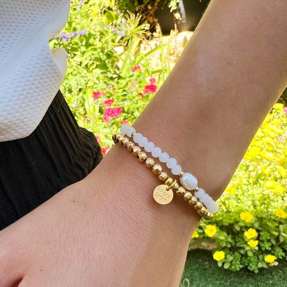 - חרוזי מתכת בציפוי זהב 24 קראט בגוון מט מושחלים על חוט סיליקון איכותי.