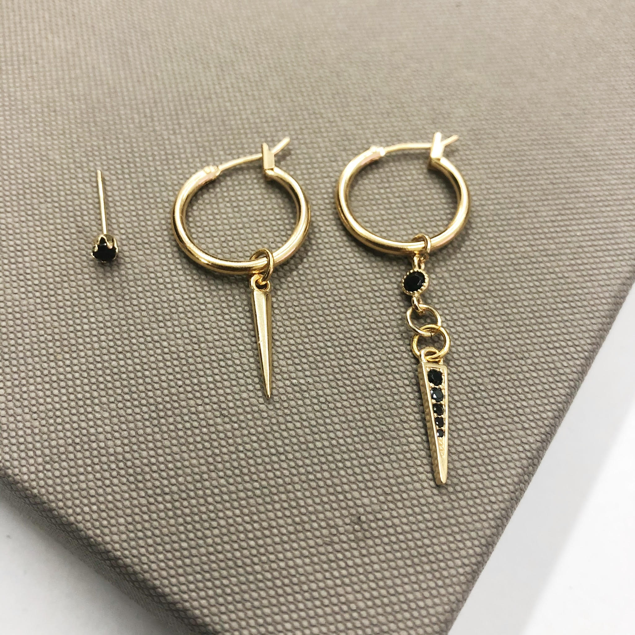 עגיל חישוק בקוטר 1.5 ס”מ עליו תלוי תליון עגול עדין משובץ באבן קריסטל שחורה ממנו נופל תליון שפיץ עדין משובץ באבני קריסטל שחורות, עגיל חישוק בקוטר 1.5 ס”מ עם תליון שפיץ עדין ועגיל צמוד עם קריסטל שחור משובץ להשלמת הלוק.