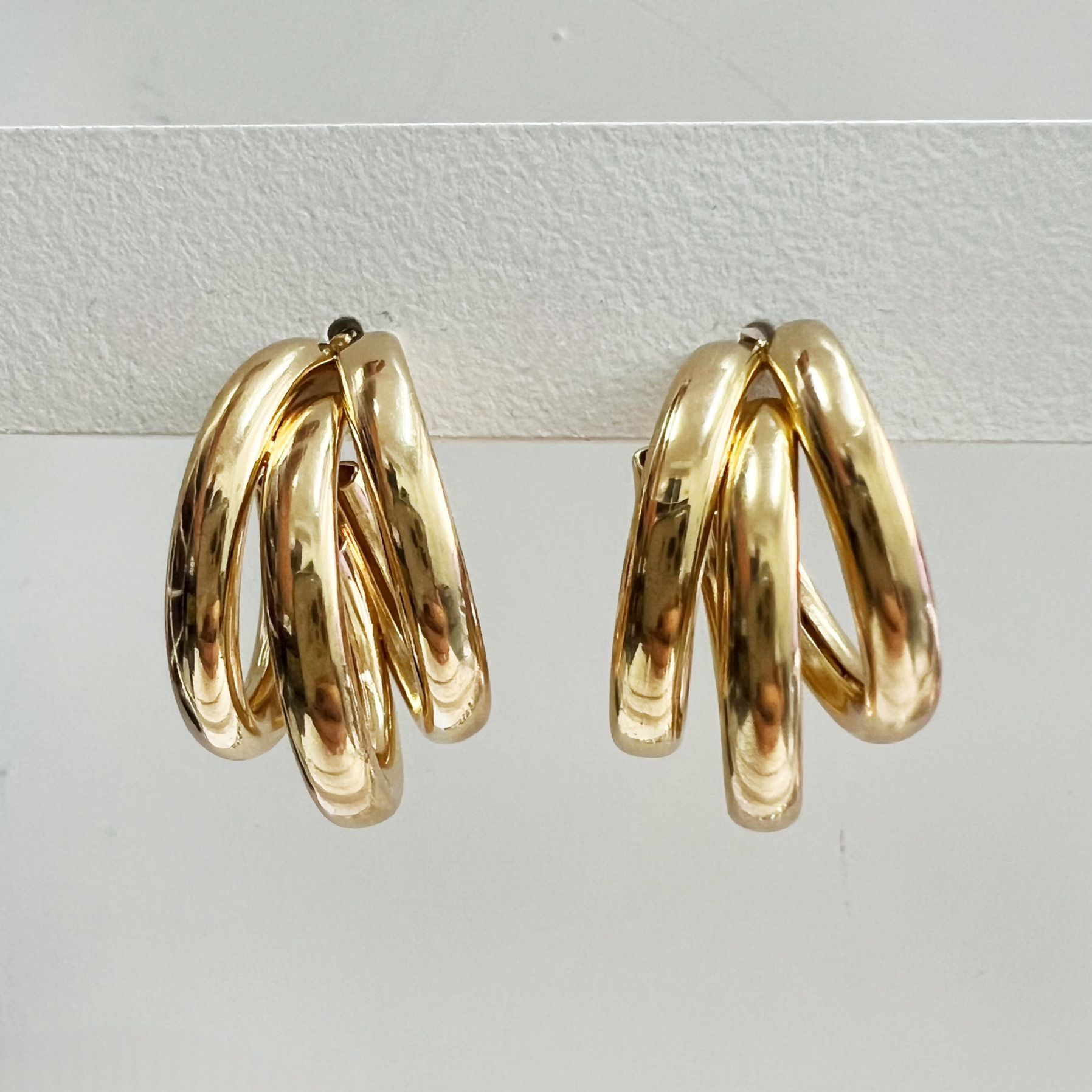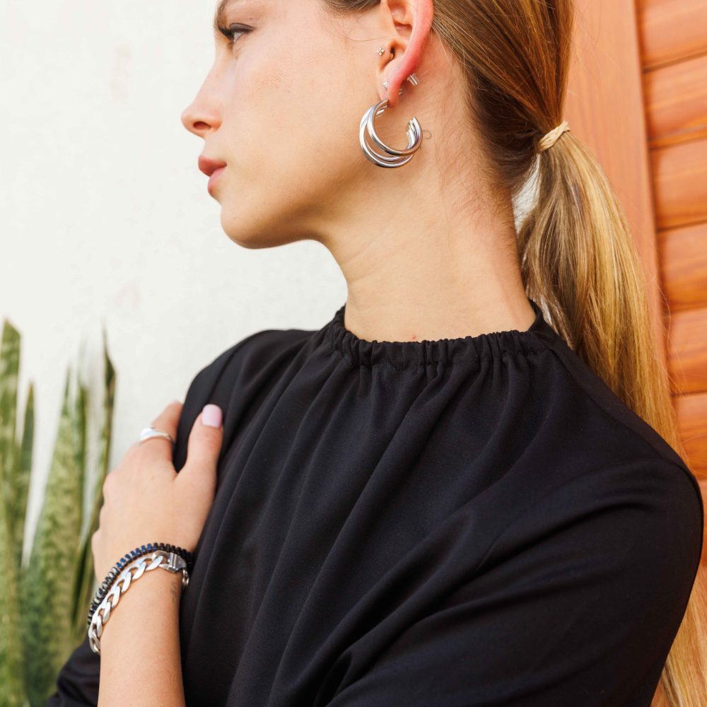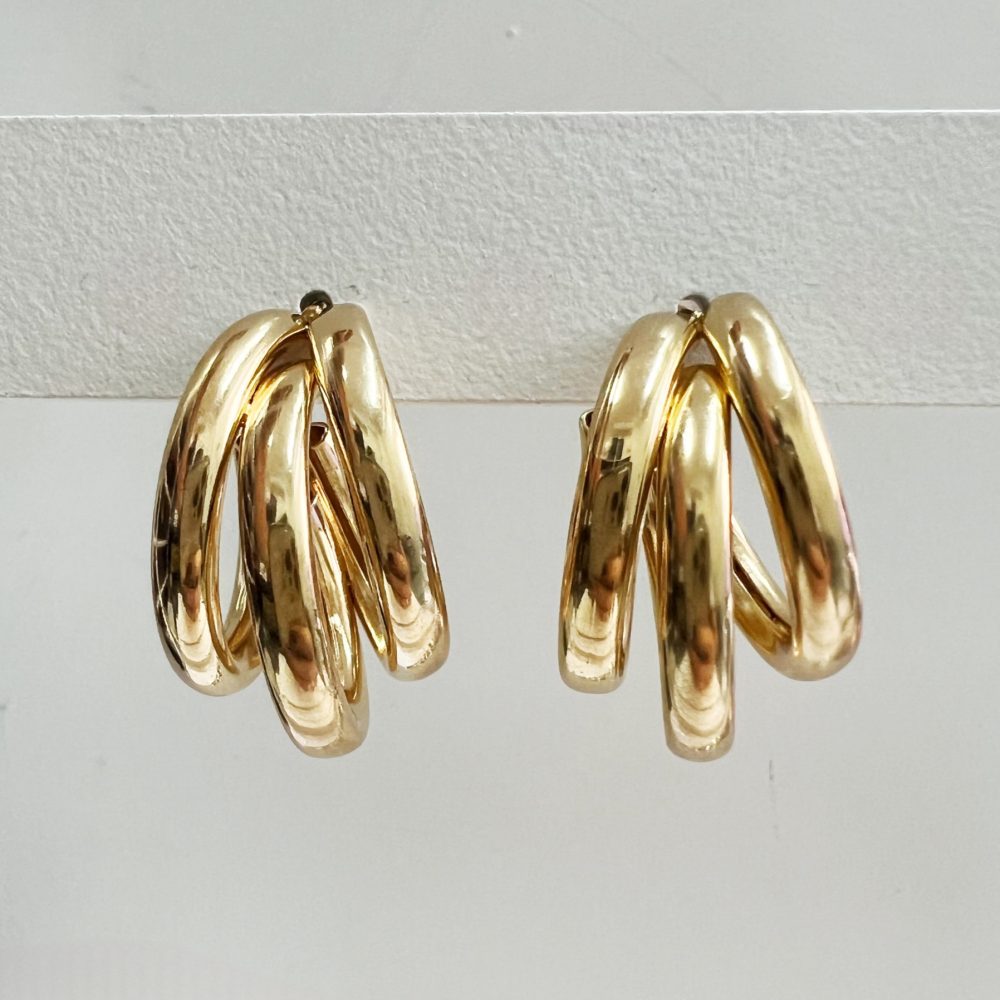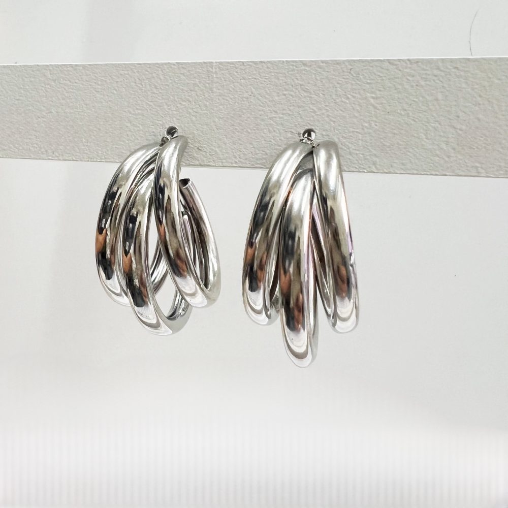 עגילים מיוחדים עשויים שלושה צינורות מחוברים יחדיו ויוצרים עגיל אחד של שלושה חישוקים מחוברים, בציפוי זהב מבריק או בציפוי כסוף מבריק.