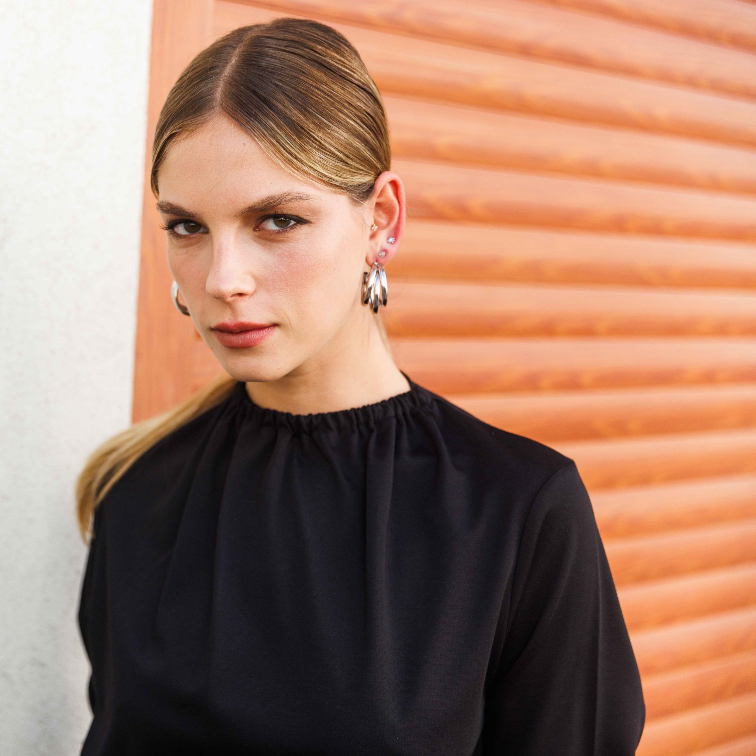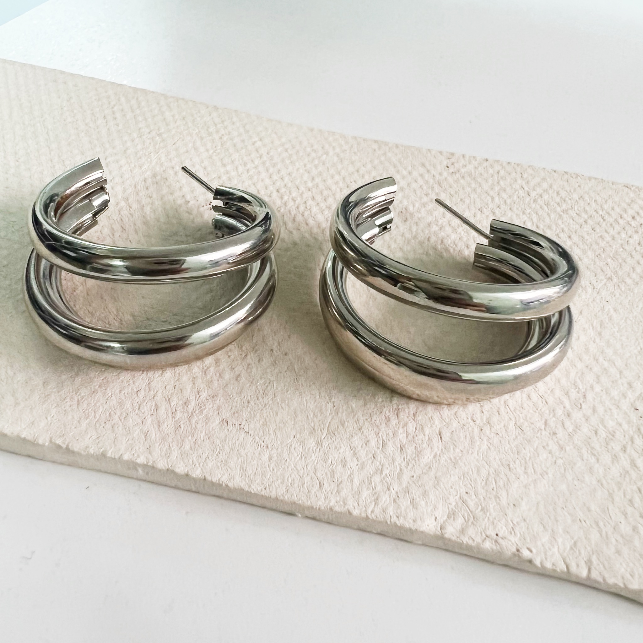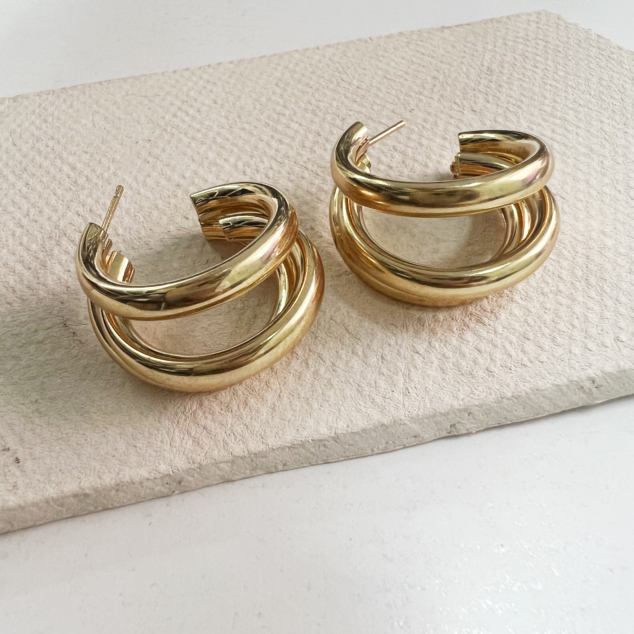 עגילים מיוחדים עשויים שלושה צינורות מחוברים יחדיו ויוצרים עגיל אחד של שלושה חישוקים מחוברים, בציפוי זהב מבריק או בציפוי כסוף מבריק.
