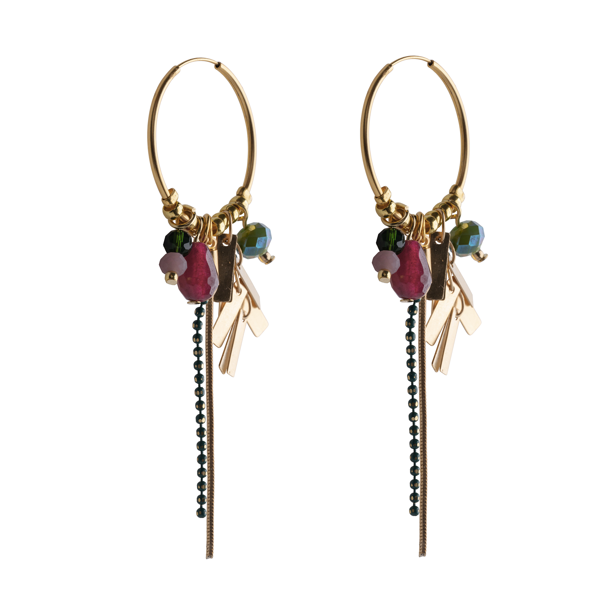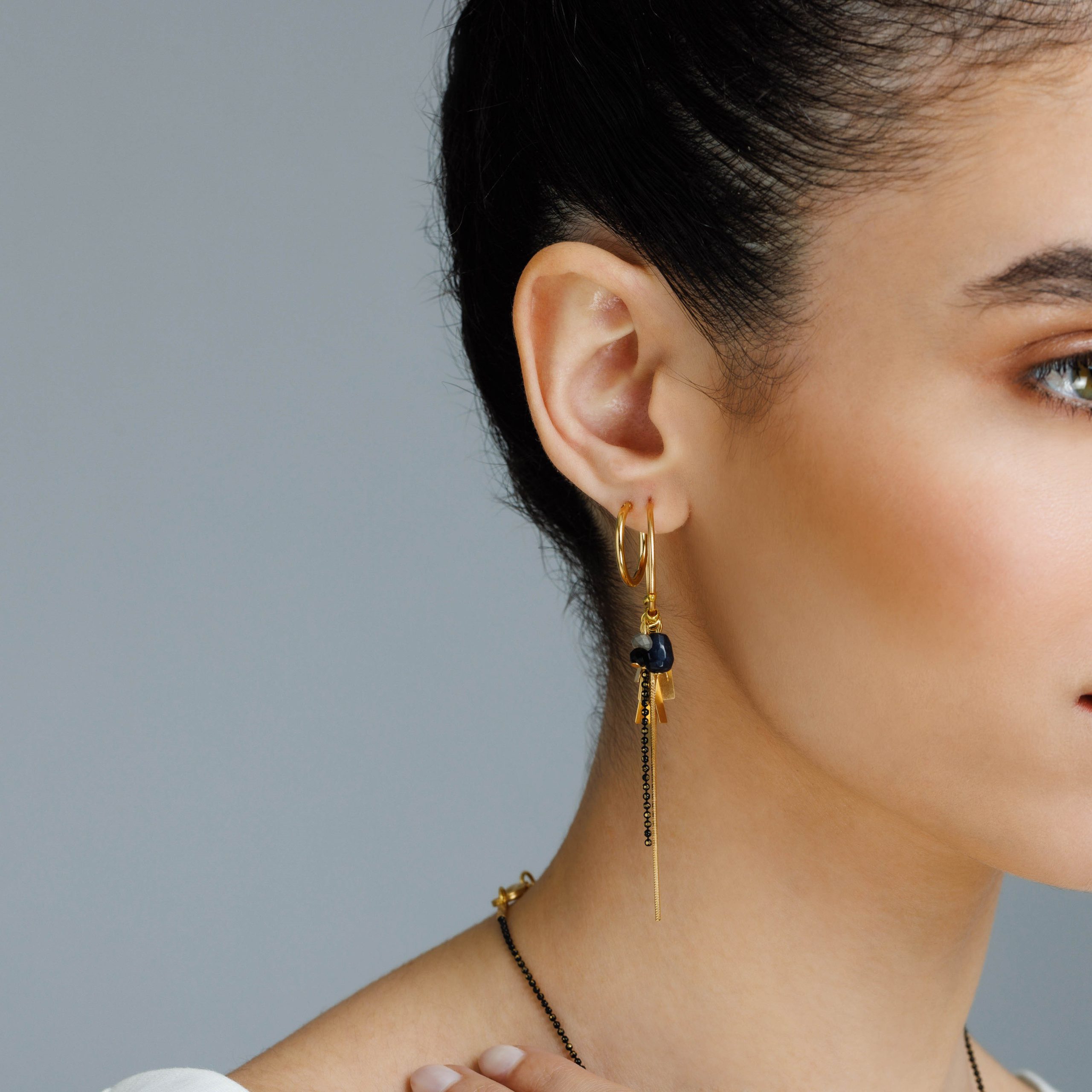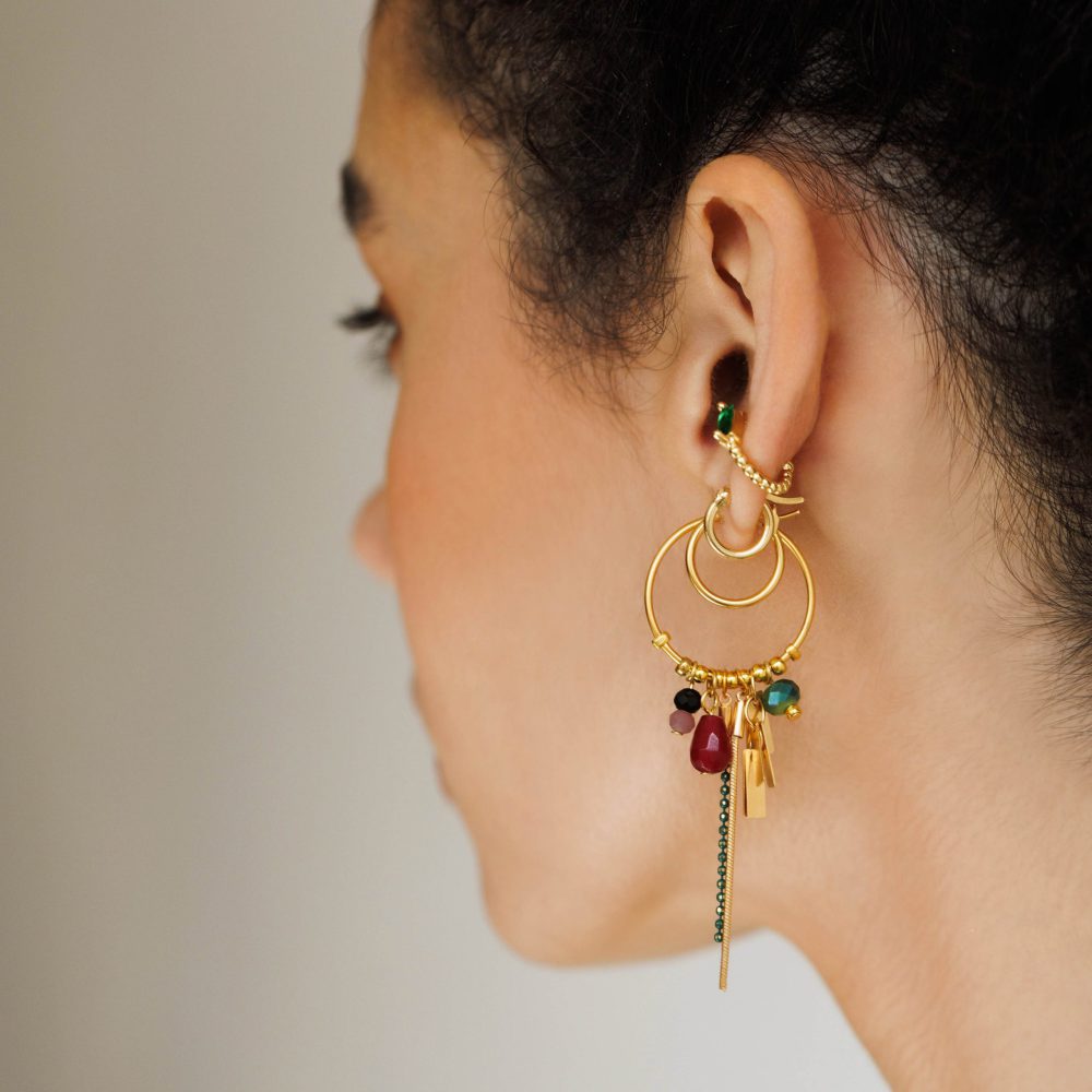 עגילים משגעים עשויים עגיל חישוק בקוטר כ2.5 ס”מ עליו תלויים אלמנטים משגעים ( אבני קריסטל, גדיל, שרשראות) שנותנים לו מראה שיקי ובעל נוכחות.
