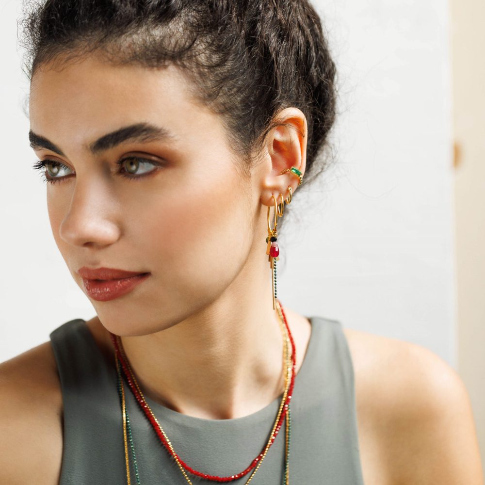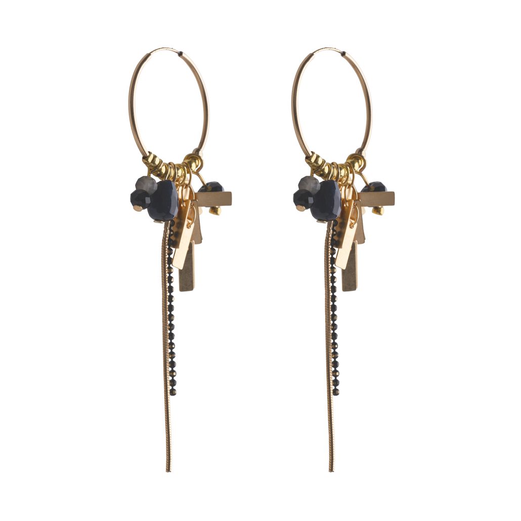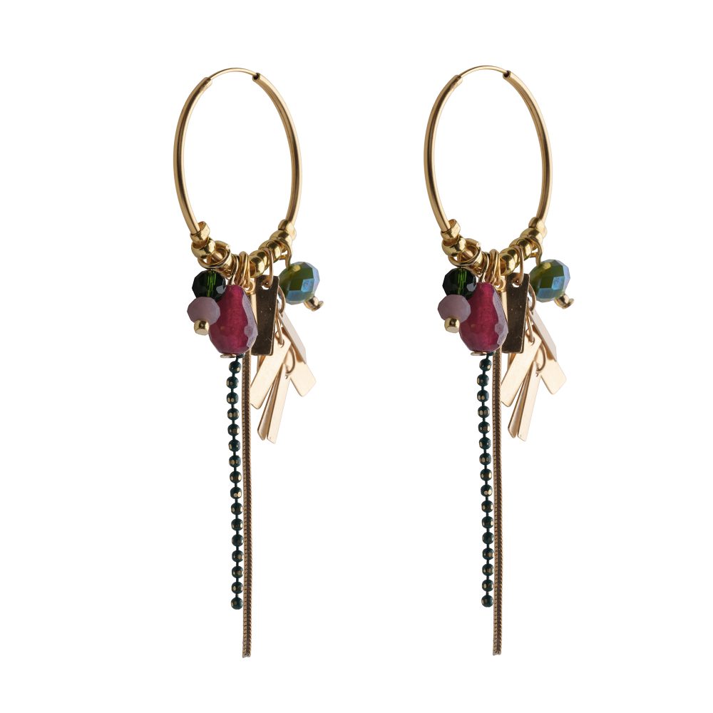 עגילים משגעים עשויים עגיל חישוק בקוטר כ2.5 ס”מ עליו תלויים אלמנטים משגעים ( אבני קריסטל, גדיל, שרשראות) שנותנים לו מראה שיקי ובעל נוכחות.