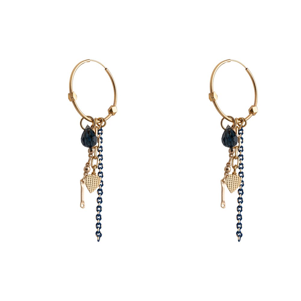 עגיל חישוק בקוטר כ 2.5 ס”מ עליו תלויים אלמנטים משגעים – אבן סברובסקי כחולה/סגולה מהממת, שרשרת כחולה/סגולה ושרשרת חוליות עדינה עם תליון לב עדין שנותנים לו מראה שיקי .