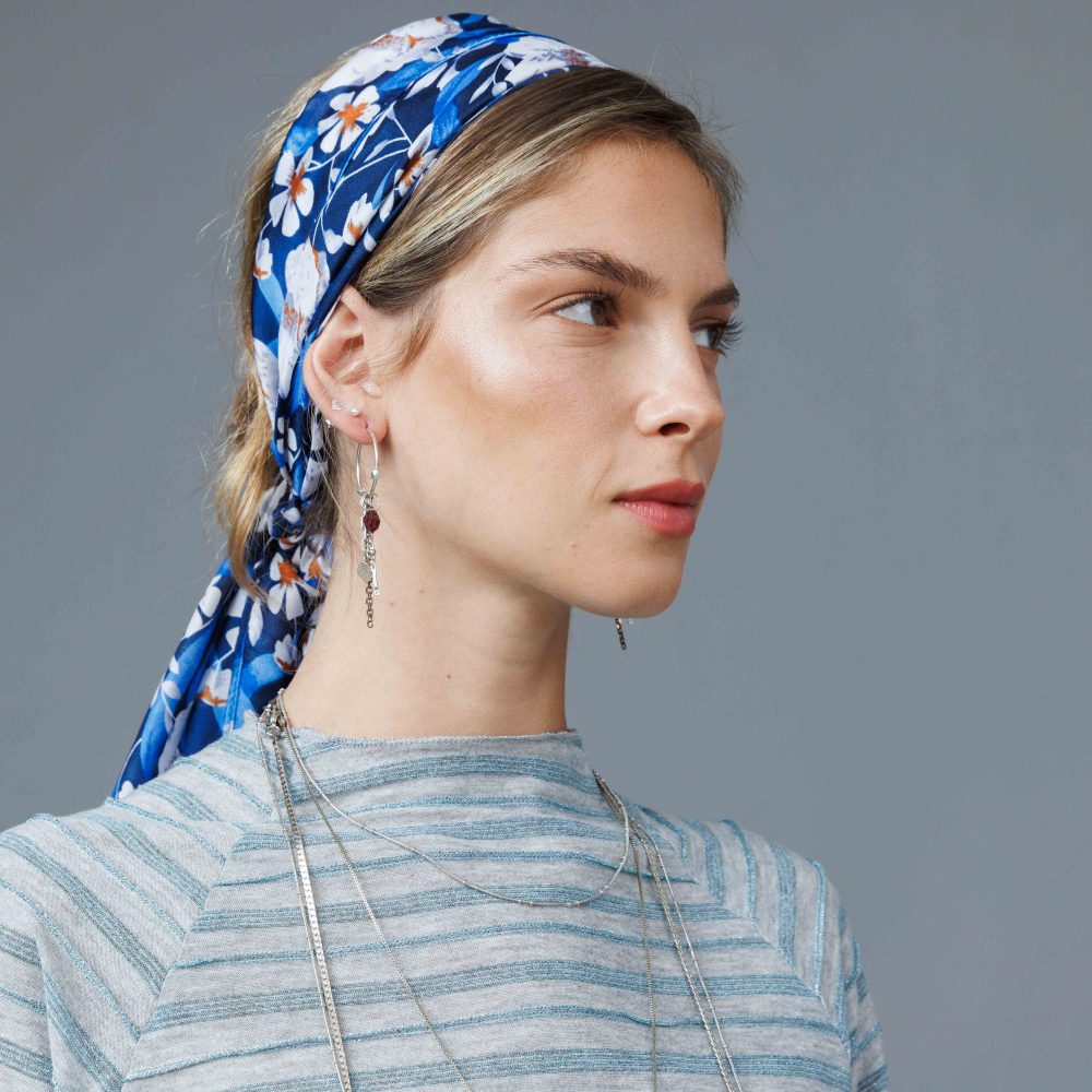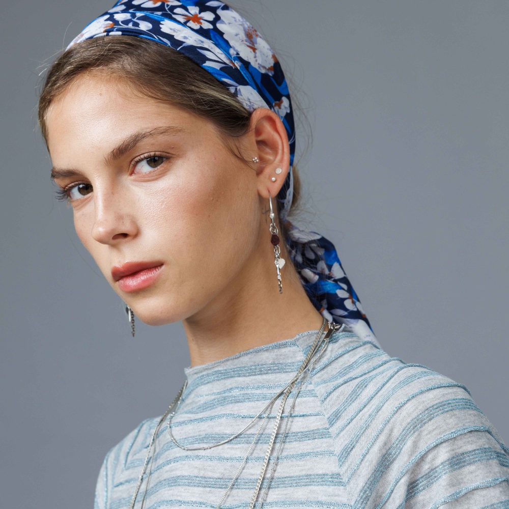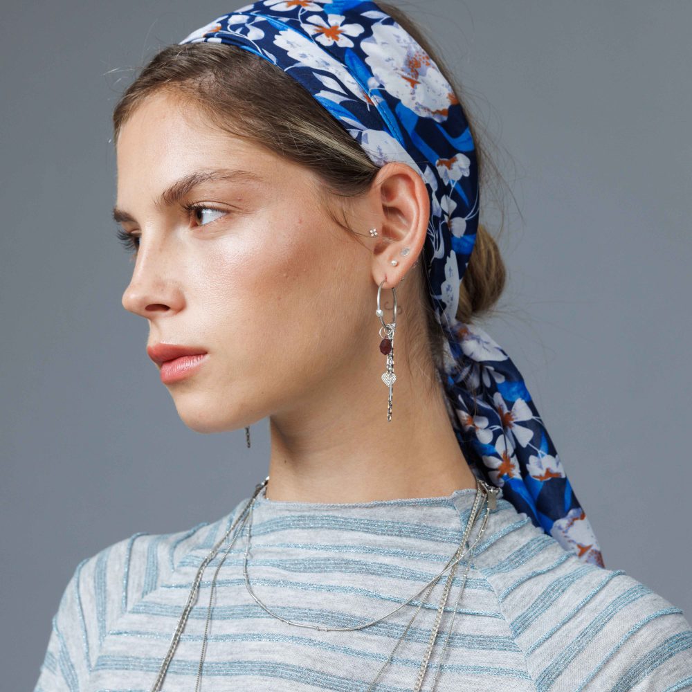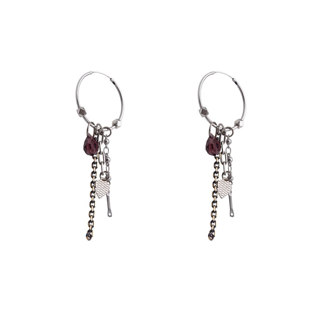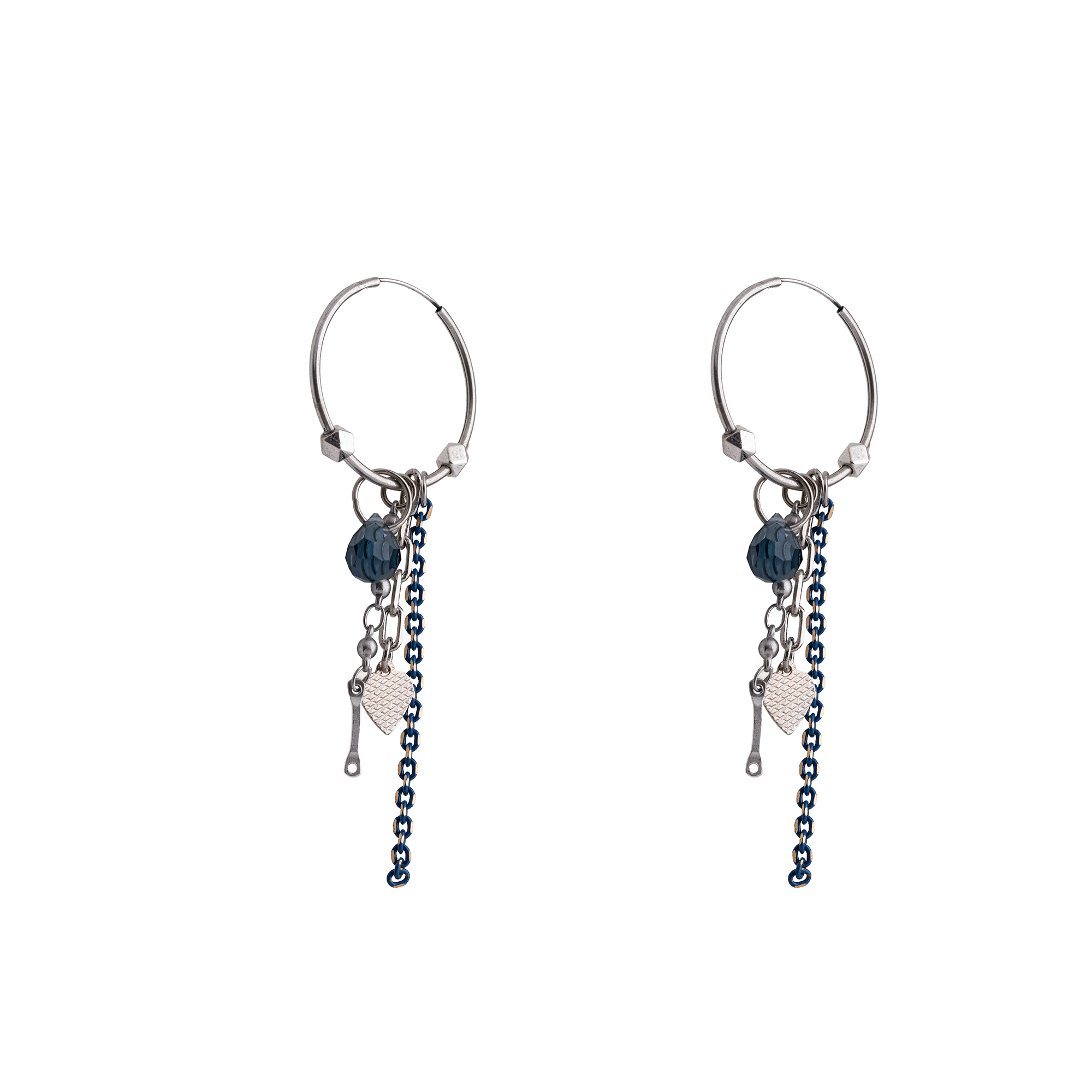 עגיל חישוק בקוטר כ 2.5 ס”מ עליו תלויים אלמנטים משגעים – אבן סברובסקי כחולה/סגולה מהממת, שרשרת כחולה/סגולה ושרשרת חוליות עדינה עם תליון לב עדין שנותנים לו מראה שיקי .