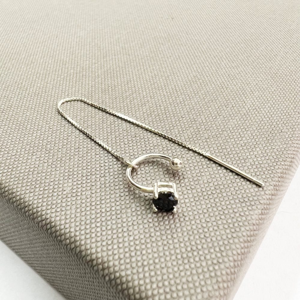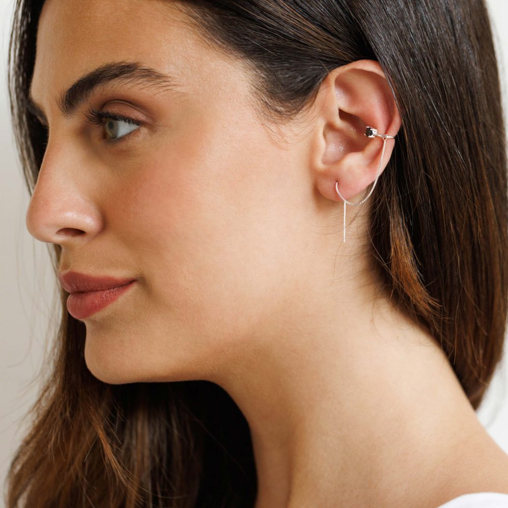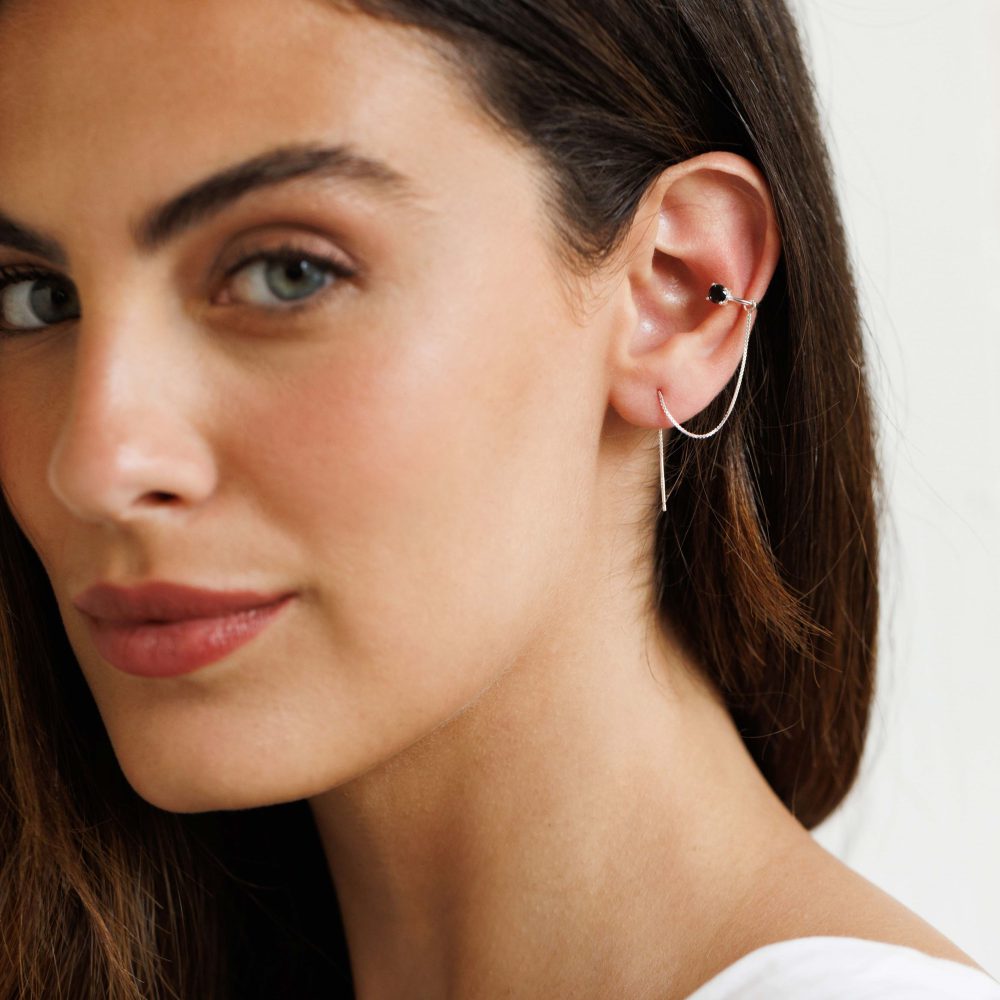 עגיל שרשרת שנכנס לחור אליו מחובר עגיל הליקס ללא חור משובץ אבן שקריסטל שחורה עשוי כסף אמיתי.