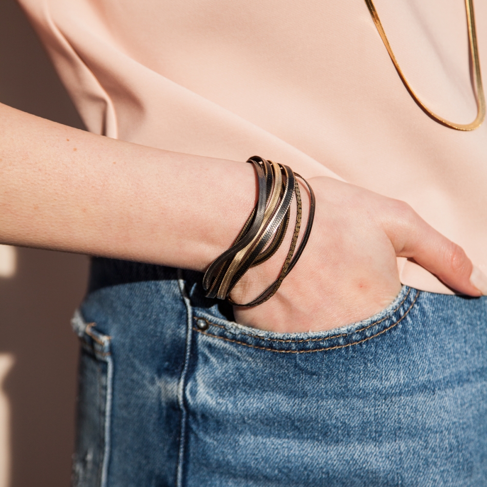 שרשראות מתכת מרובות במבחר סגנונות בציפוי זהב 24 קראט בגוון מט או בציפוי כסוף ובציפוי שחור,