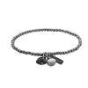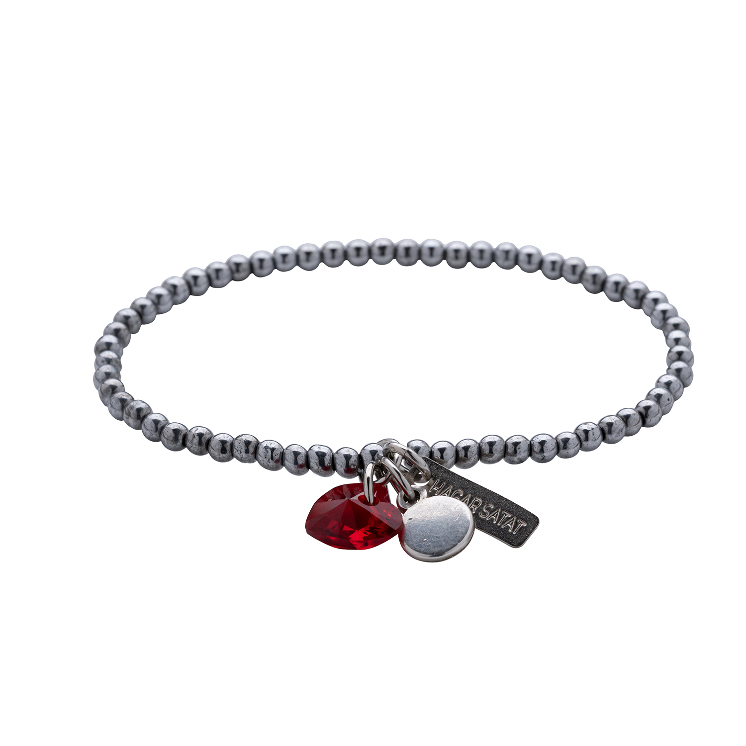 הצמיד עשוי חרוזי המטייט עגולים משולבים עם תליון לב סברובסקי בצבע שחור או אדום ותליון עגול.