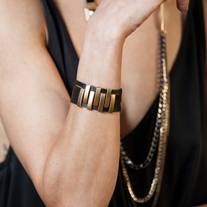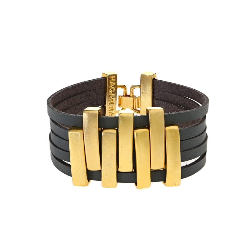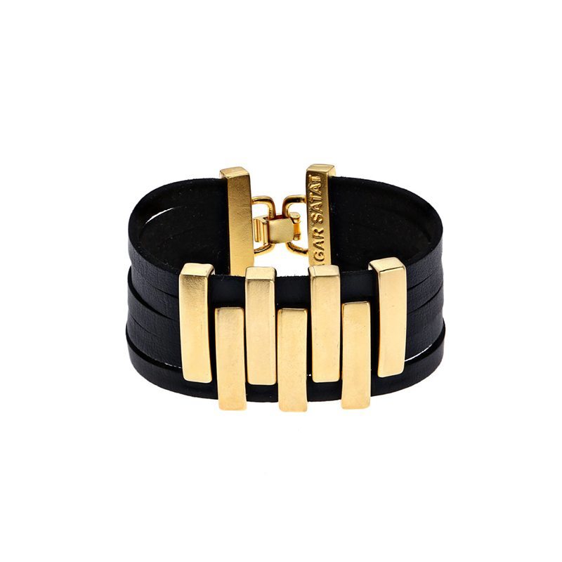 חמש רצועות סקאי איכותיות מושחלות בצינורות מתכת בציפוי זהב 24K, הצמיד מושלם לכל אירוע.