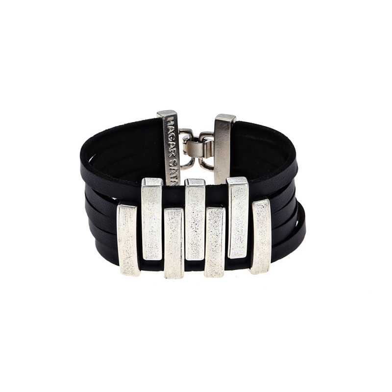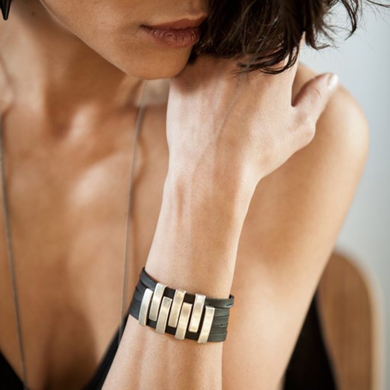 חמש רצועות סקאי איכותיות מושחלות בצינורות מתכת בציפוי כסוף, הצמיד מושלם לכל אירוע.