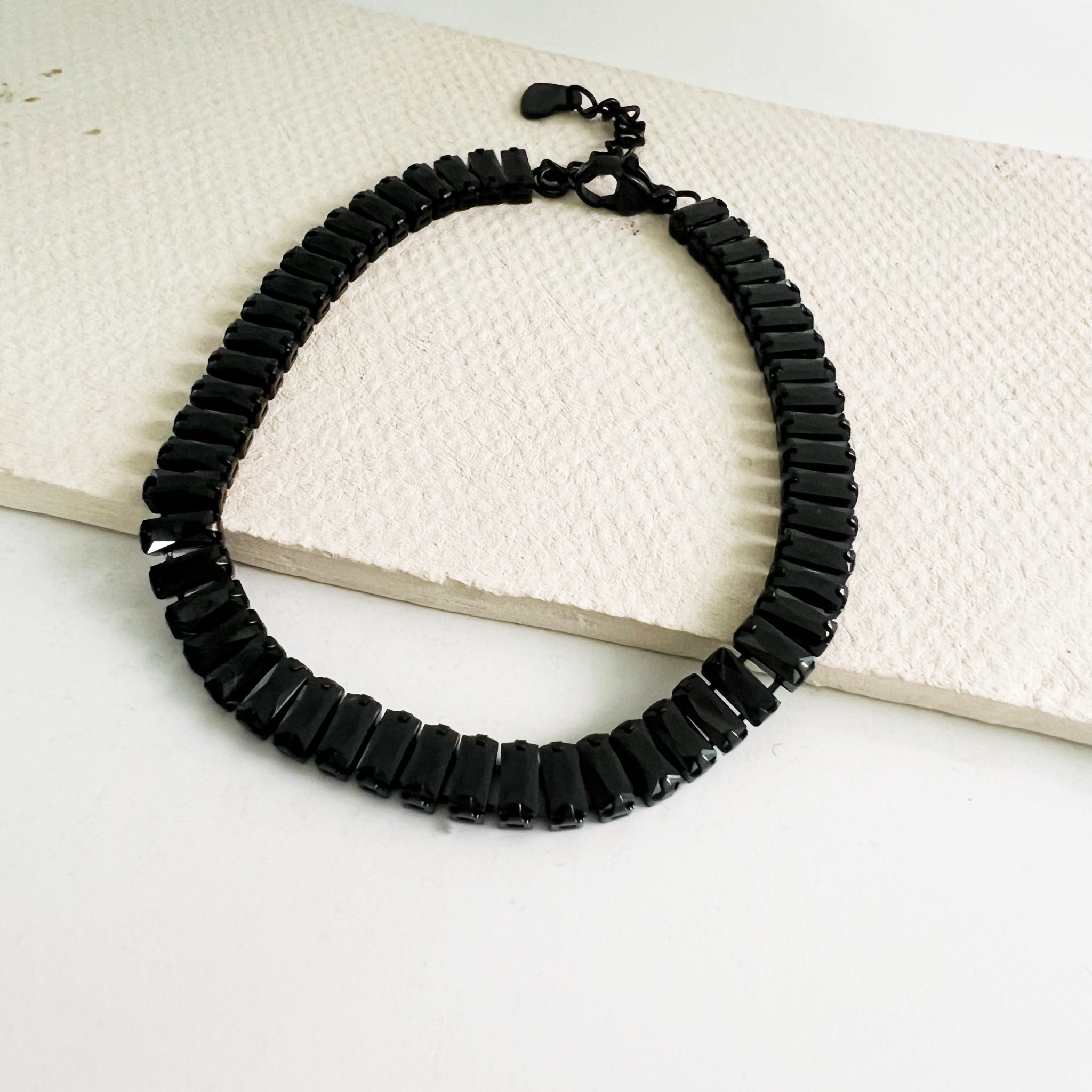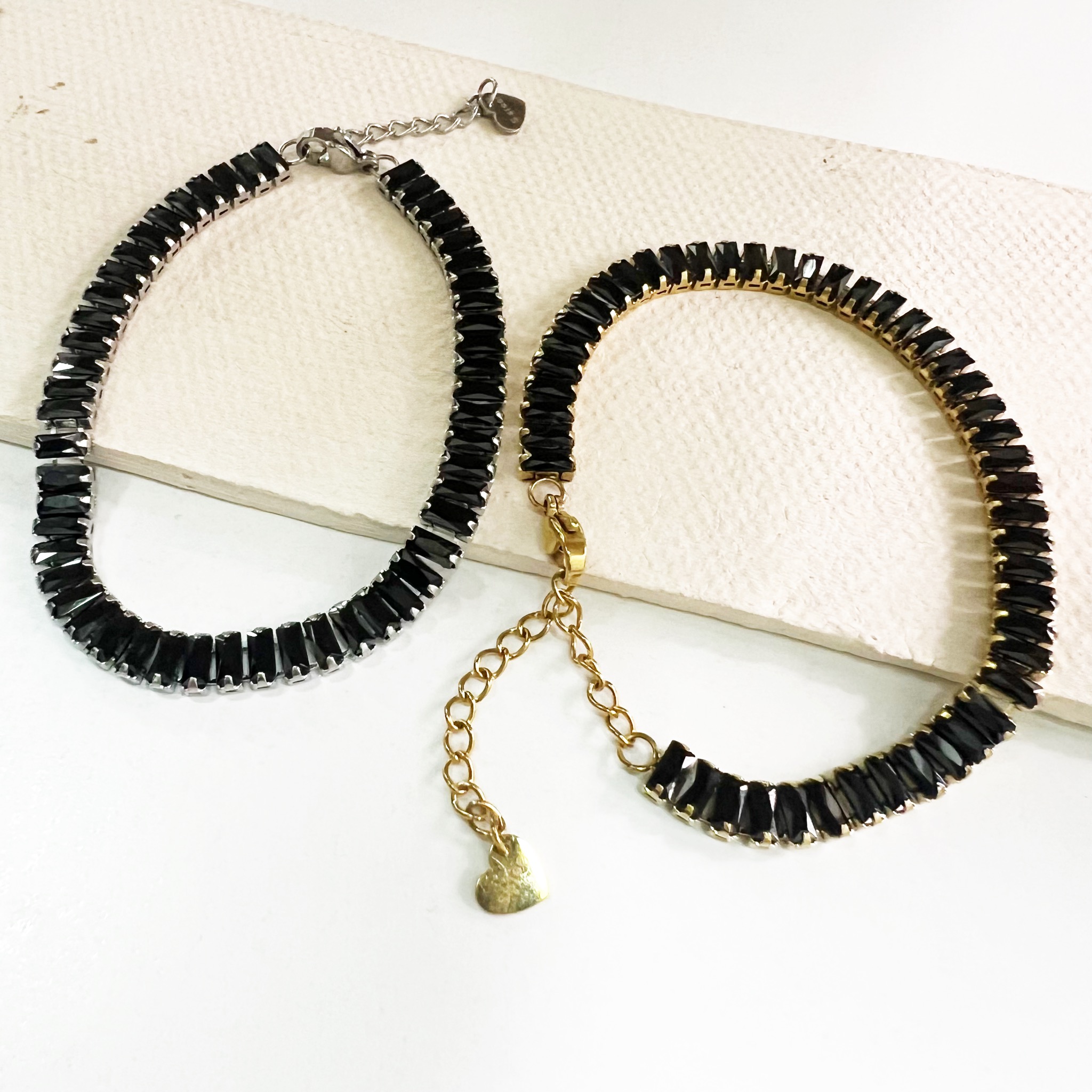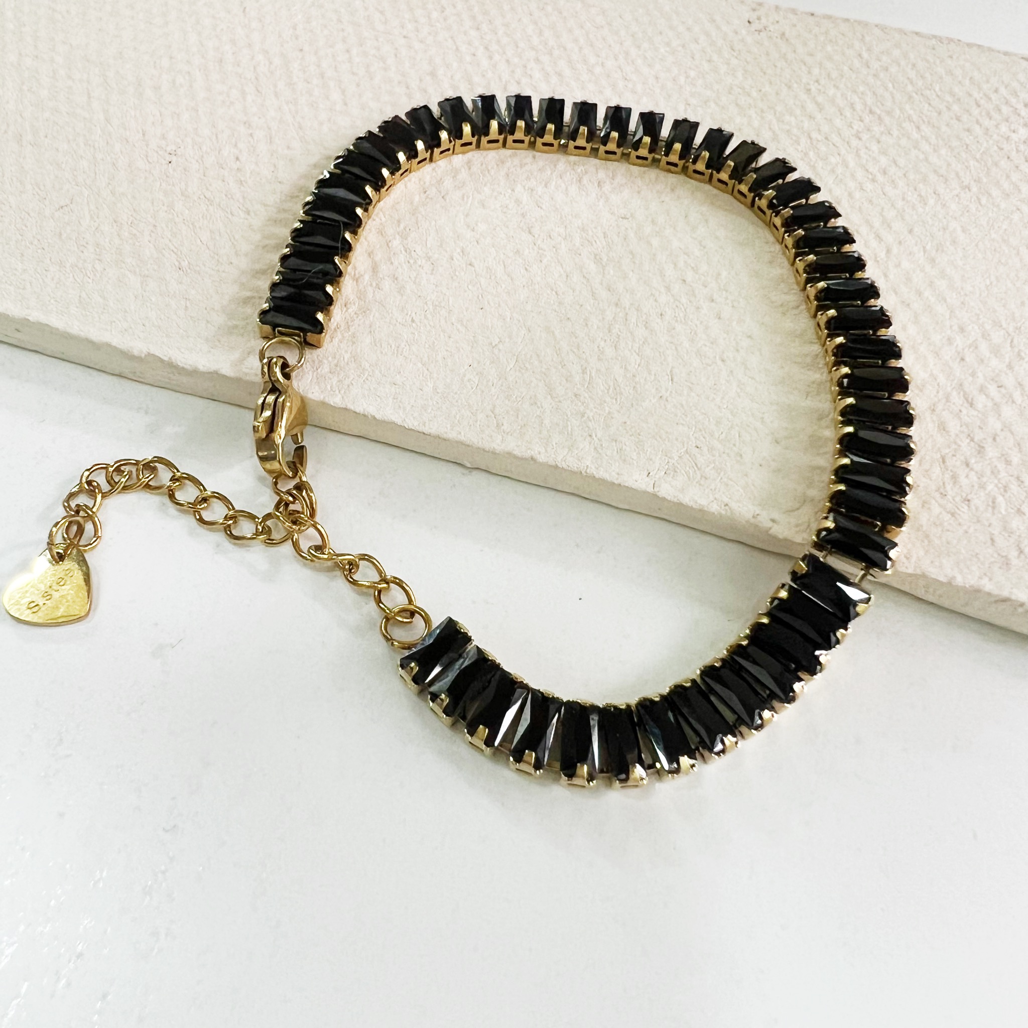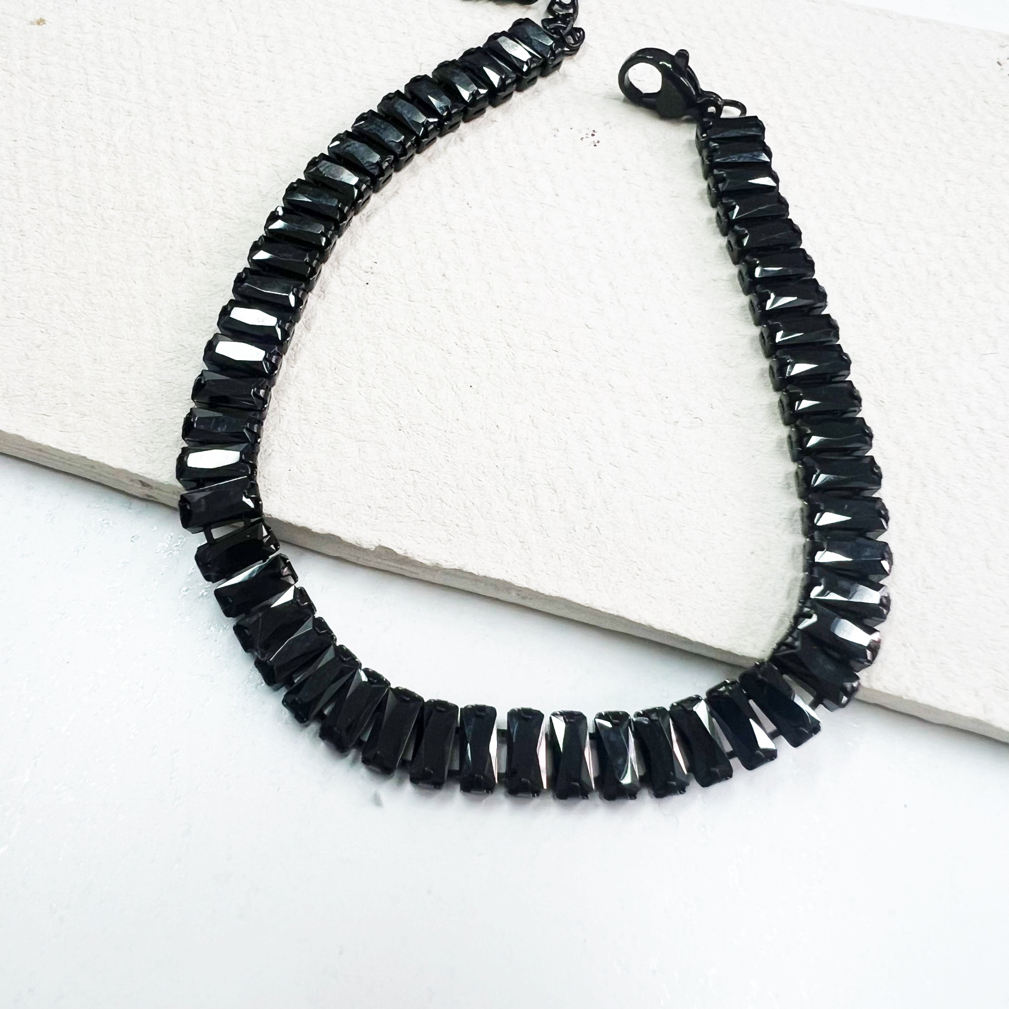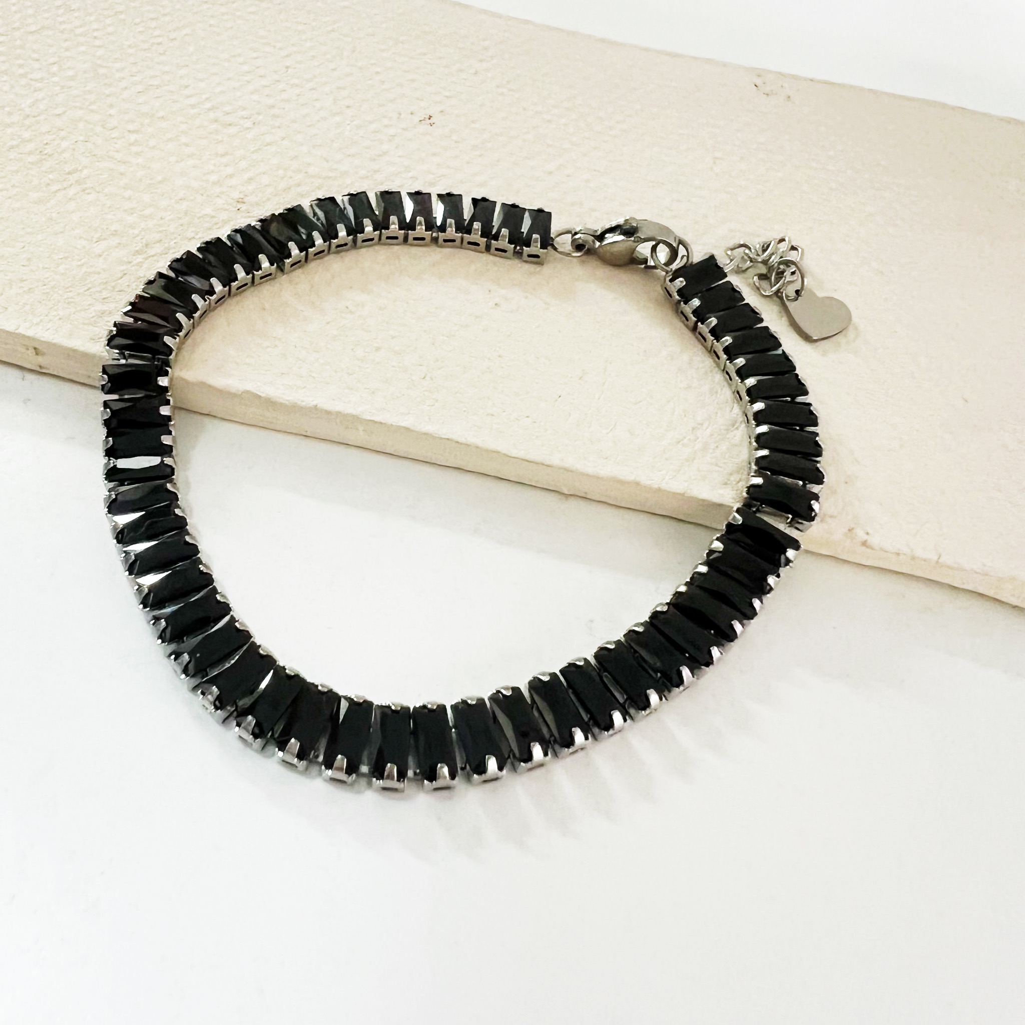 צמיד טניס קלאסי עשוי סטיינלס סטיל עמיד ואיכותי משובץ אבנים מלבניות שחורות מדהימות.