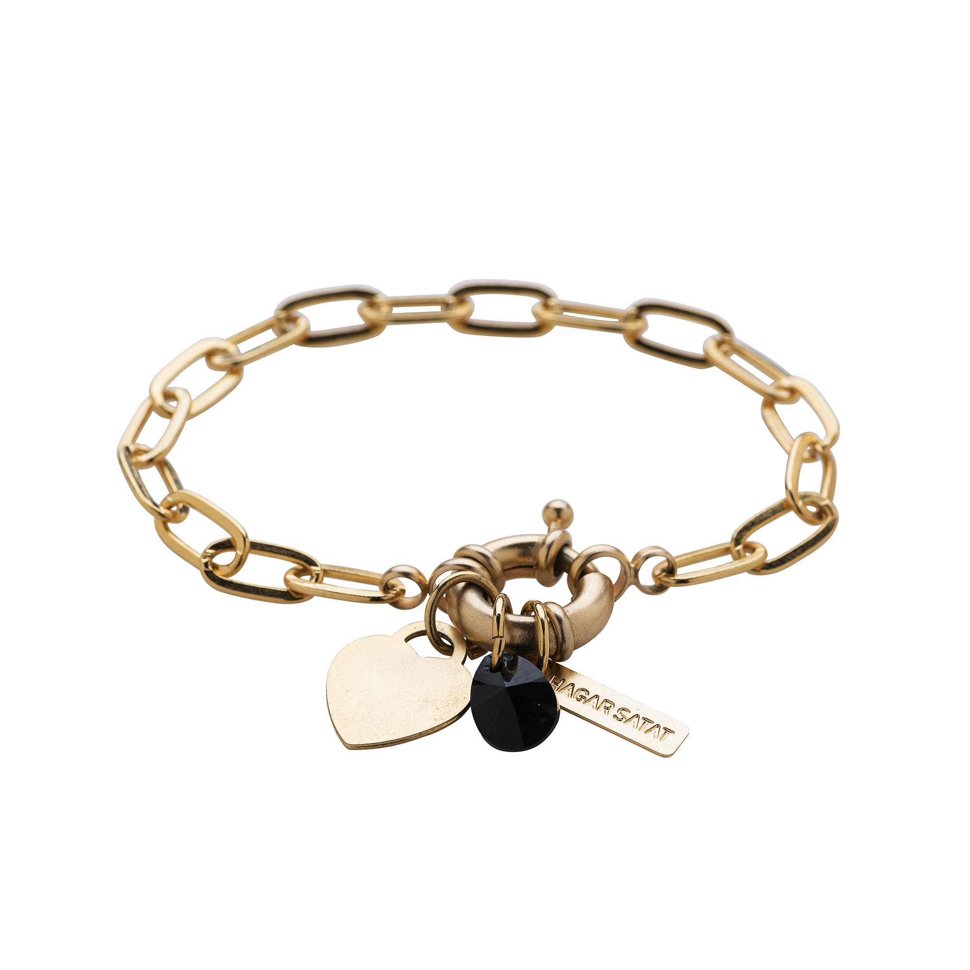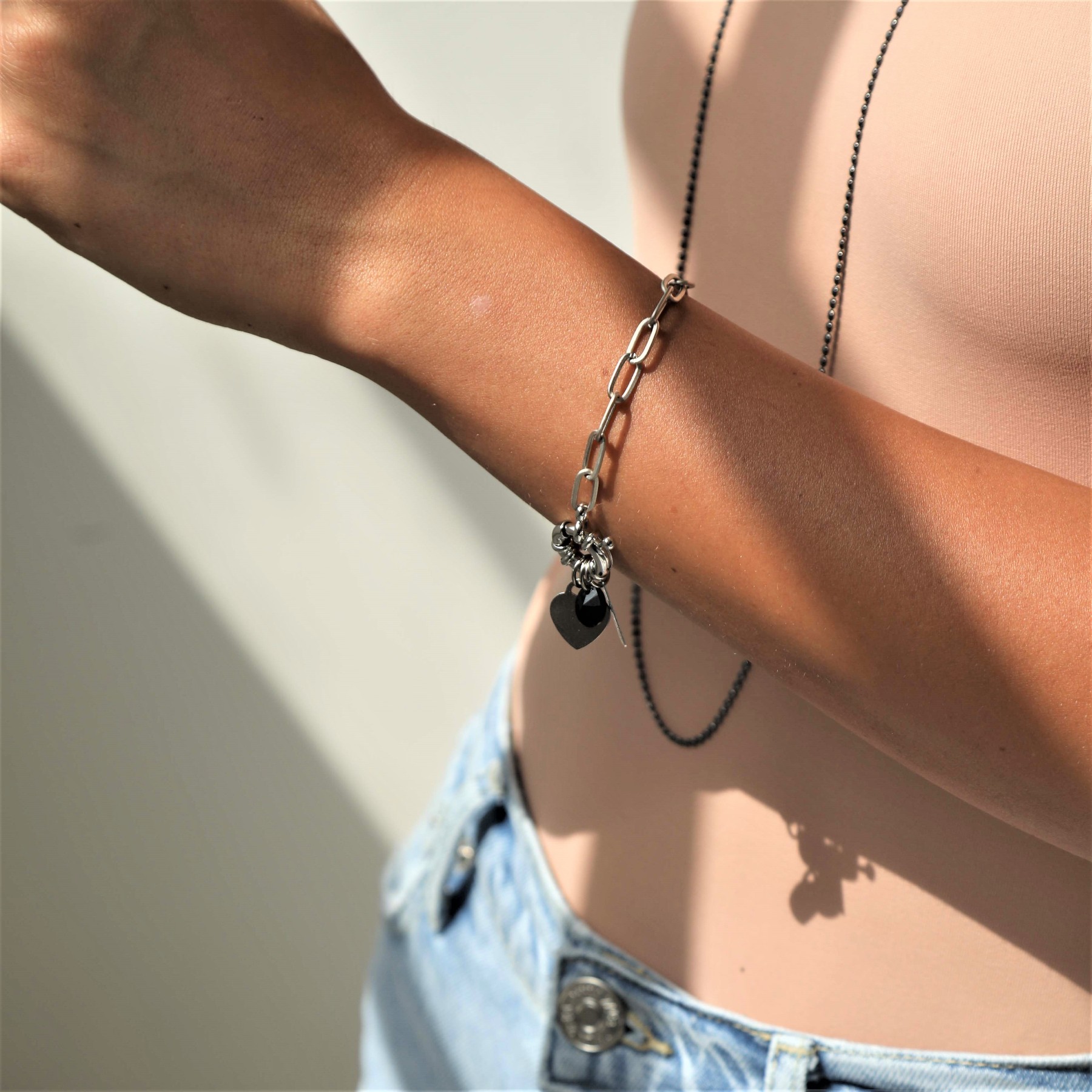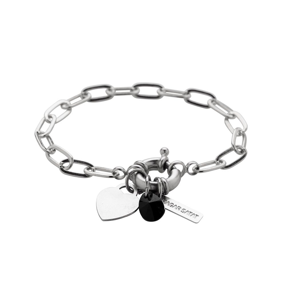משולב תליוני לב מהמם בגודל 1 ס”מ, ואבן סברובסקי שחורה.