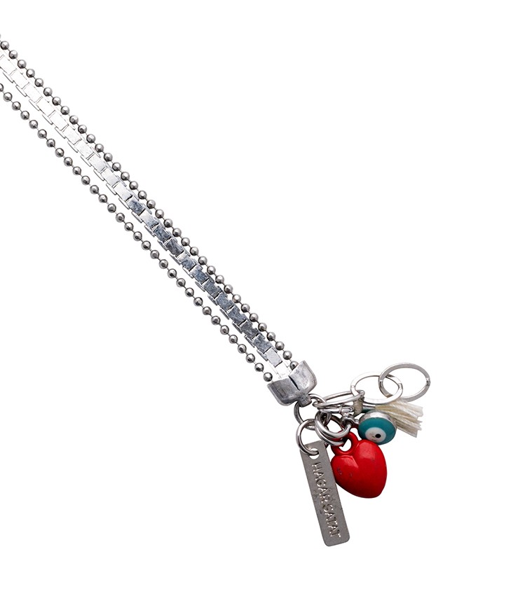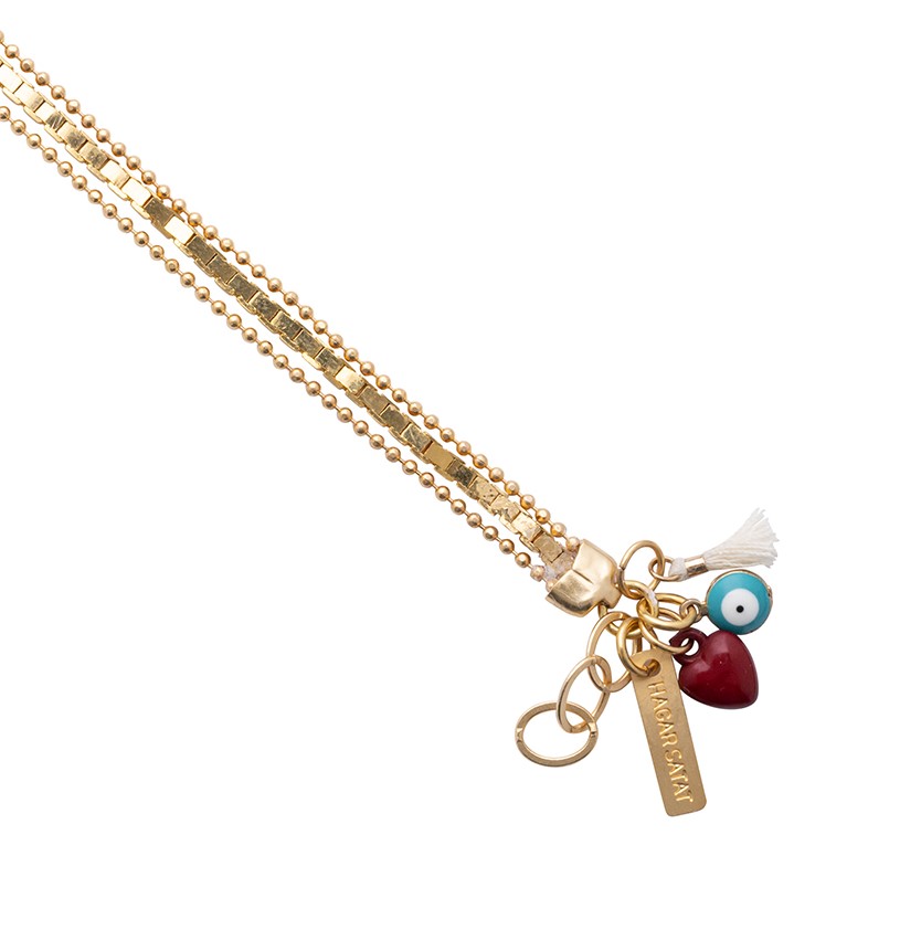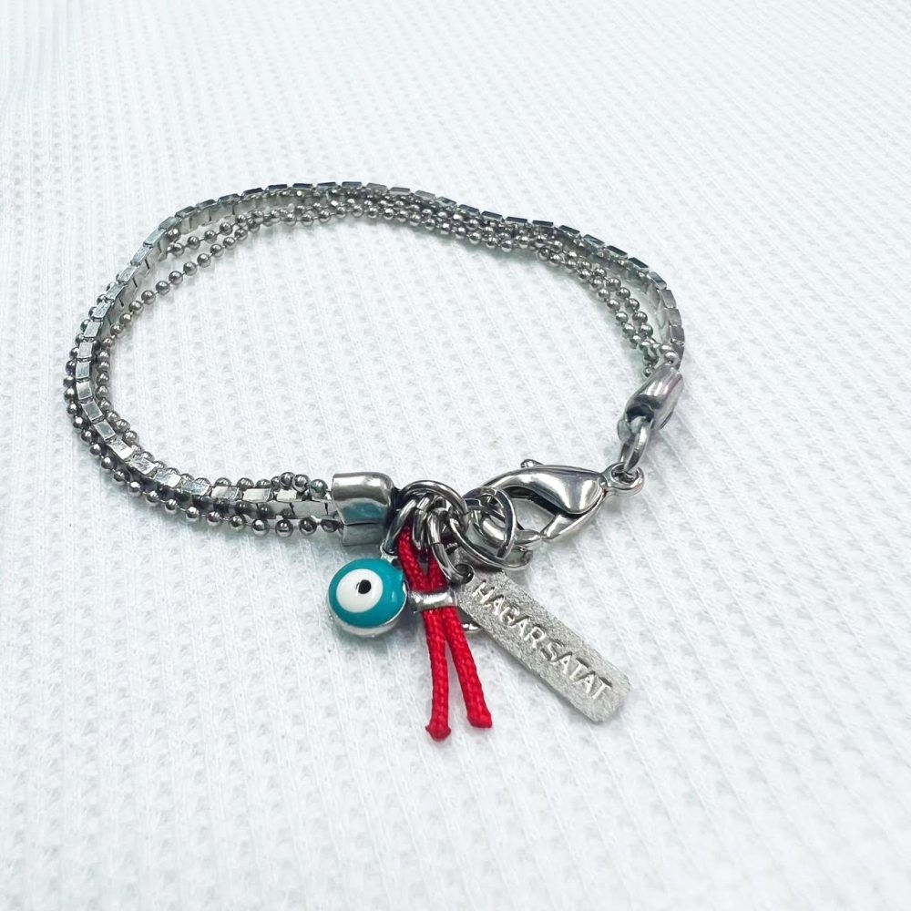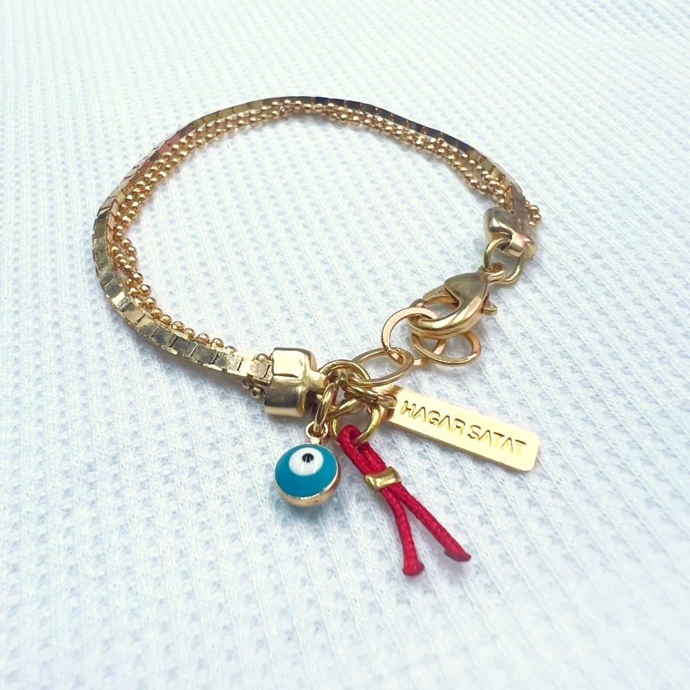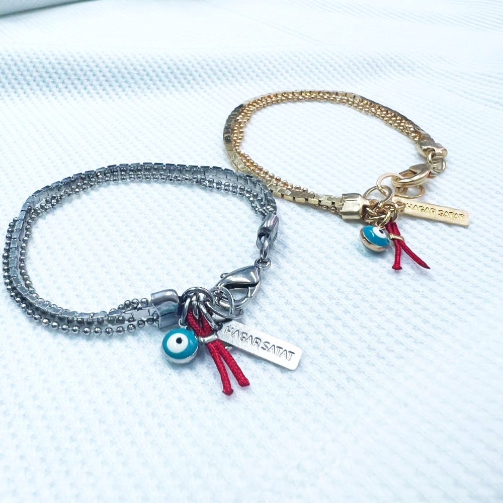 צמיד מיוחד עשוי משלוש שרשראות בציפוי זהב 24 קראט או בציפוי כסוף עמיד ואיכותי מחוברות יחדיו ובקצה שני תליונים משגעים מלאים מזל ואהבה. תליון עין בצבע טורקיז ותליון חוט אדום.