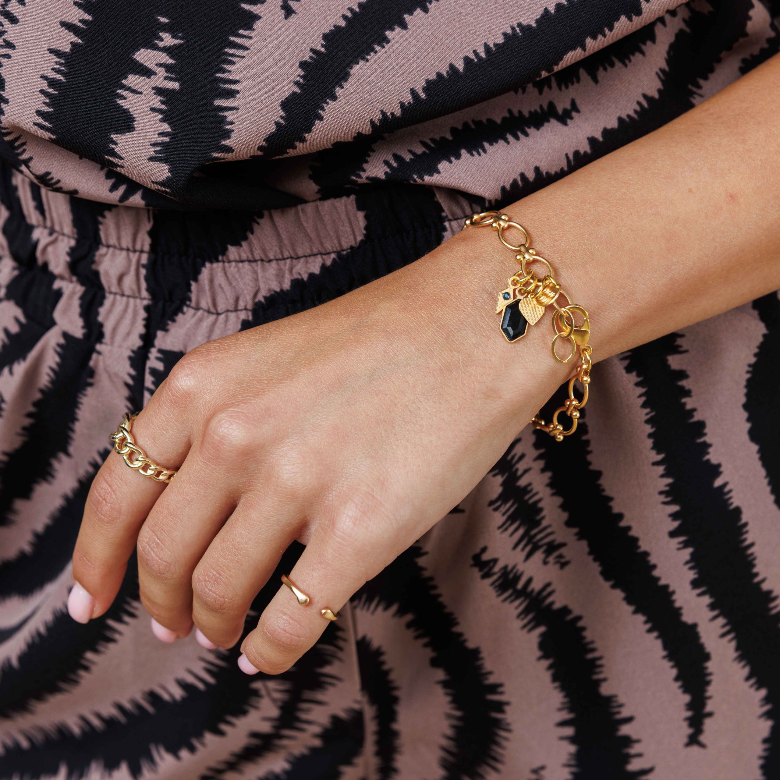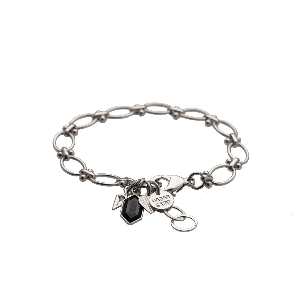 לצמיד יש מקבץ תליונים – בית אבן משושה משובץ אבן סברובסקי אפור בגודל של כ 2 ס”מ תליון לב מקסים מחובר לשרשרת עדינה ותליון שפיץ קטן משובץ אבן סברוסקי שחורה.