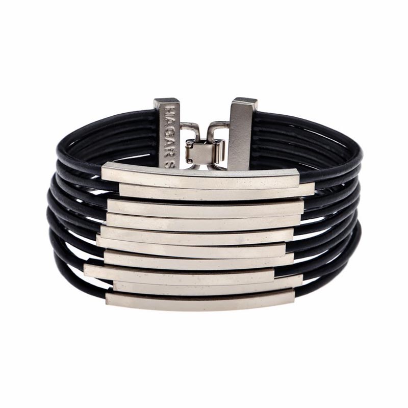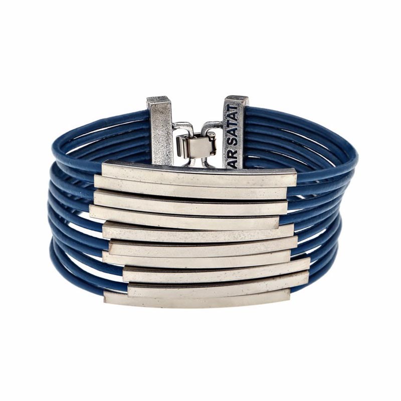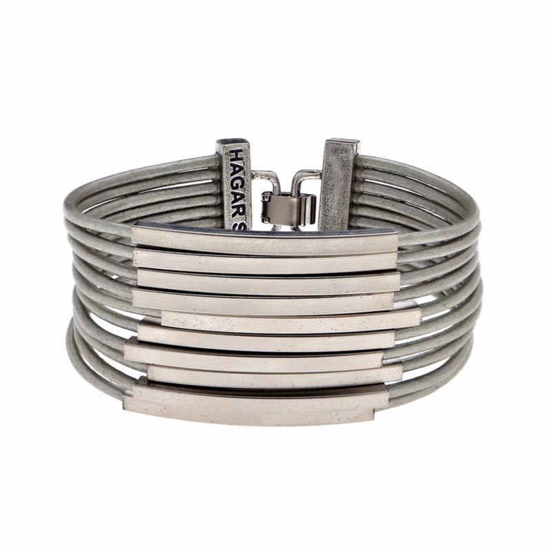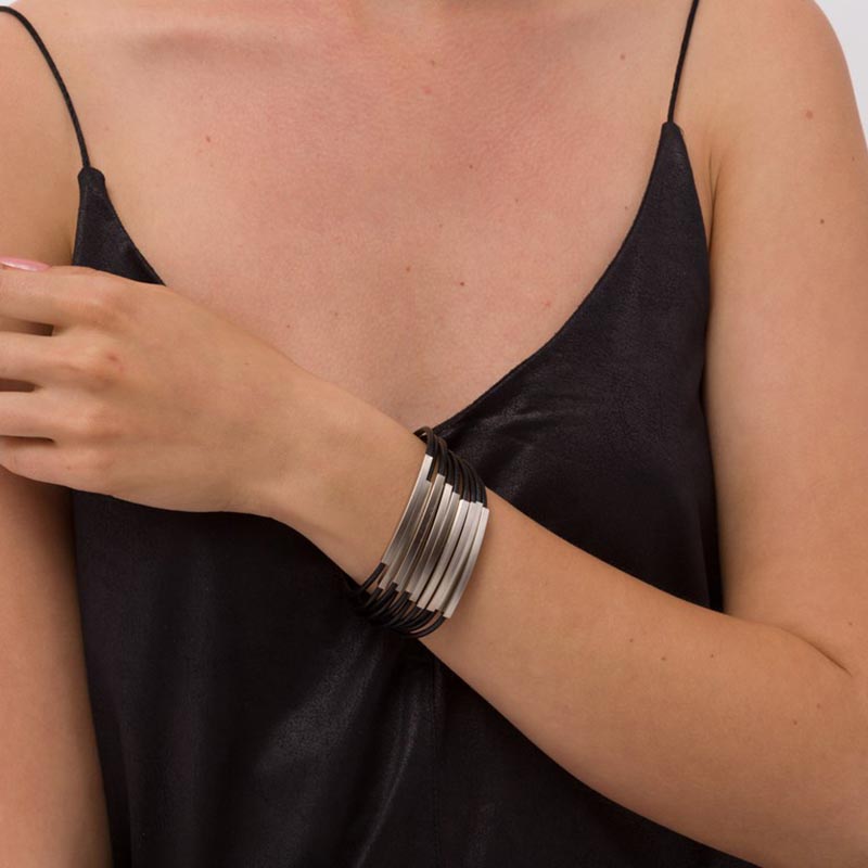 עשרה חוטיי עור איכותי מושחלים בצינורות מתכת בציפוי כסוף בגוון מט. סוגר חזק ונוח לענידה, גם הוא מצופה כסף.