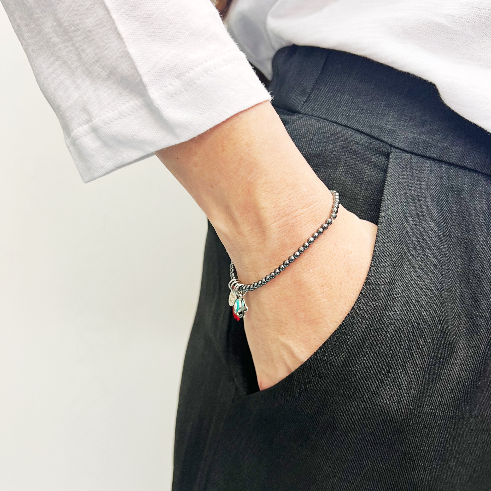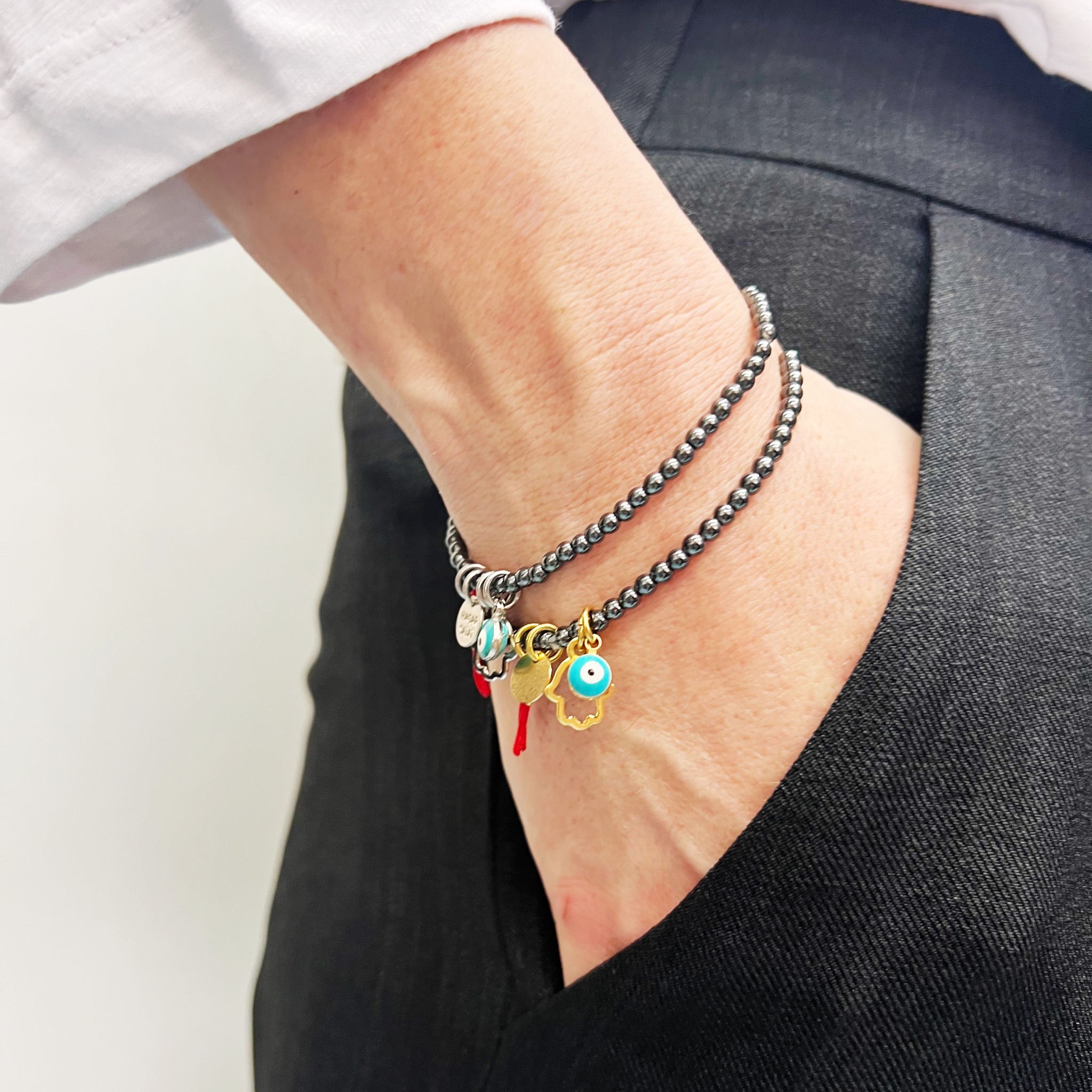 הצמיד עשוי חרוזי המטייט עם נצנוץ עדין משולבים עם תליוני צ’ארמס מקסימים מלאים באהבה, תקווה ומזל.