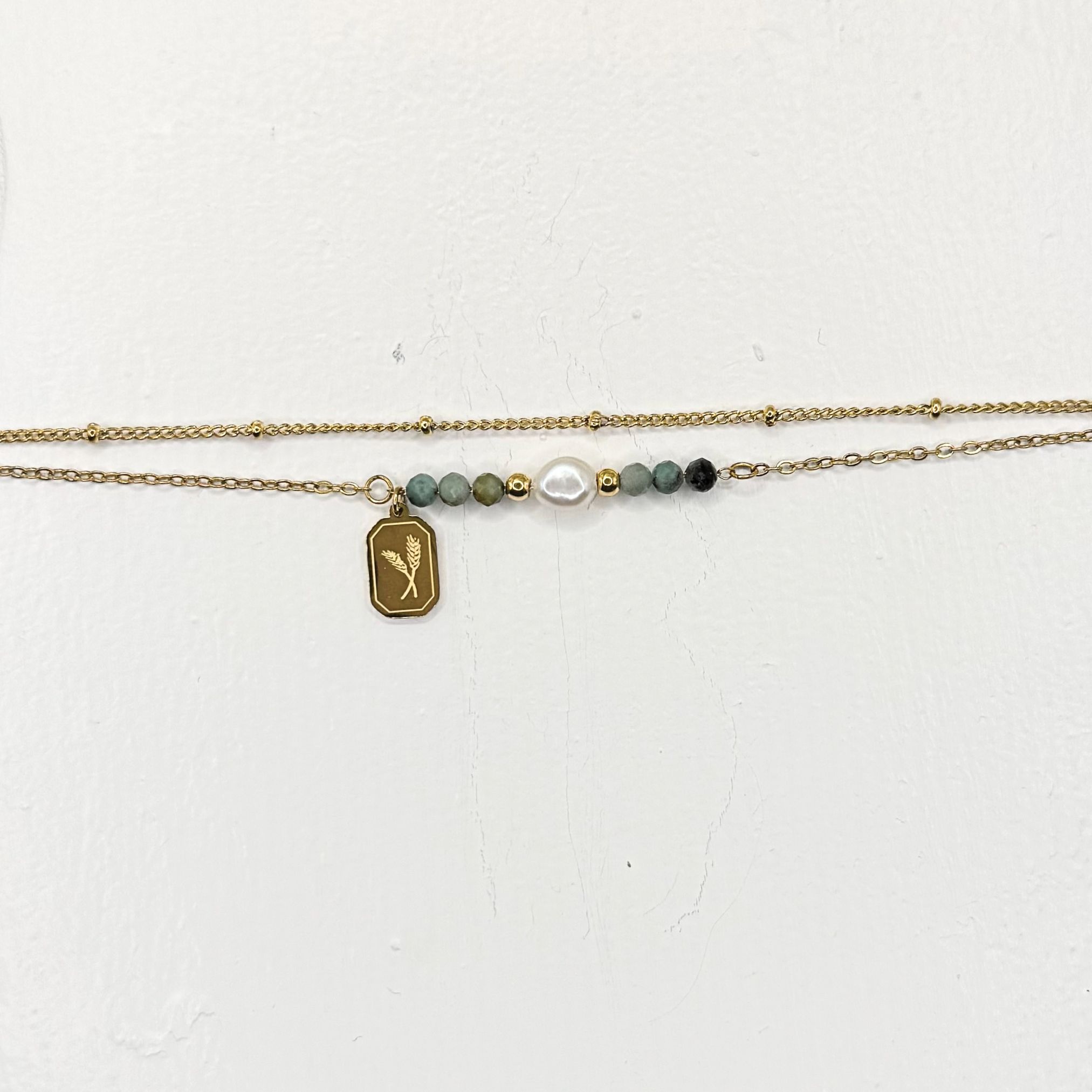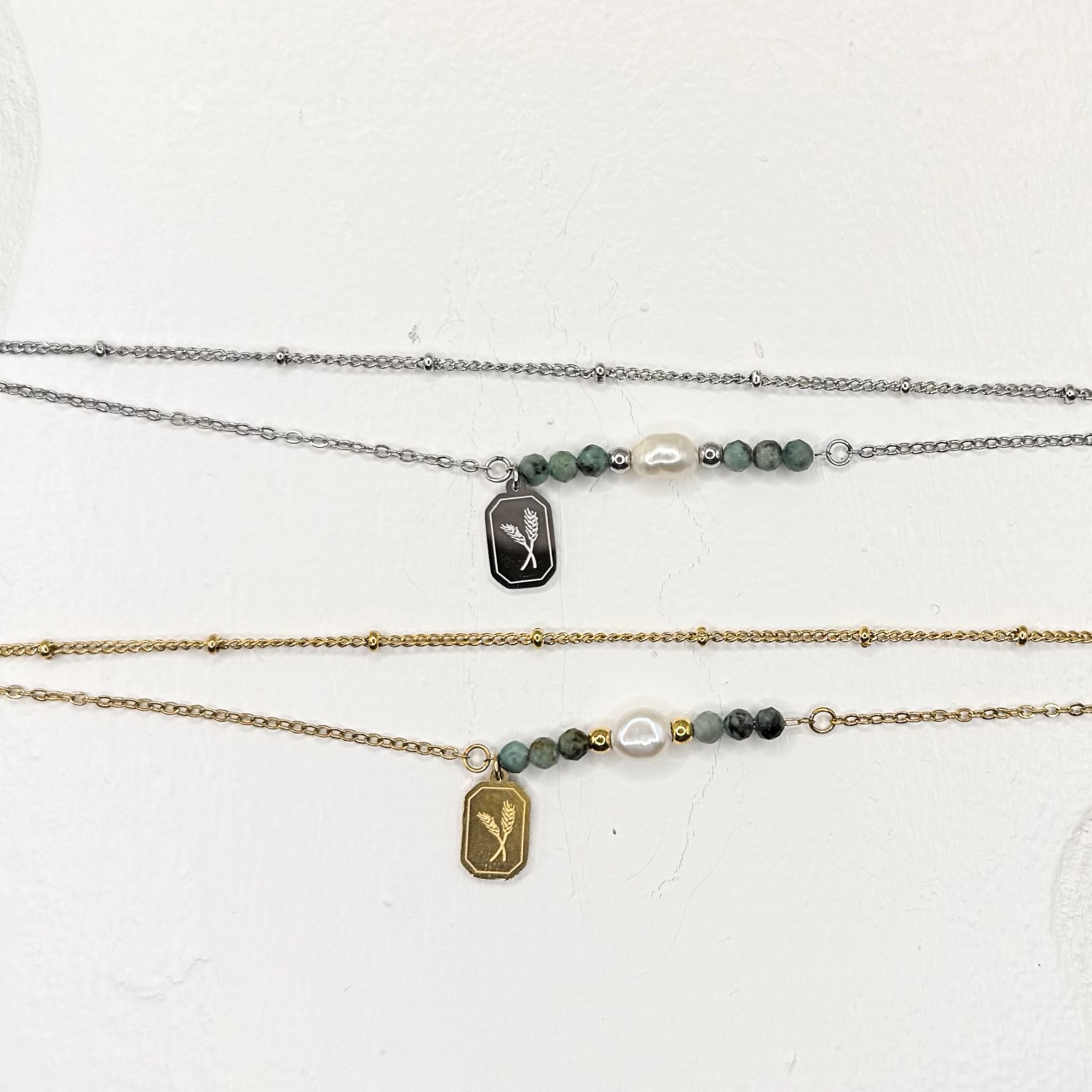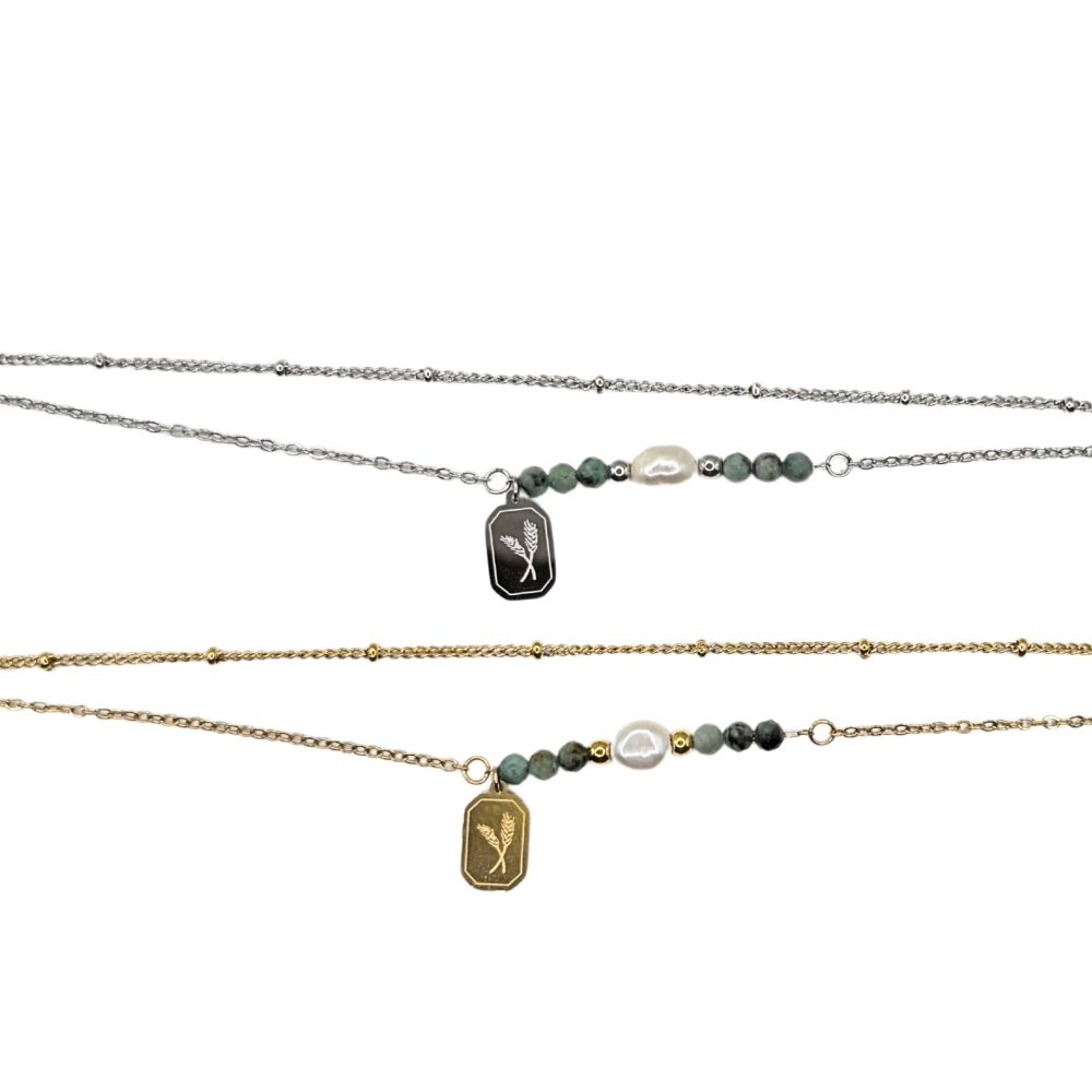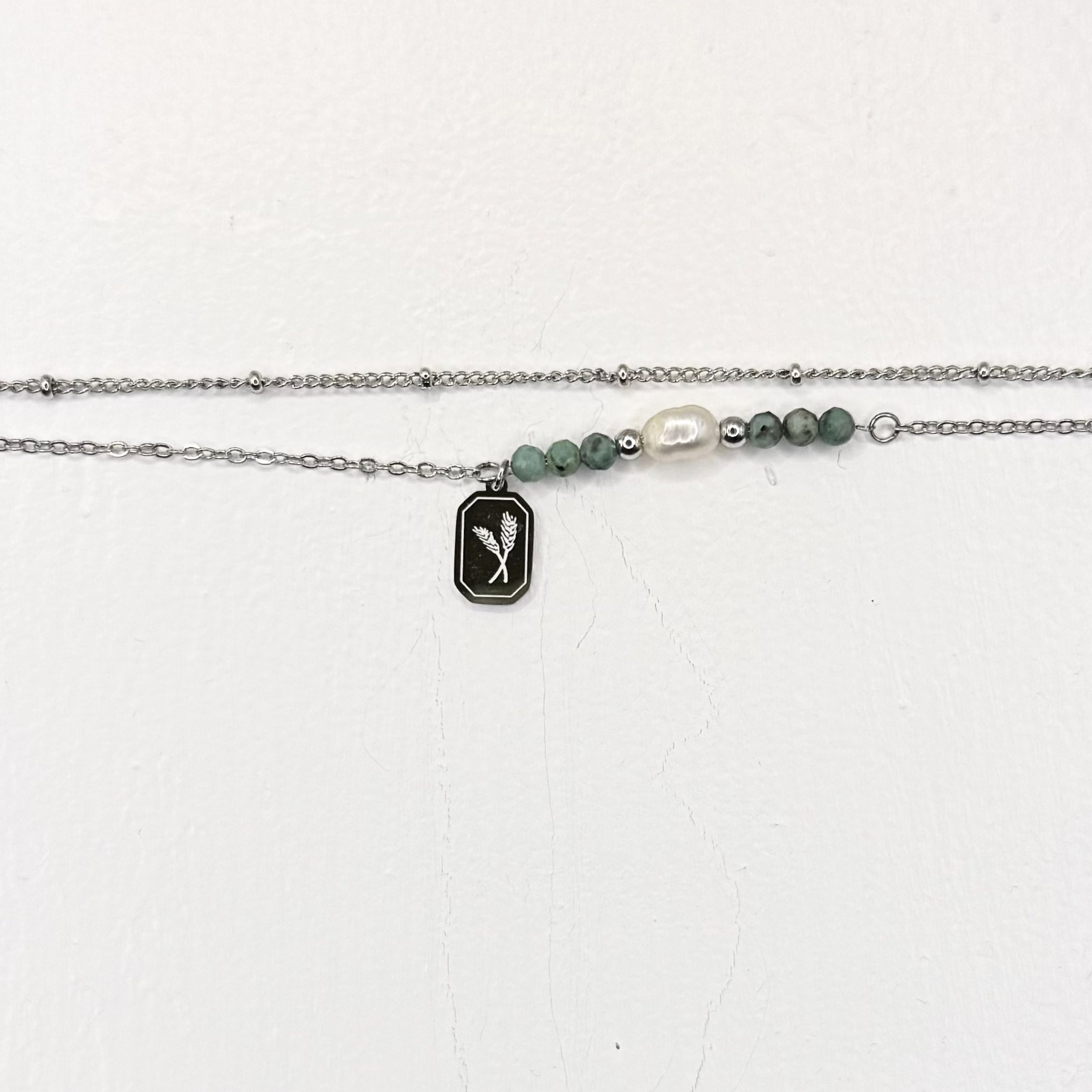 שתי שורות שרשראות עדינות שאחת מהן שזורה באבני חן, פנינה ותליון עם חריטה מקסימה של פרח.