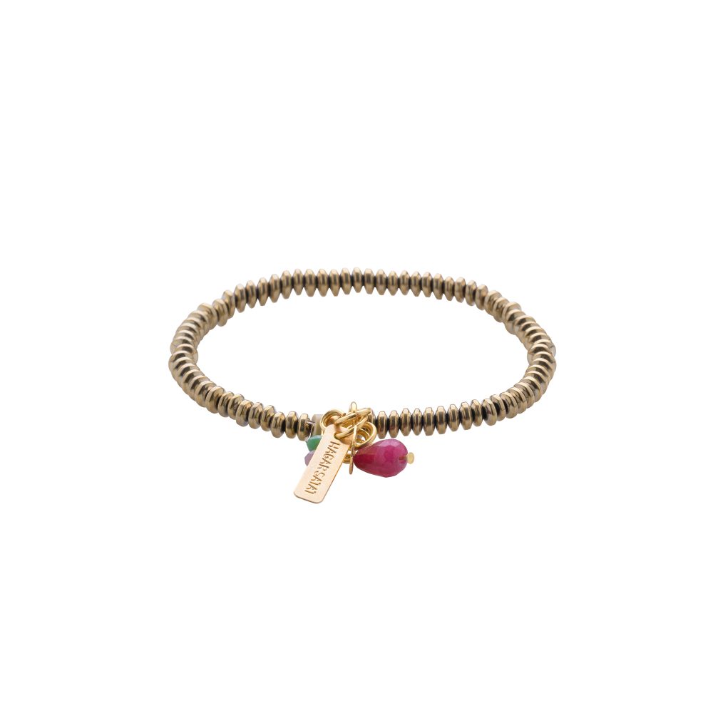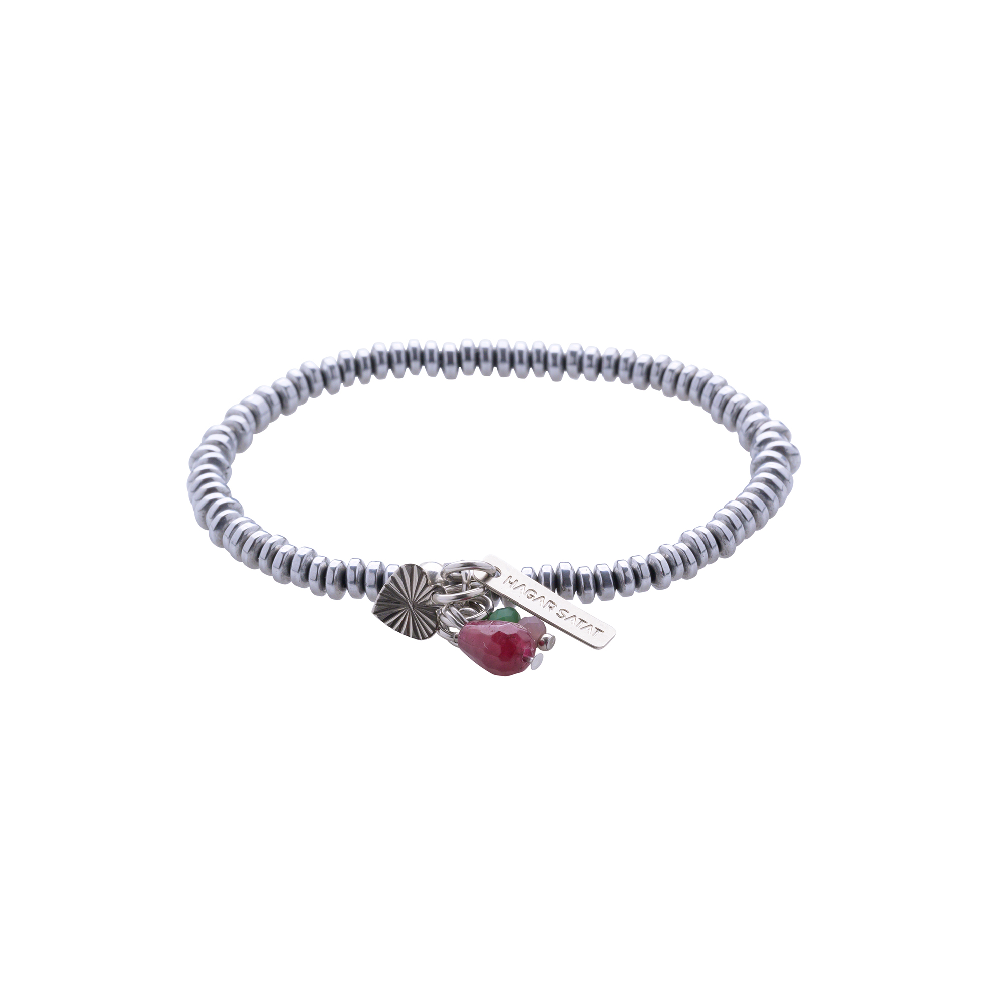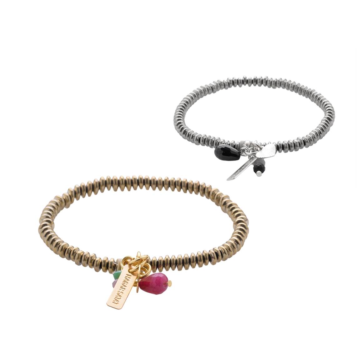 הצמיד עשוי חרוזי המטייט מושחלים על חוט סיליקון משולבים עם צרור תליונים : אבן חן, אבני קריסטל , לב עדין ולוגו. מגיעים בשילוב עם שחור או אדום , בכסף או זהב.
