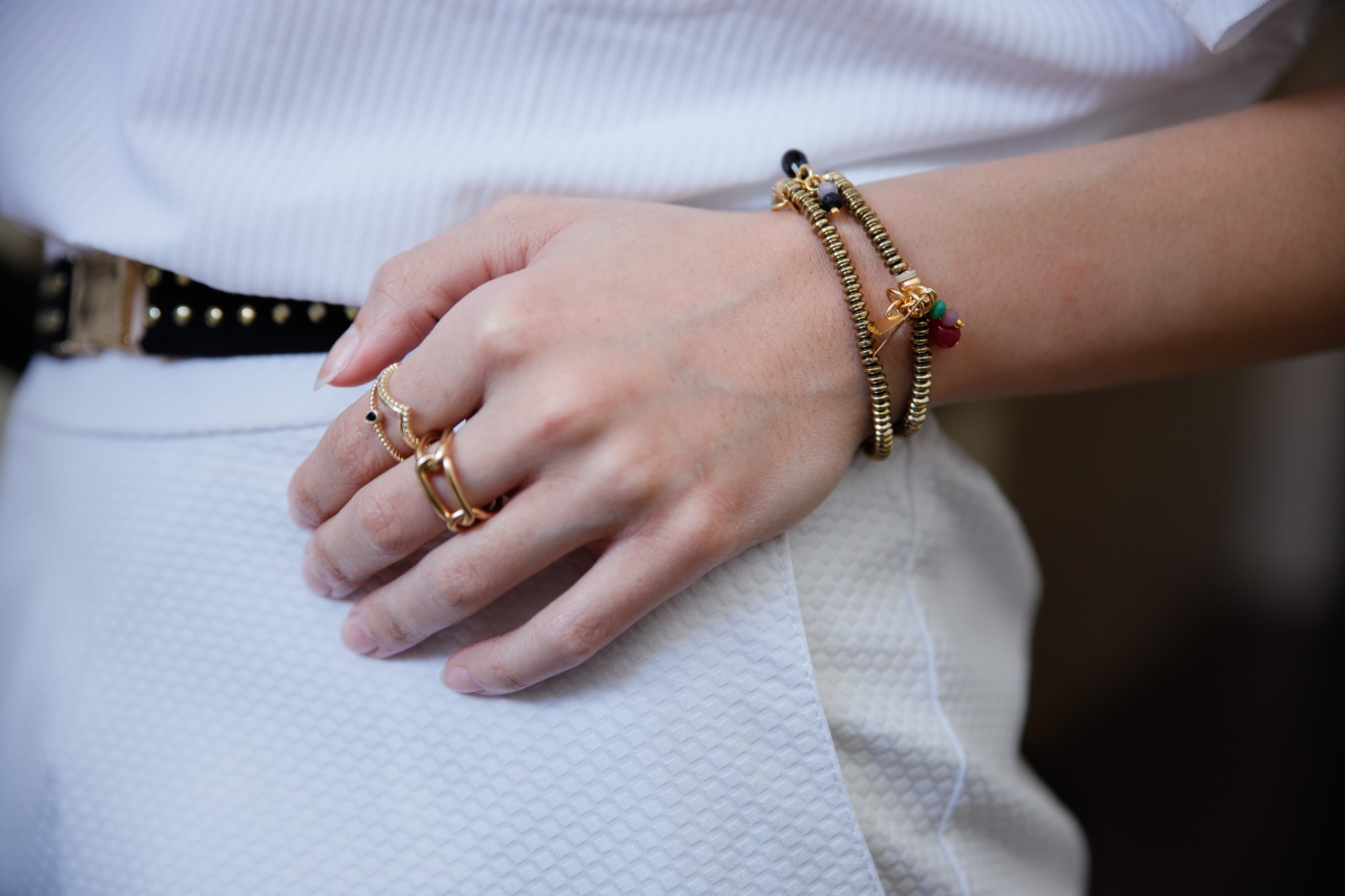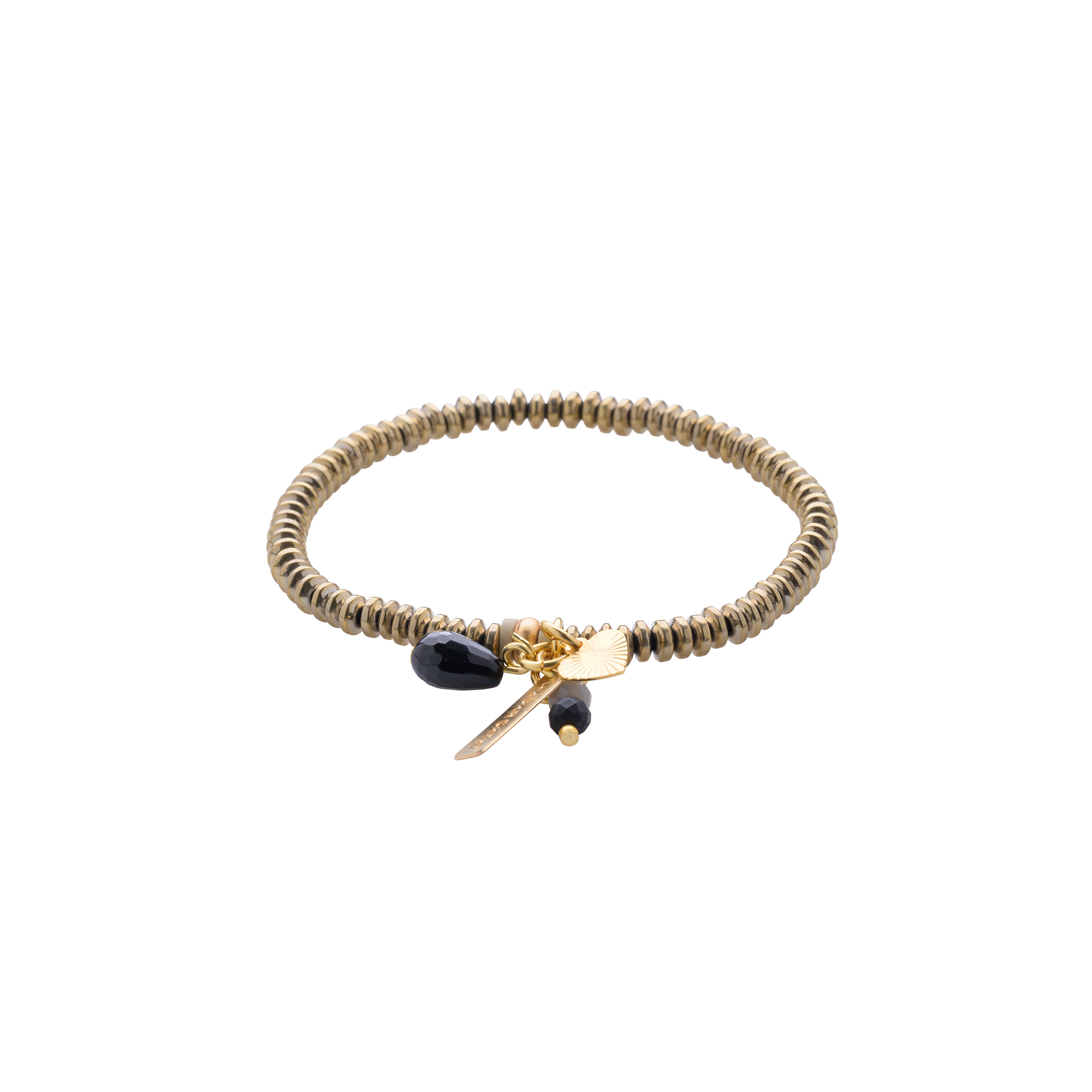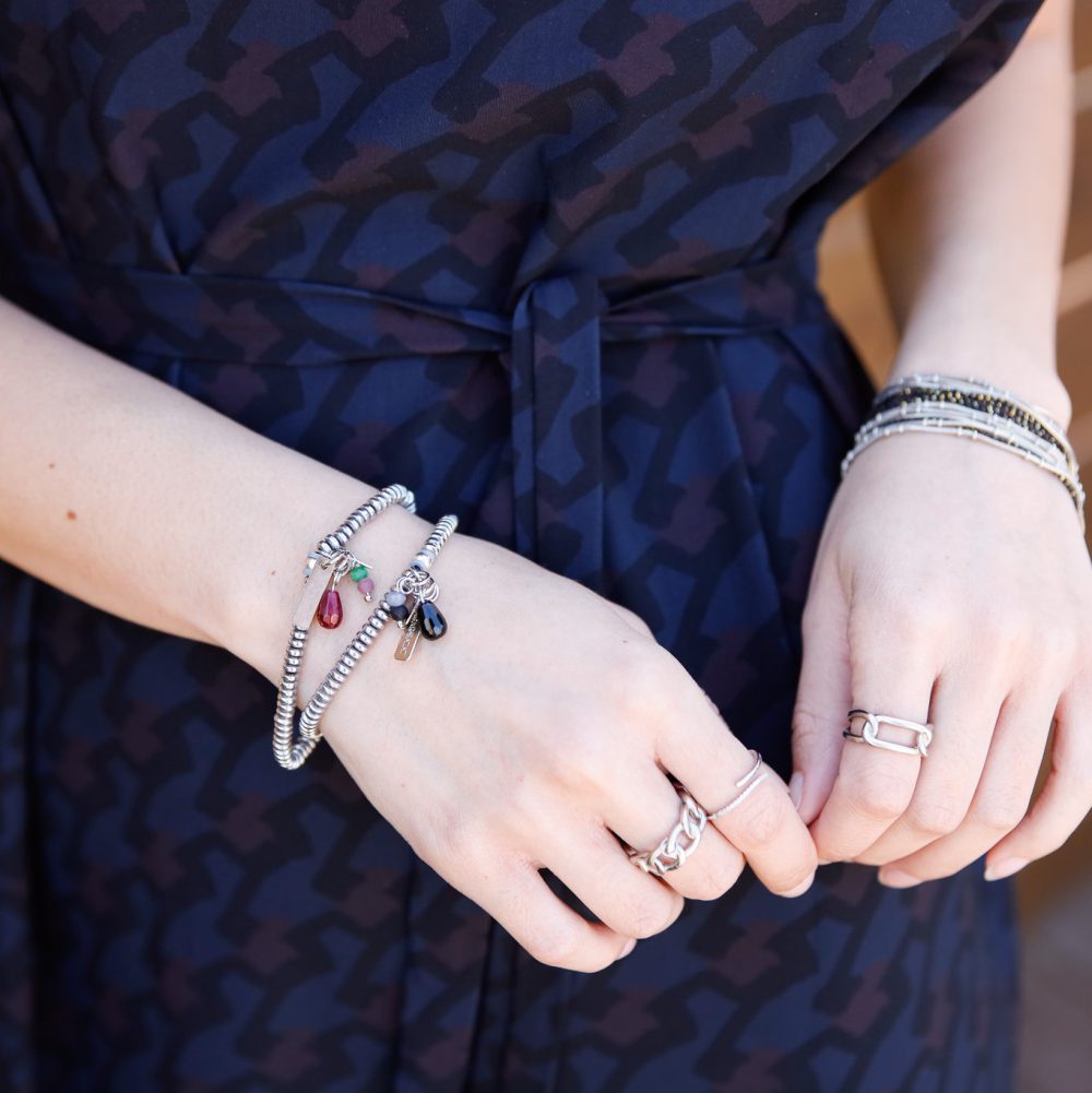 הצמיד עשוי חרוזי המטייט מושחלים על חוט סיליקון משולבים עם צרור תליונים : אבן חן, אבני קריסטל , לב עדין ולוגו. מגיעים בשילוב עם שחור או אדום , בכסף או זהב.