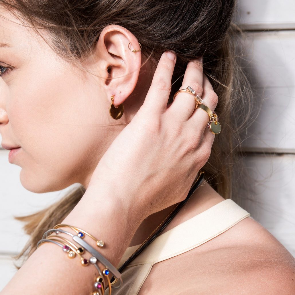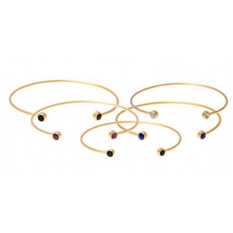 חישוק מתכת עדין מצופה זהב 24 קראט ובקצותיו משובצות אבני זירקוניה בשלל צבעים.