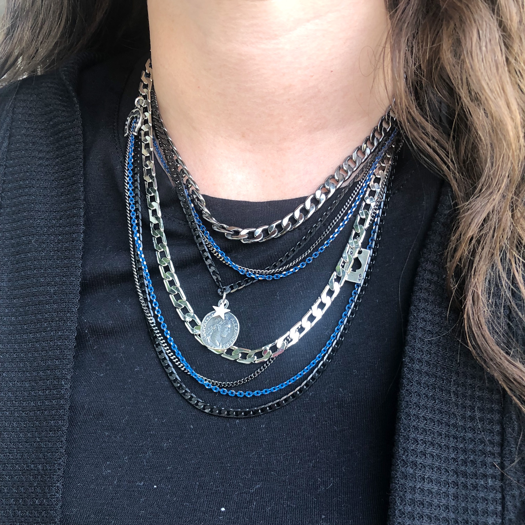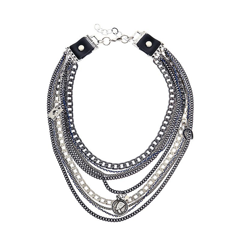 מולטי צ’יין בעיצוב אורבאני עכשווי ומקורי , מחמיאה מאוד ובעלת נוכחות,בשילוב מדליוניי מזל , שרשראות בציפוי כסף , ועור איכותי.
