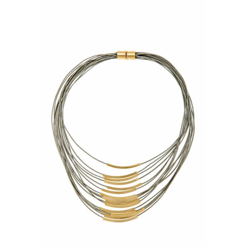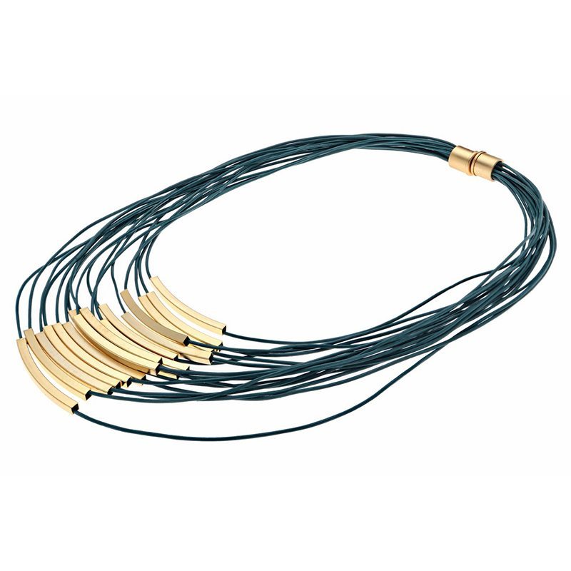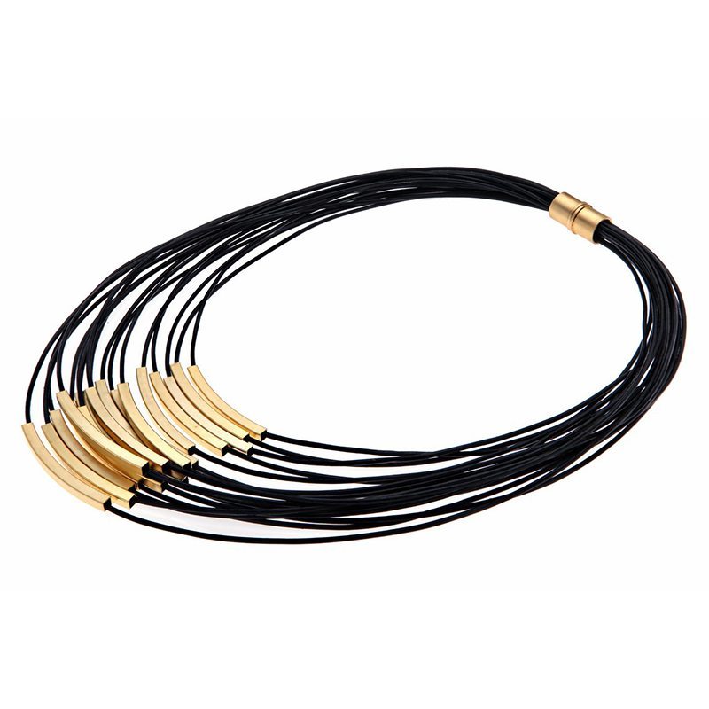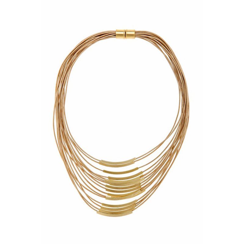 שישה עשר חוטיי עור איכותי מושחלים בצינורות מתכת מלבניים מצופים זהב 24 קראט . סוגר מגנט חזק ונוח לענידה, גם הוא מצופה זהב