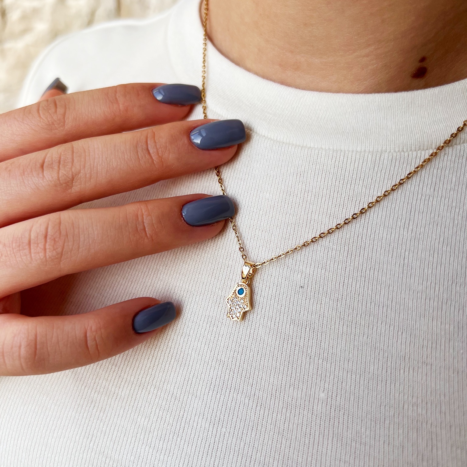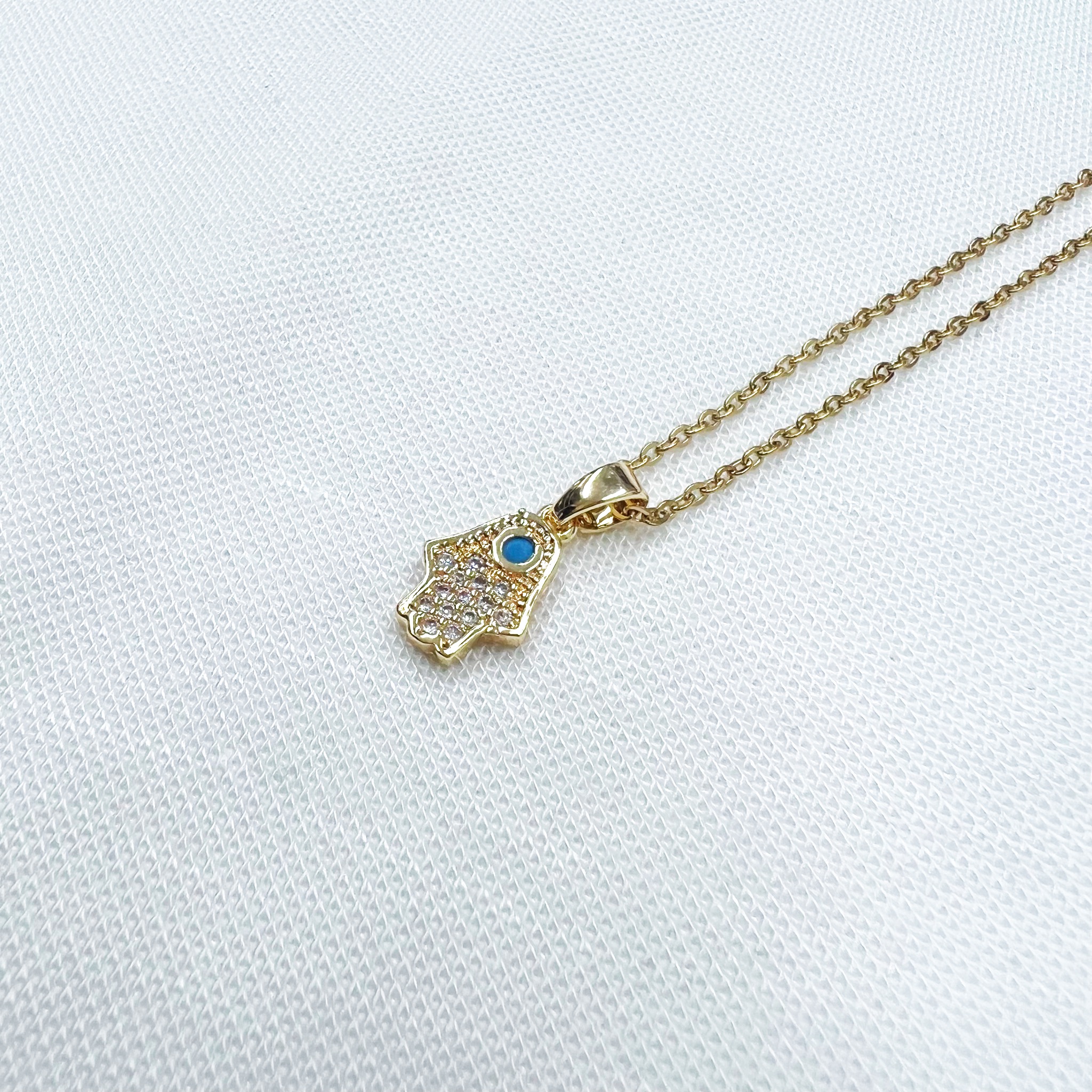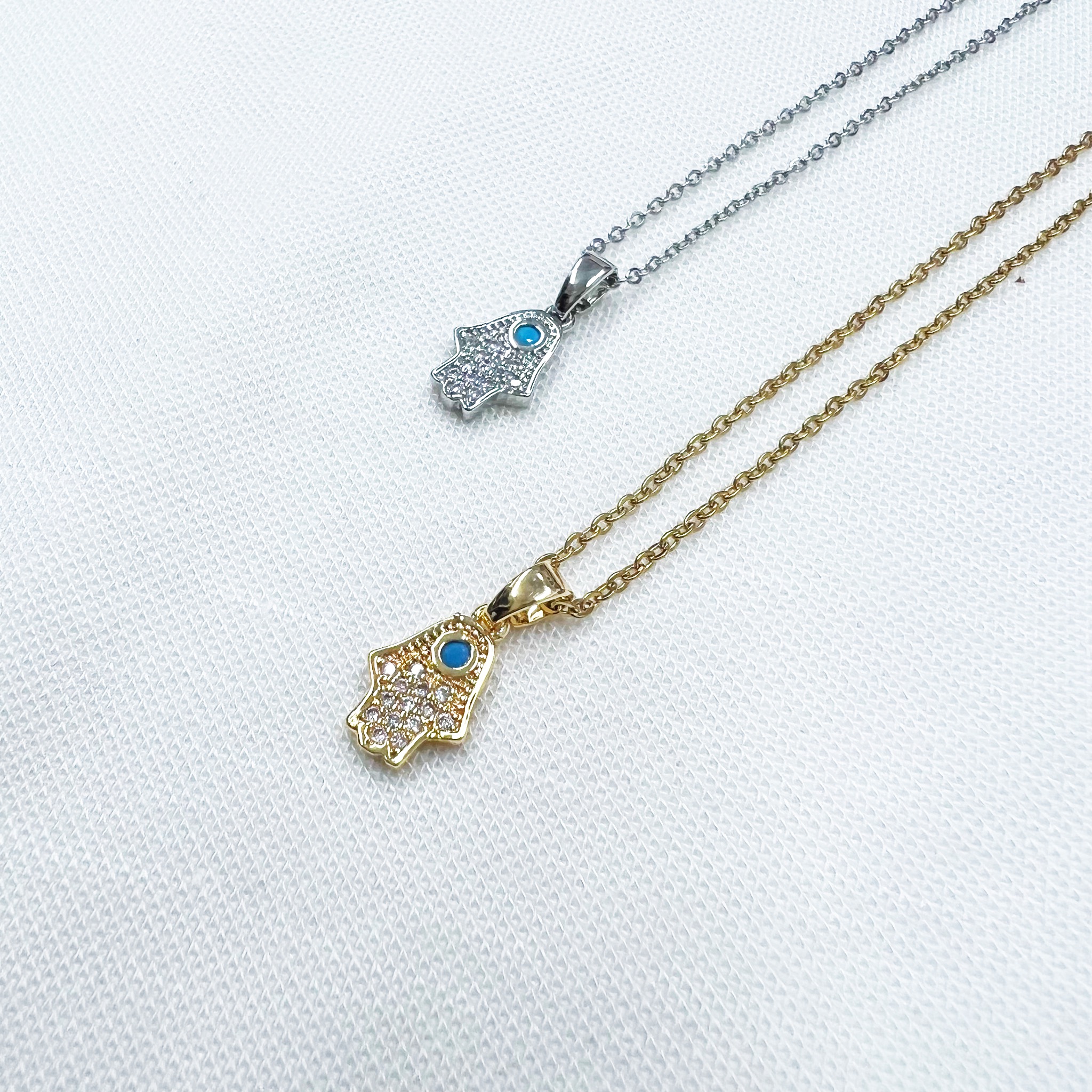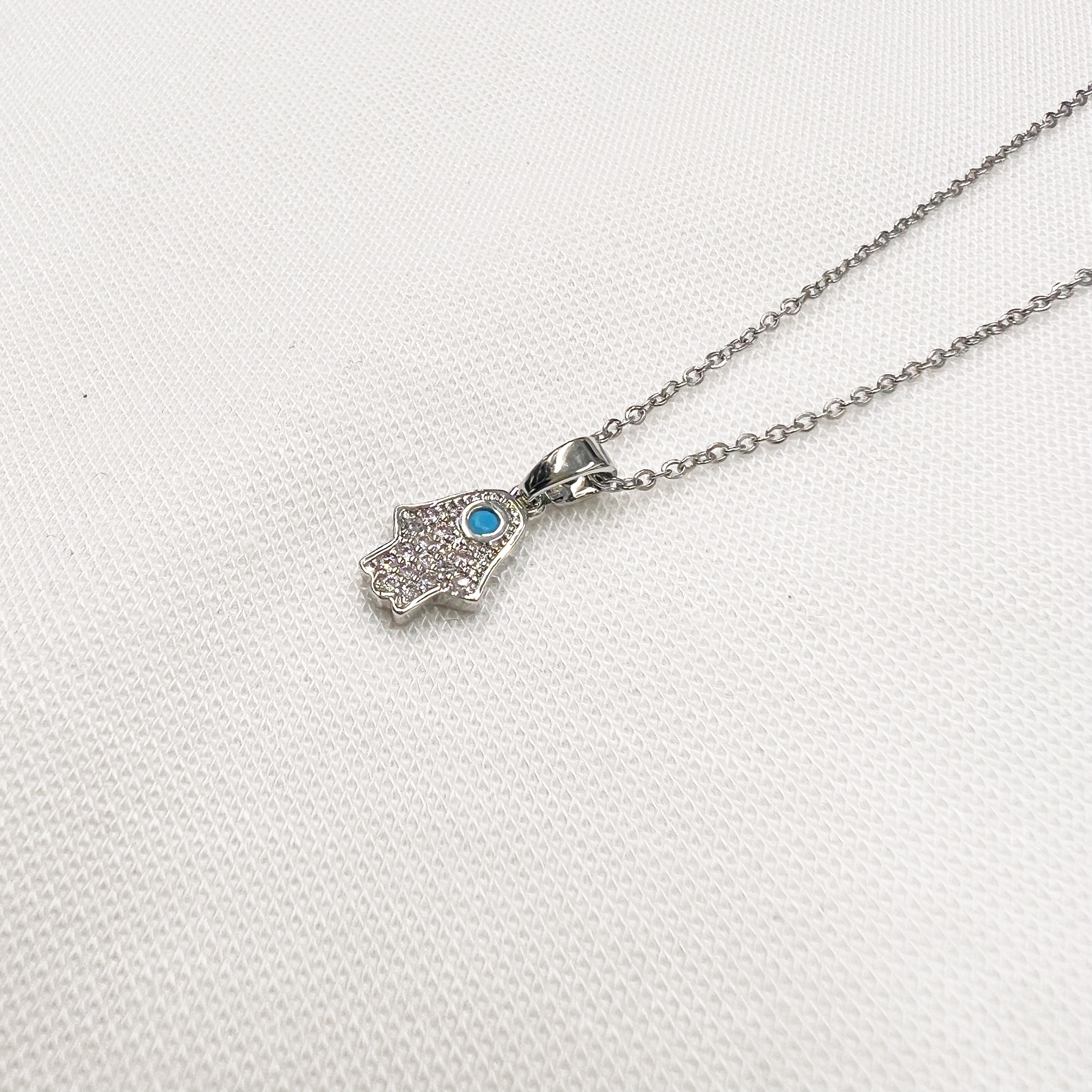 שרשרת עדינה עשויה סטיינלס סטיל עמיד ואיכותי עם תליון חמסה משובץ אבני קריסטל עדינות ואבן טורקיז אחת.
