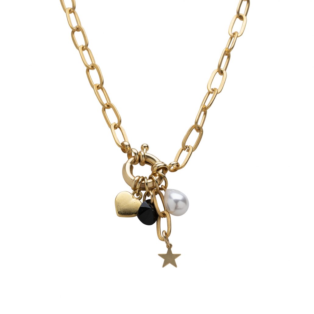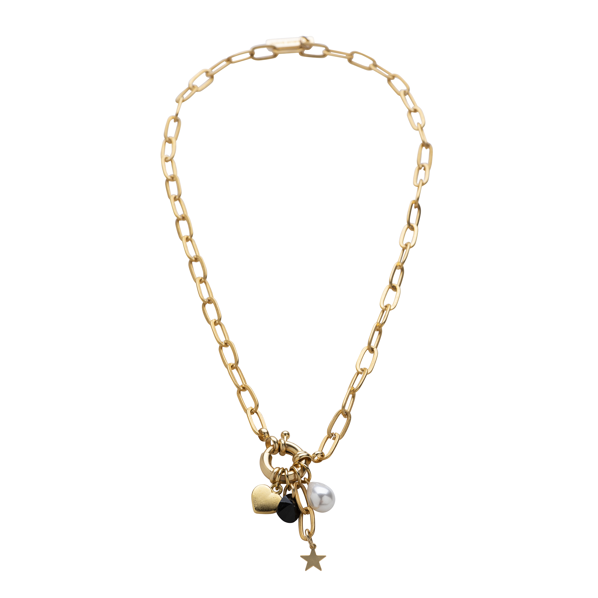 שרשרת חוליות עדינה עם סוגר מיוחד שנסגר מקדימה משולב עם מקבץ תליונים משגעים.
