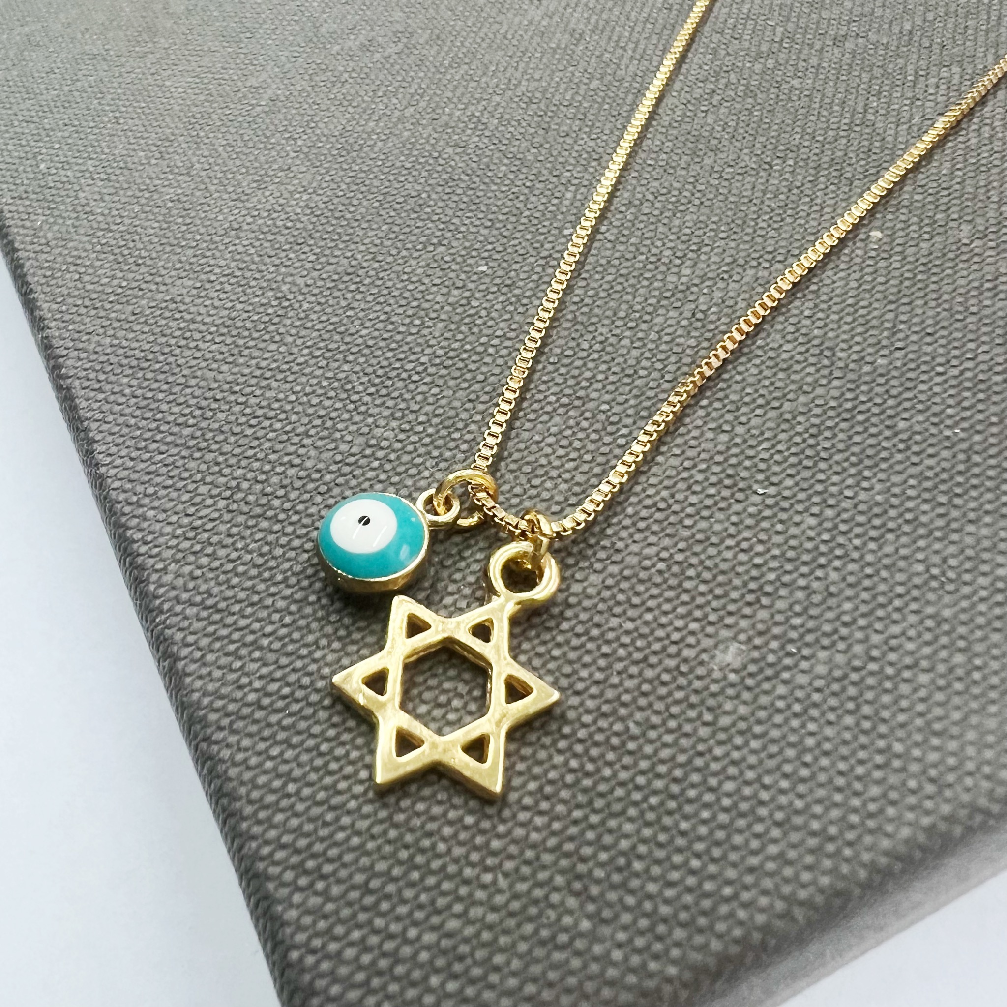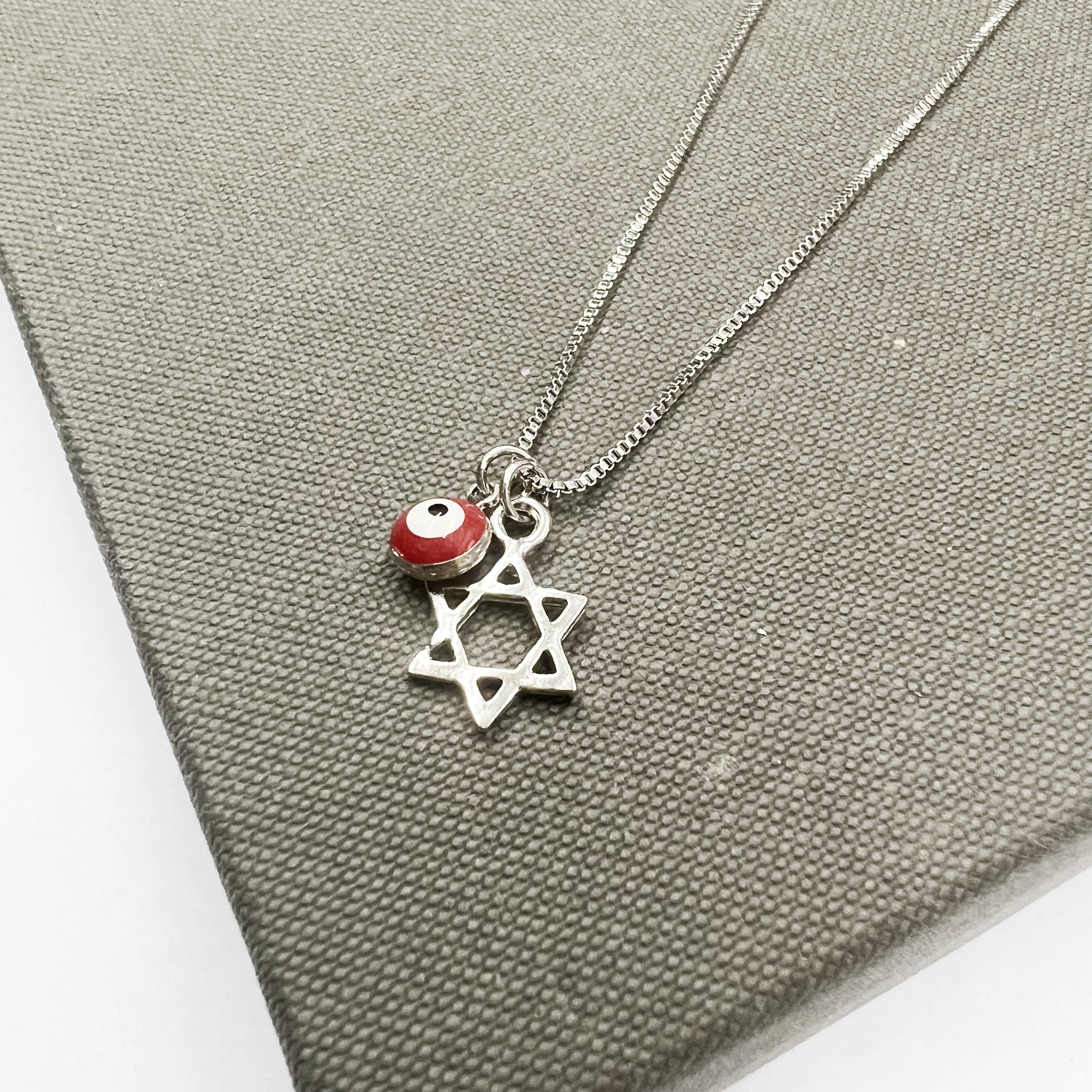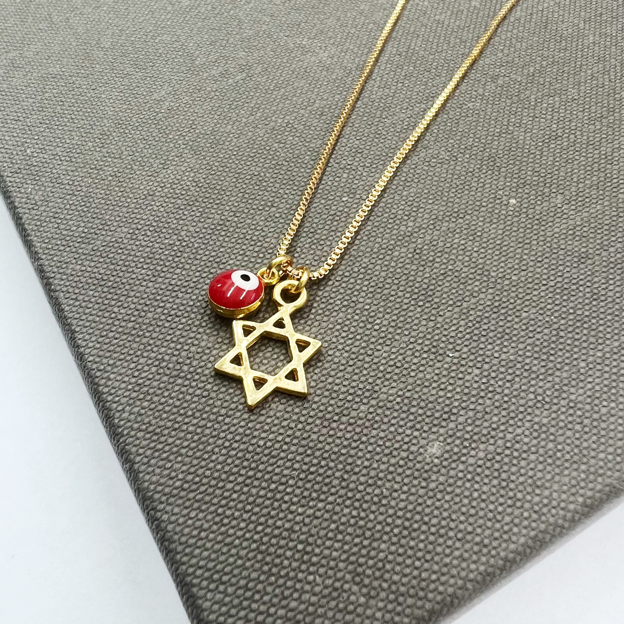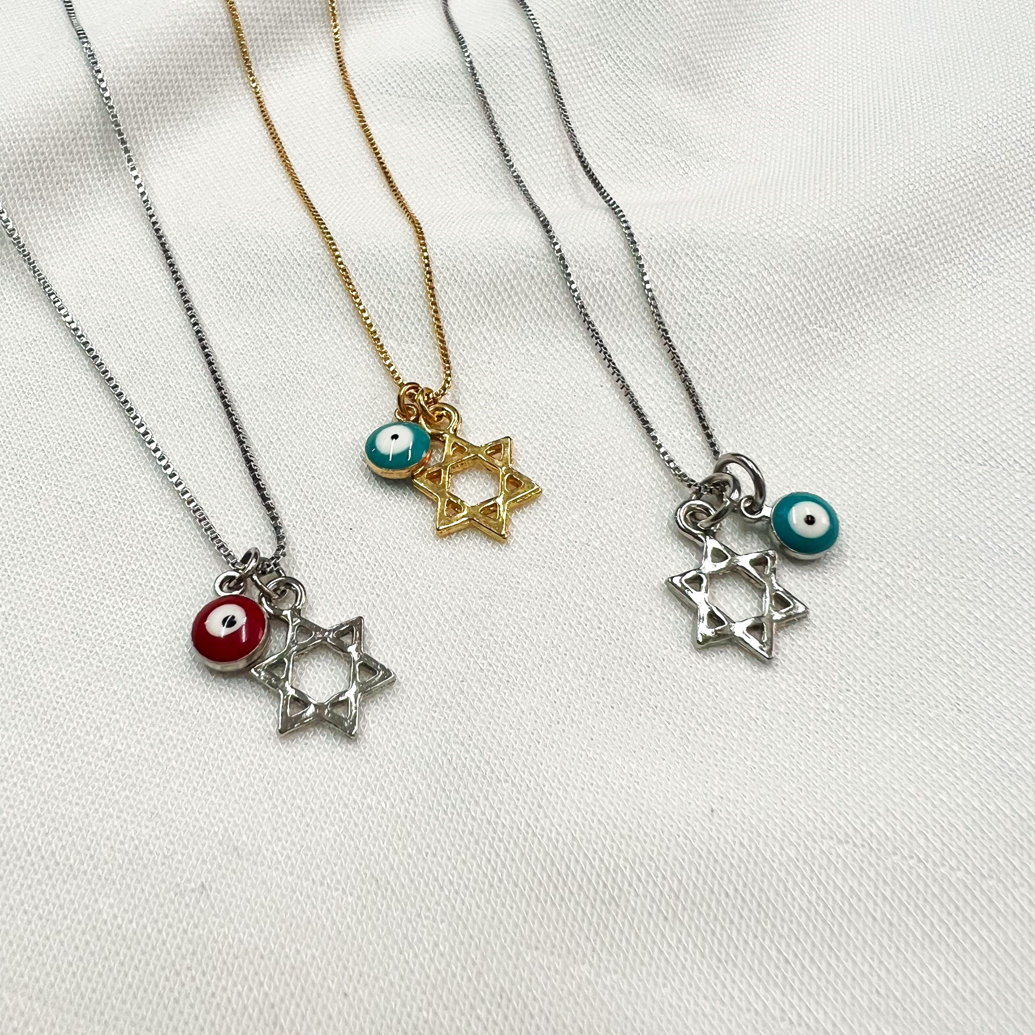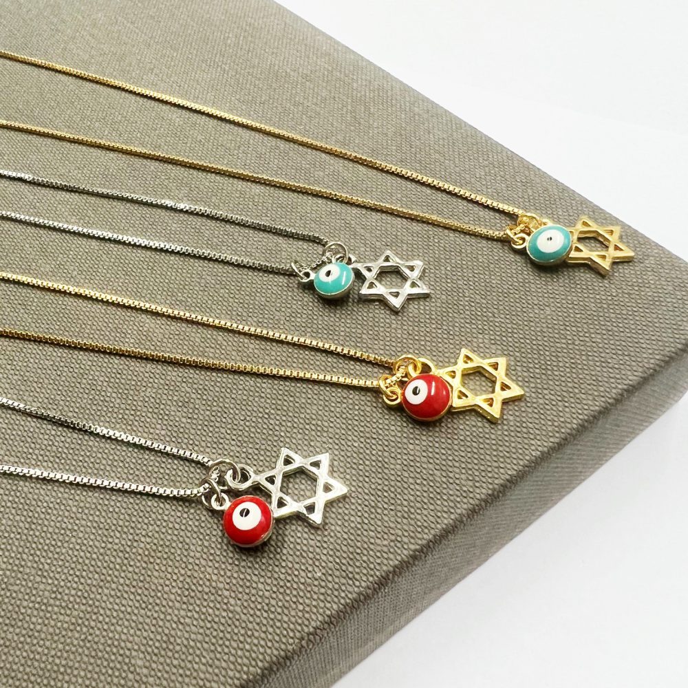 עשויה שרשרת עדינה בציפוי זהב 24 קראט או בציפוי כסוף משולבת עם תליון מגן דוד עדין ויפה בשילוב עין בצבע טורקיז או אדום לבחירה.