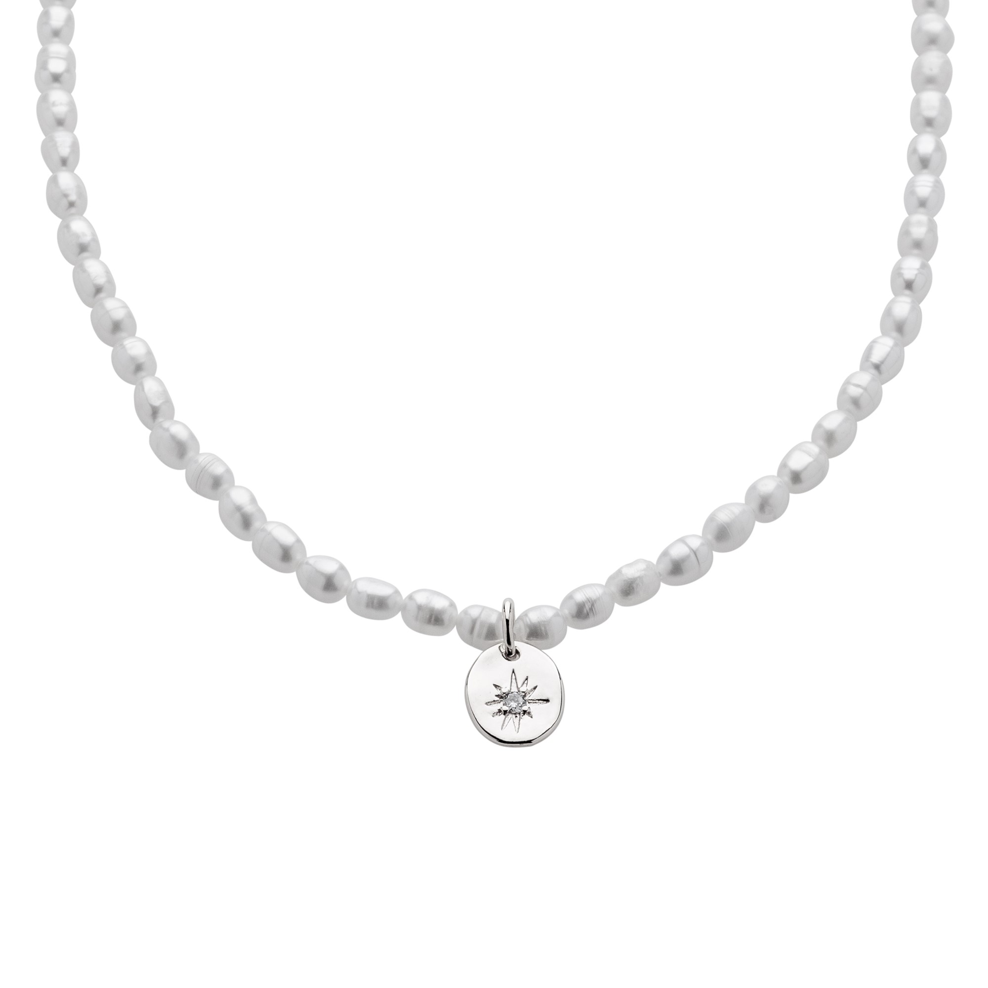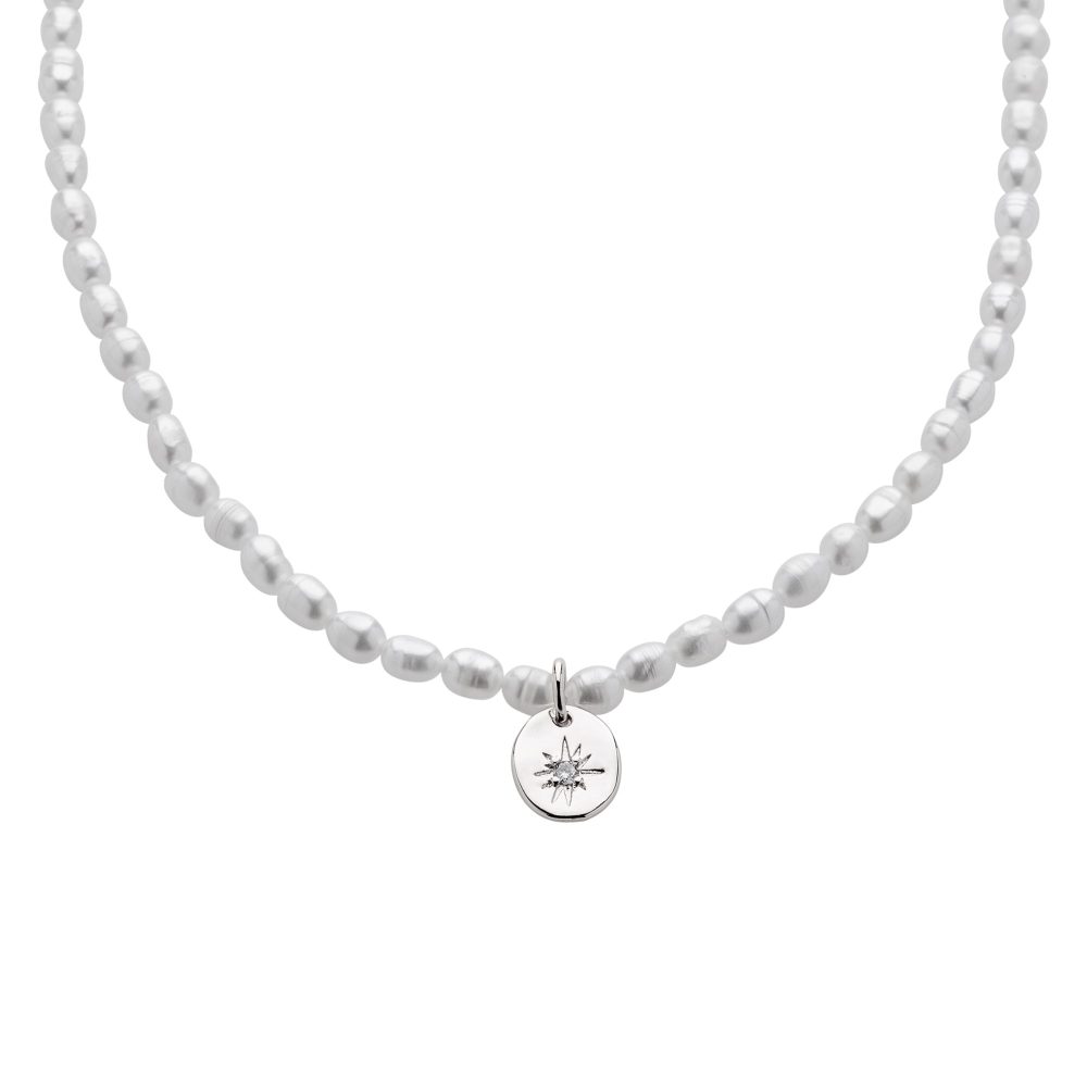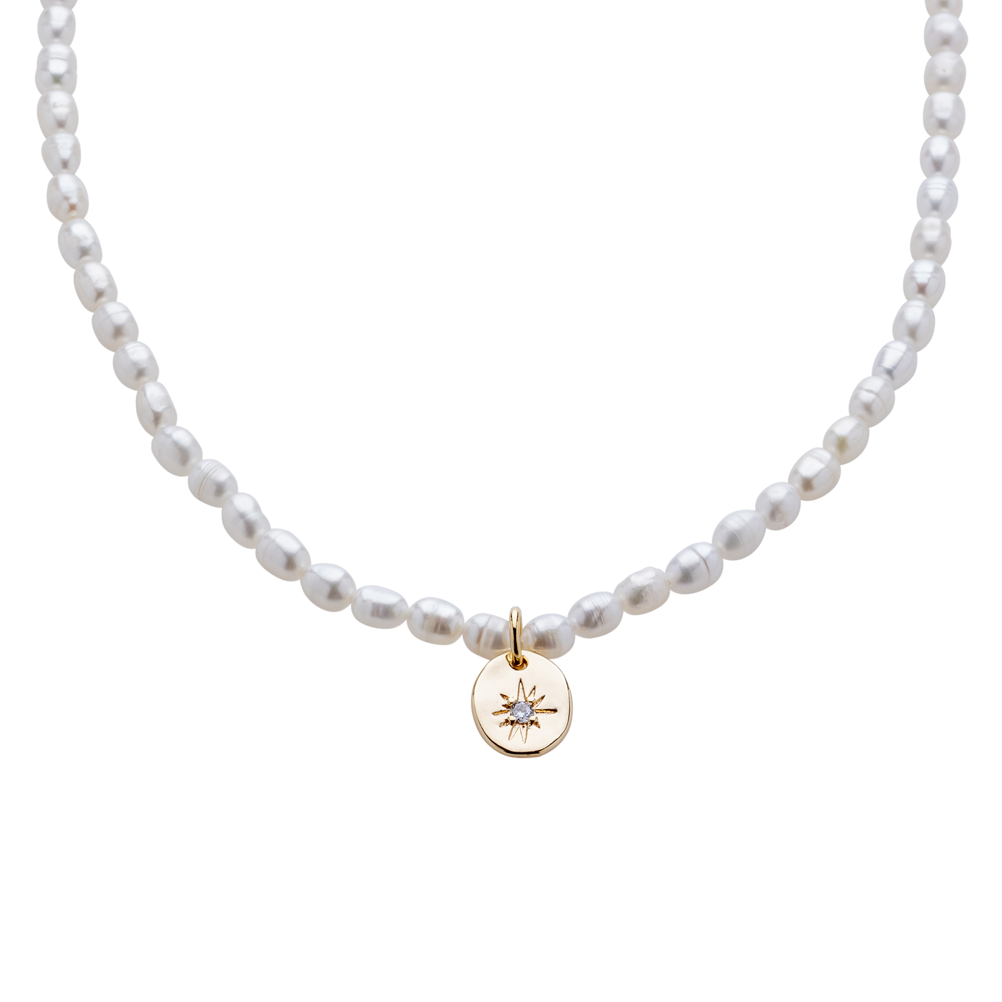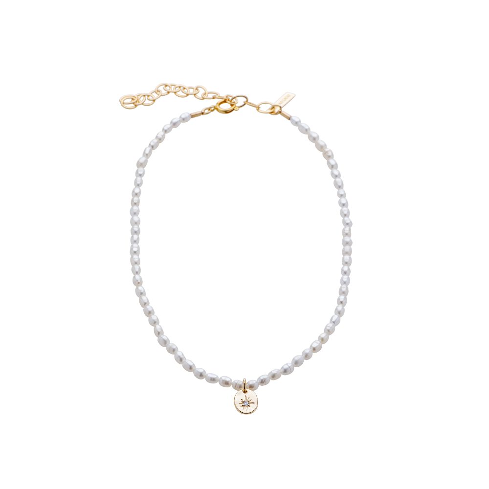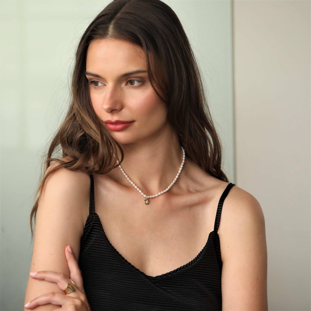 השרשרת עשויה פנינים איכותיות מושחלות על חוט איכותי בשילוב תליון אובל אמורפי עם שיבוץ אבן קריסטל עדינה בציפוי זהב 24 קראט בגוון מט או בציפוי כסוף בגוון מט.