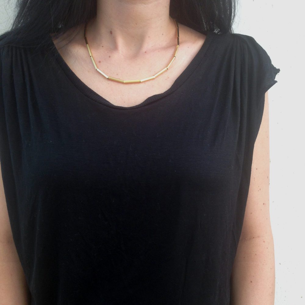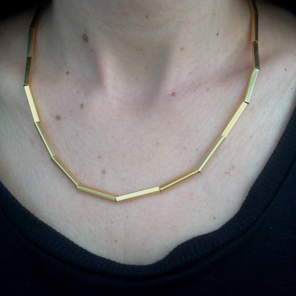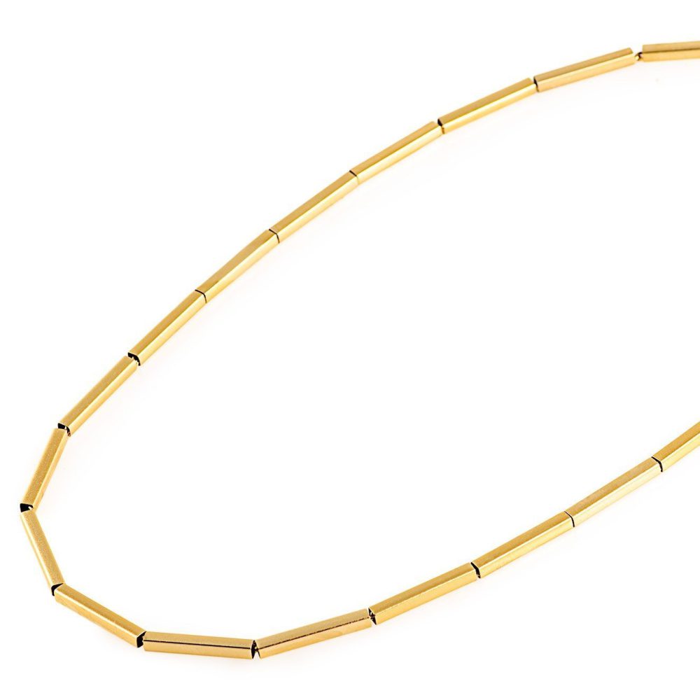 צינורות מוארכים המושחלים על שרשרת גורמט עדינה הכל מצופה זהב 24 קראט.