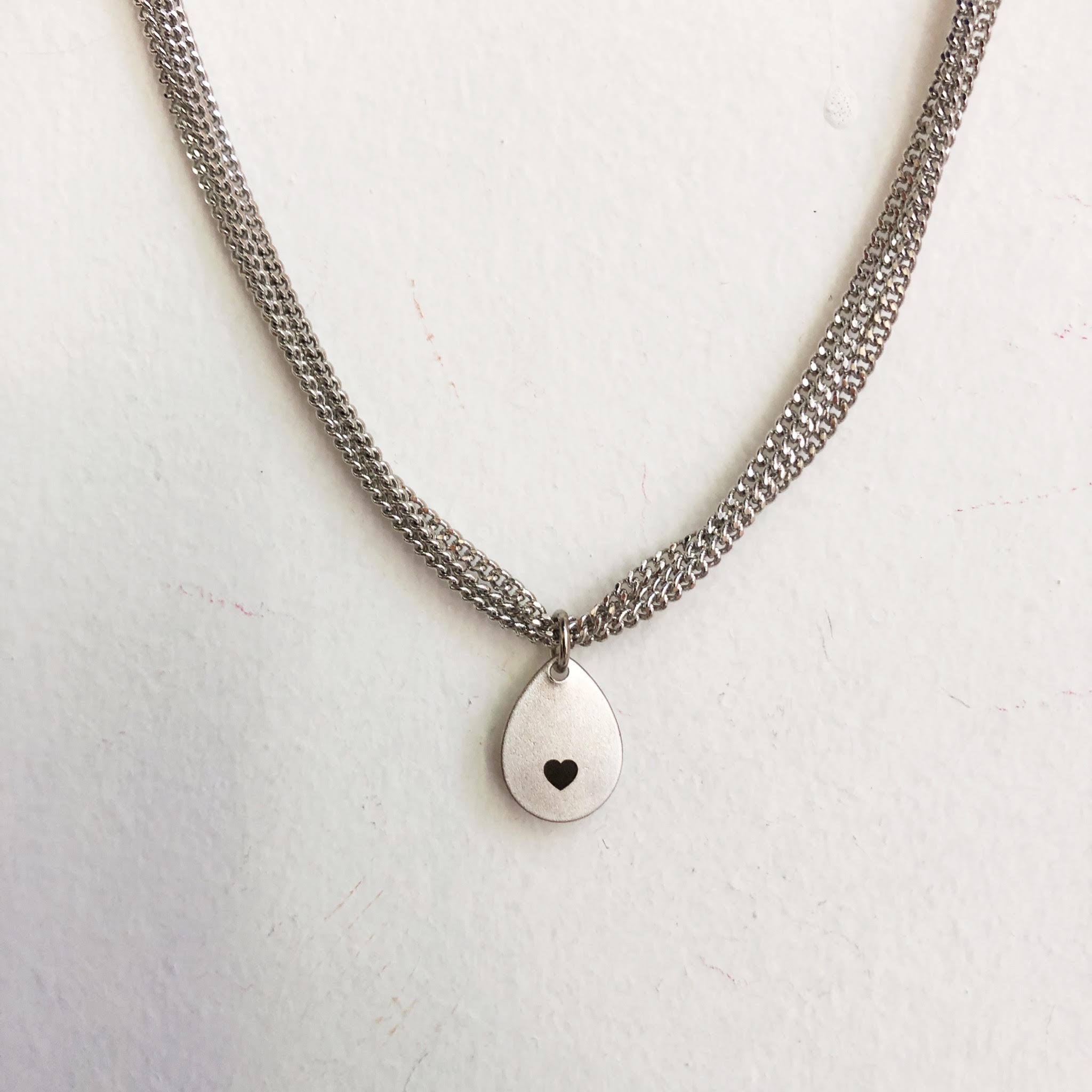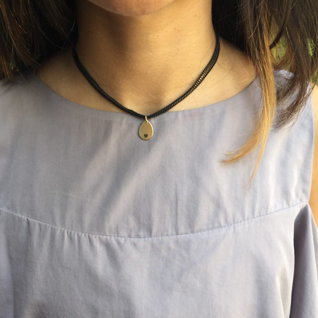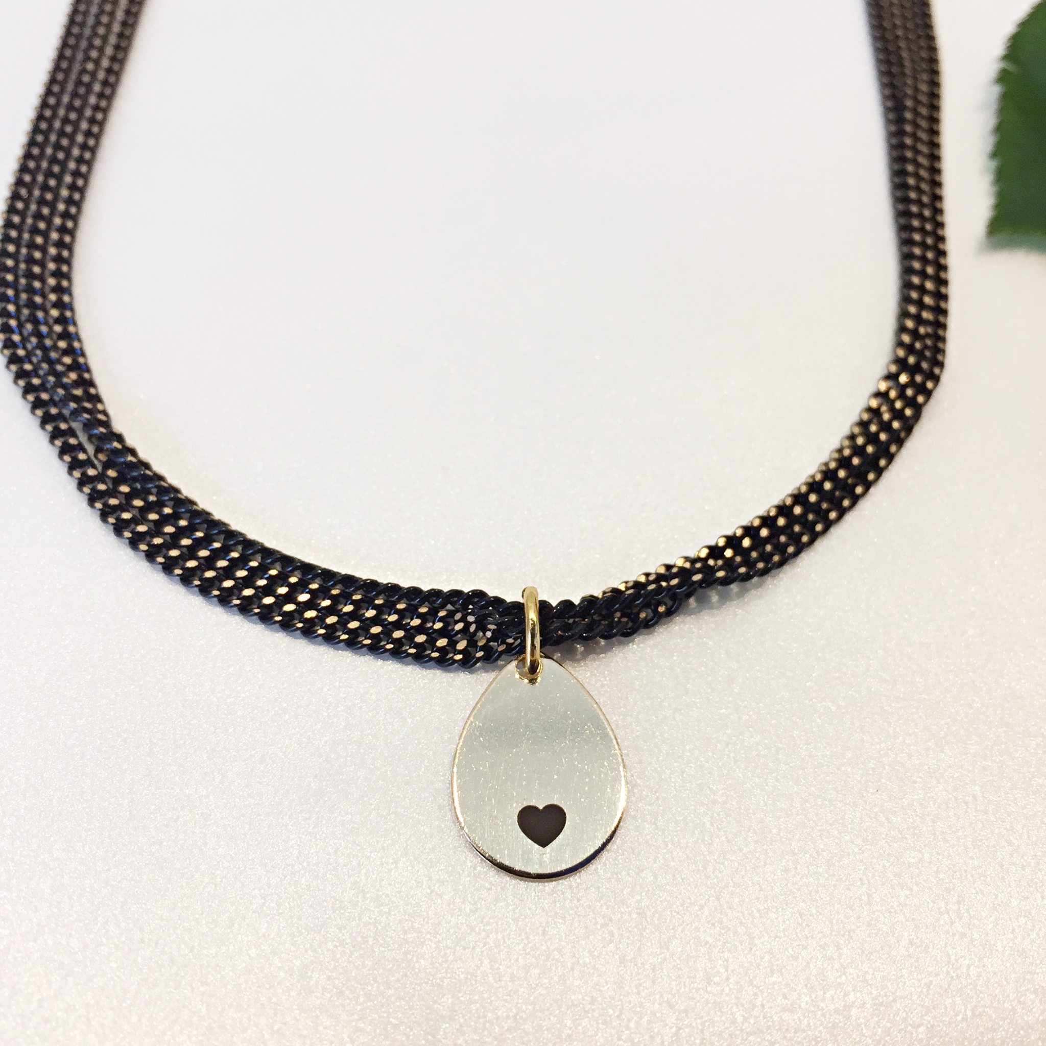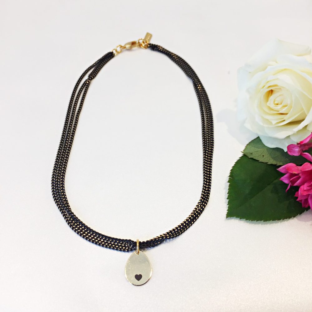 השרשרת עשויה שרשראות דיסקית מושחרות ועליהן תלויה טיפה בציפוי זהב